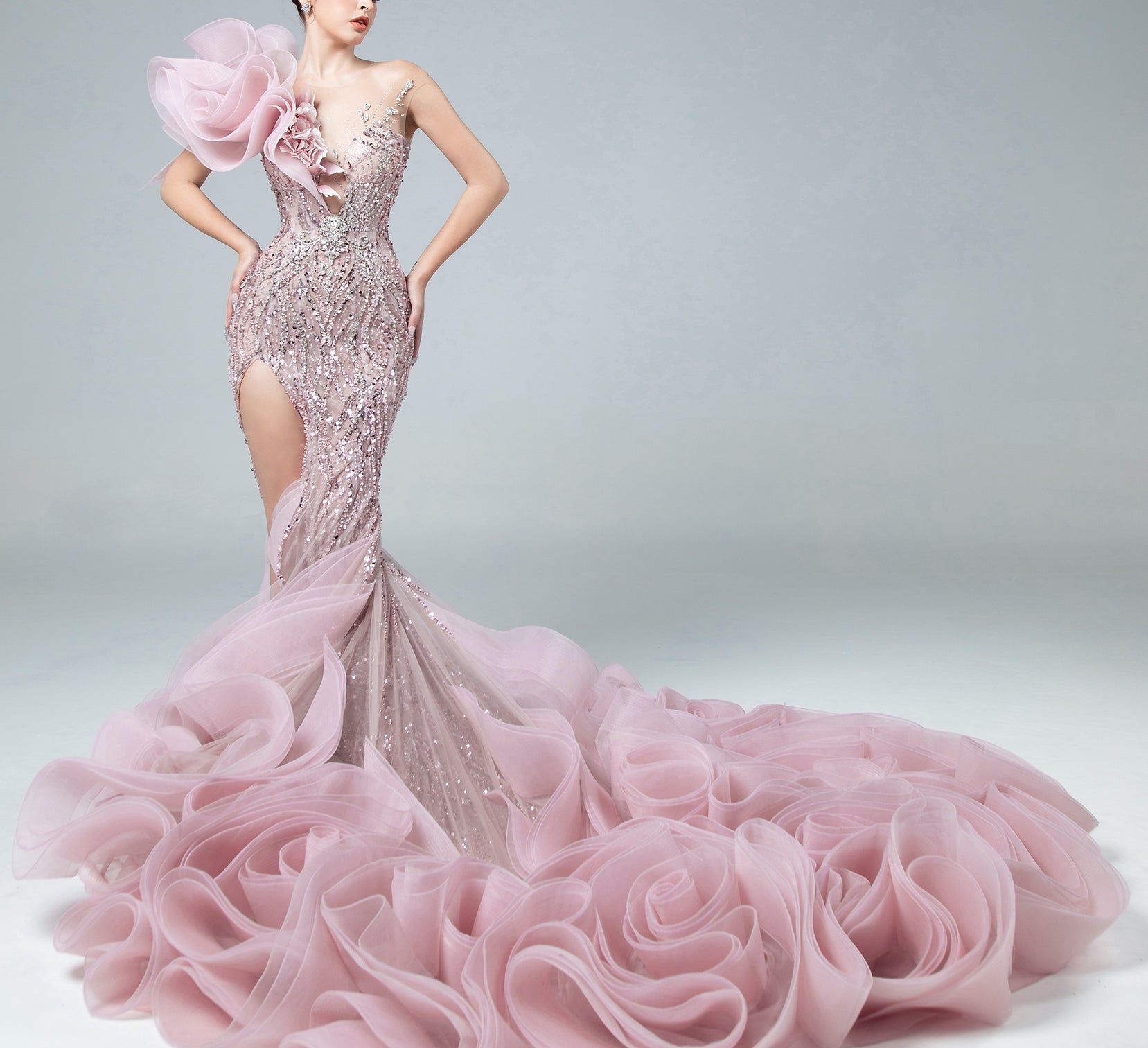 • Silhouette: Mermaid Bodice High Slit With Ruffled Organza Train
