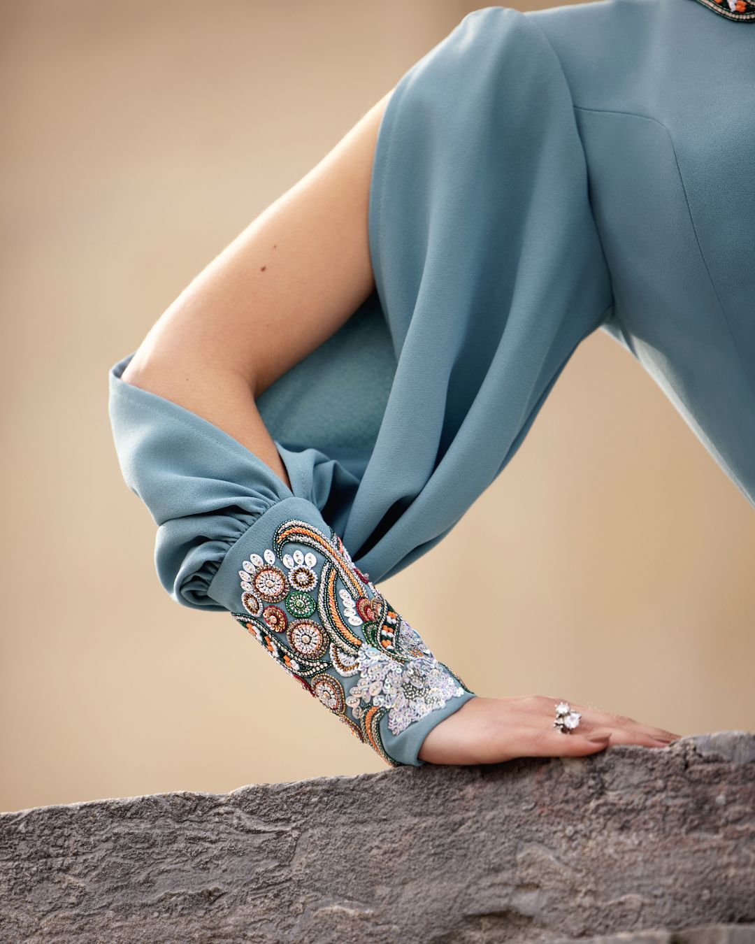 Crafted from luxurious silk, this gown has a flattering A-line silhouette with bishop sleeves, embellished with delicate beadwork. The dress is perfect for formal events, promising an elegant and comfortable fit for unforgettable moments.