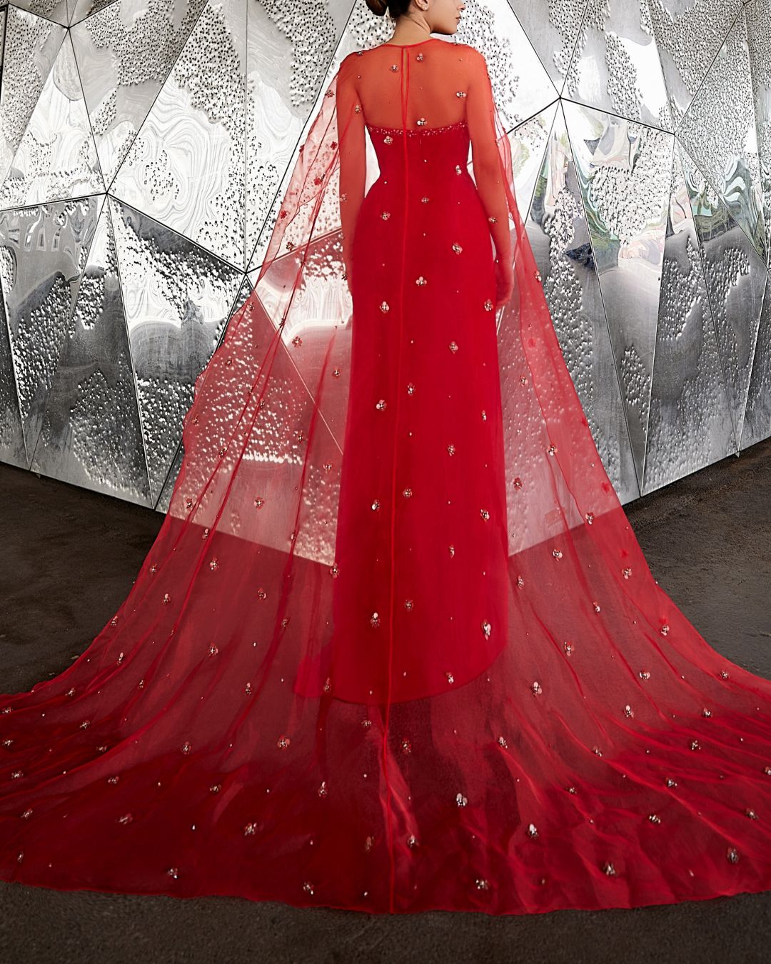 Crafted from luxurious scarlet silk, this gown features a figure-flattering silhouette. Meticulously embellished with delicate beadwork on the bodice and flowing cape, it exudes timeless elegance. Perfect for grand galas and red carpet events, this dress ensures a flawless fit and unforgettable entrance.