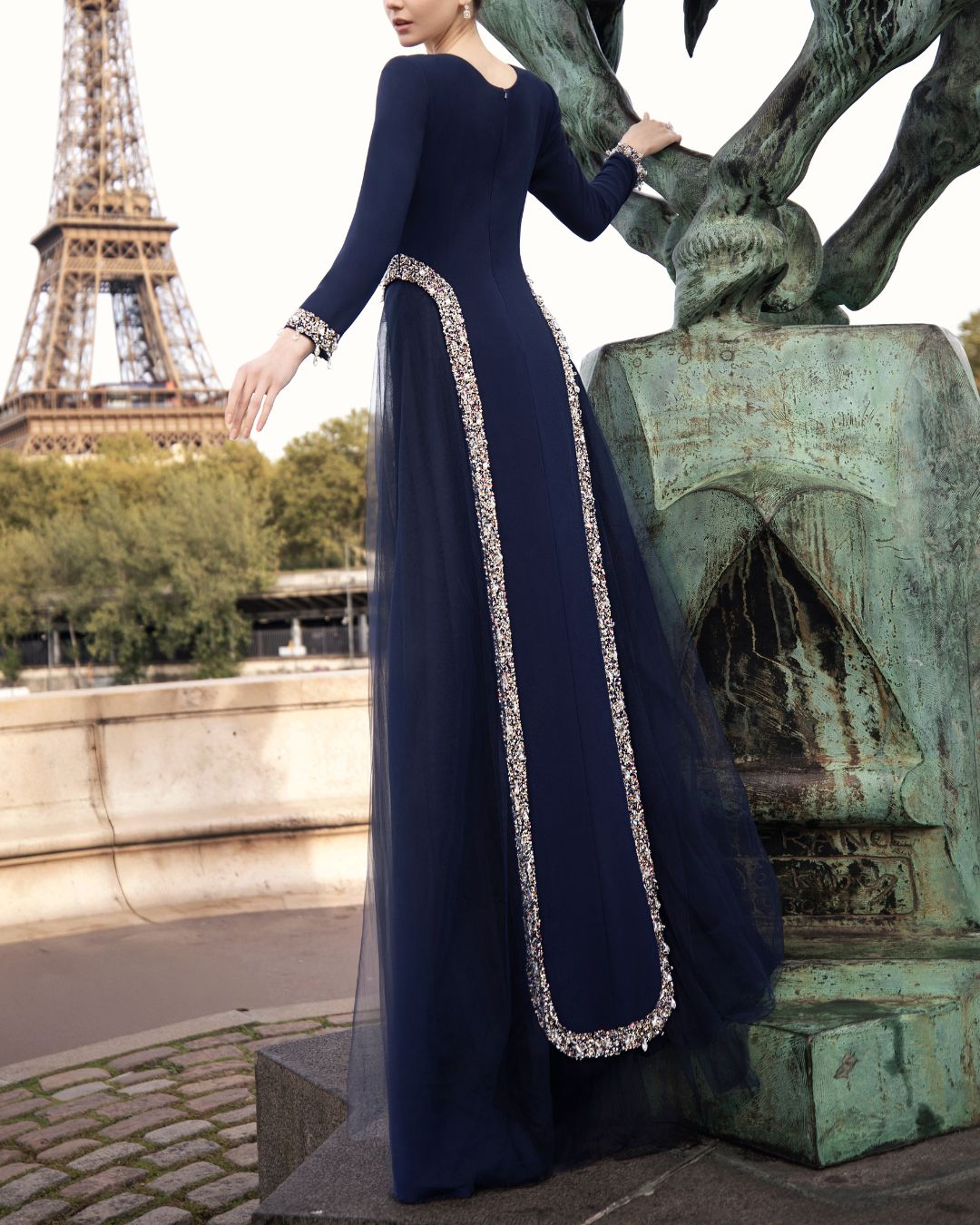 Crafted in luxurious silk and tulle, this navy gown features an A-line silhouette and exquisite embellishments. The fitted bodice and flowing skirt create an elegant look, perfect for galas and special occasions.