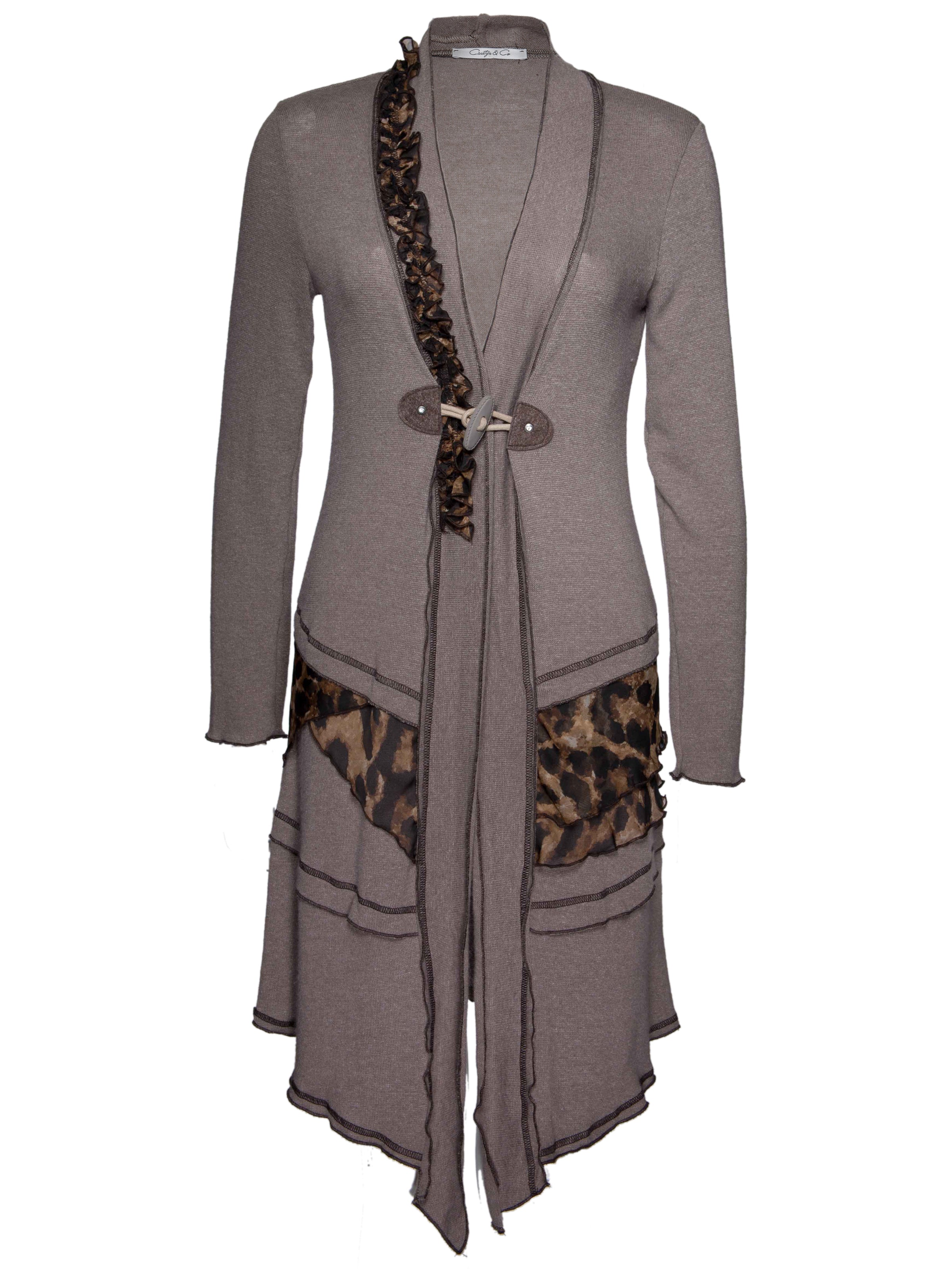 - Long sleeved cardigan featuring leopard print organza ruffle trim and pleats and a toggle fastener.57% polyamide, 26% viscose, 12% angora, 5 elastic. Dry cleaning only.