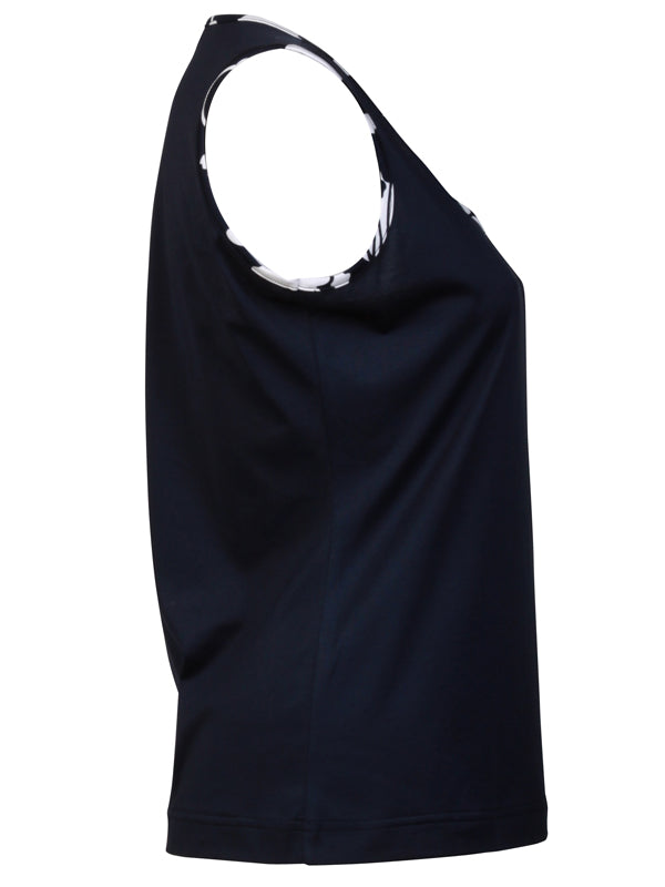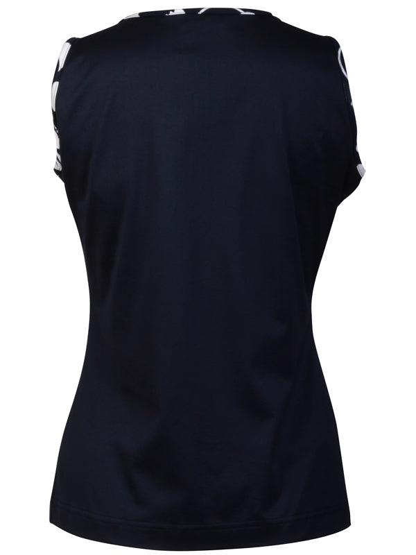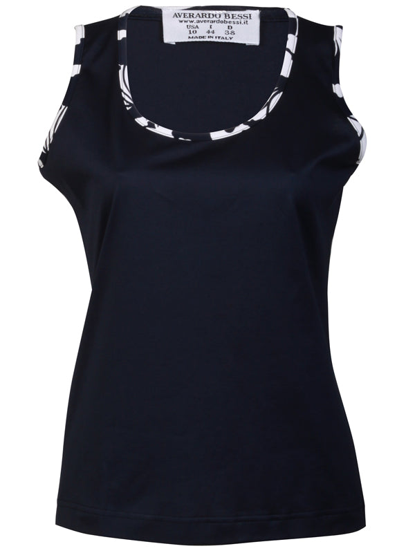 Make a style statement with this dark-blue sleeveless jersey tank top. Add easy cool to your spring wardrobe. Tim piping in blue and white blend flowing from around the neck, and border of the sleeves.