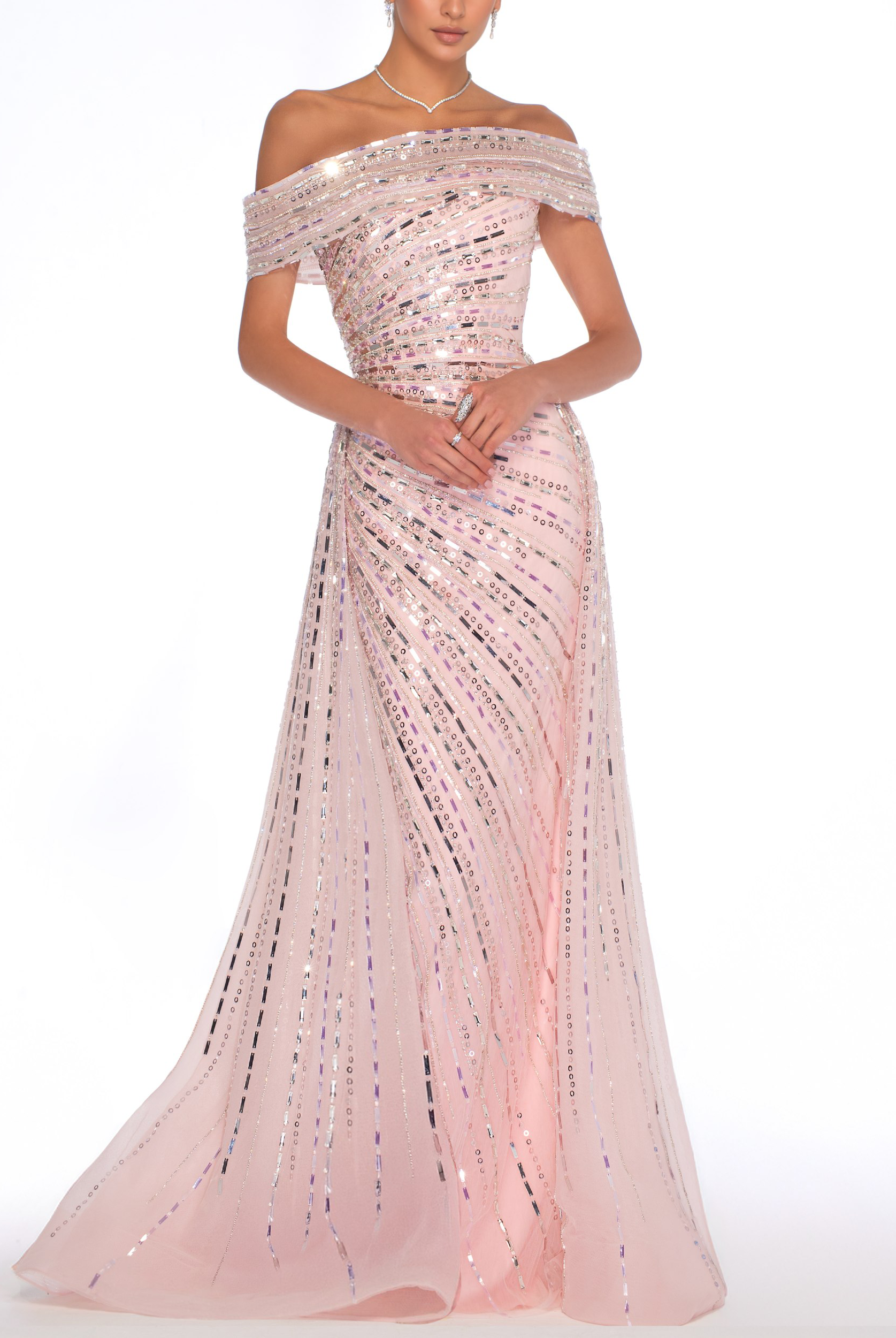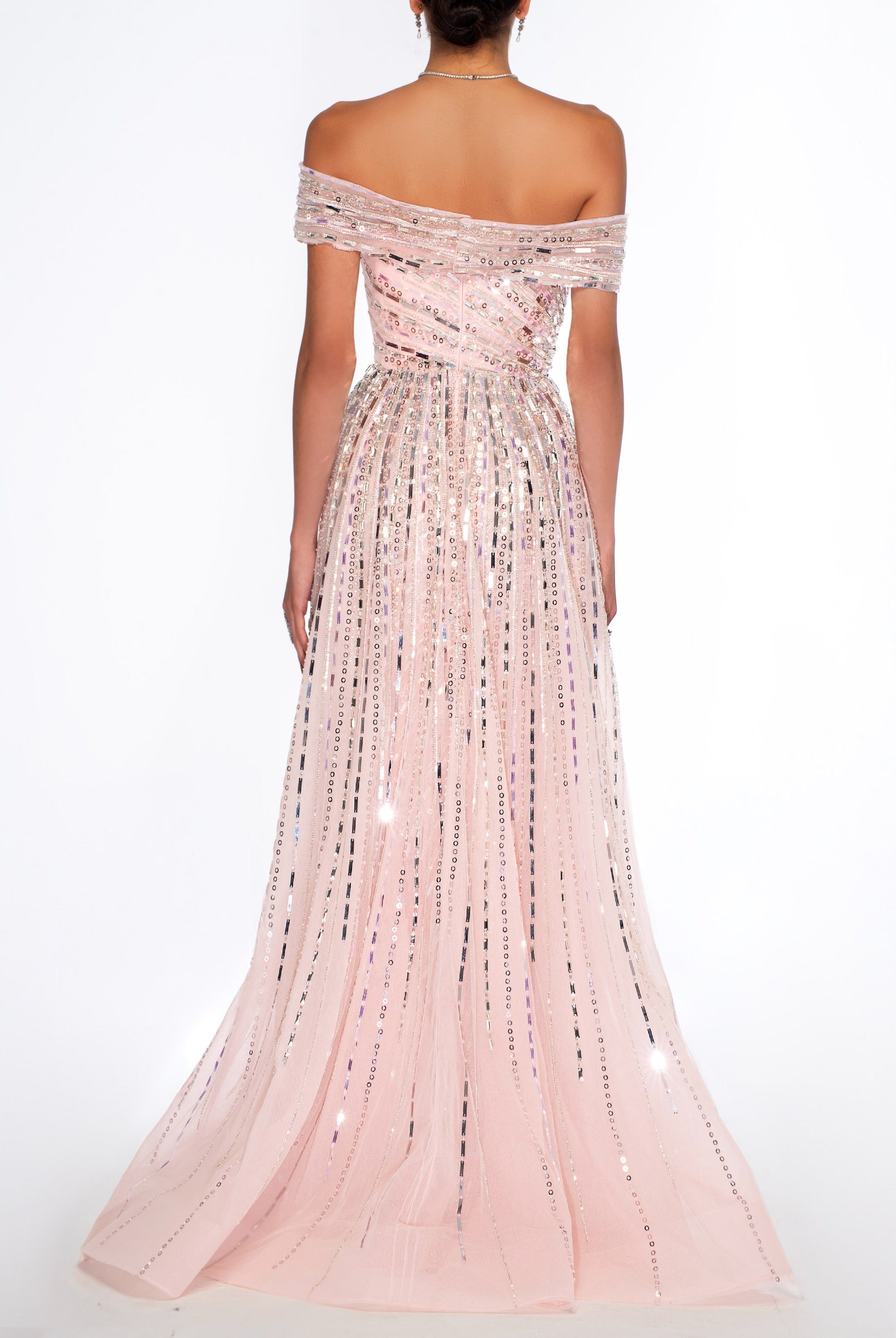 A fitted embellishment gown with an asymmetrical off-shoulder neckline, structured bodice, silver-toned embroidery, sequins, and a flowing overskirt.