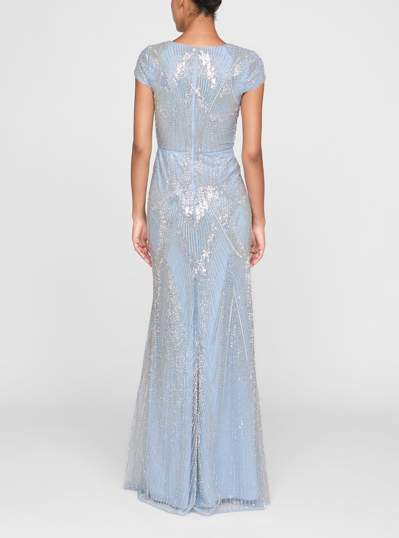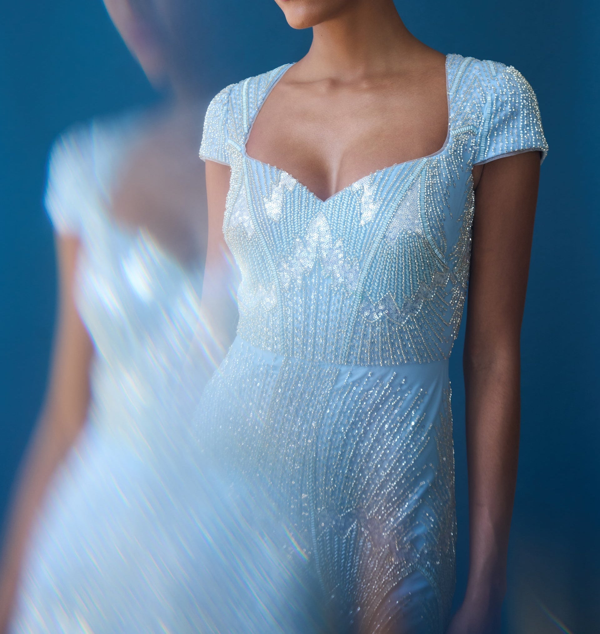 Fully beaded gown with a soft, reflective finish inspired by glasswork. Designed with delicate cap sleeves and intricate beadwork that catches the light from every angle. A luminous choice for formal evenings and black-tie celebrations.