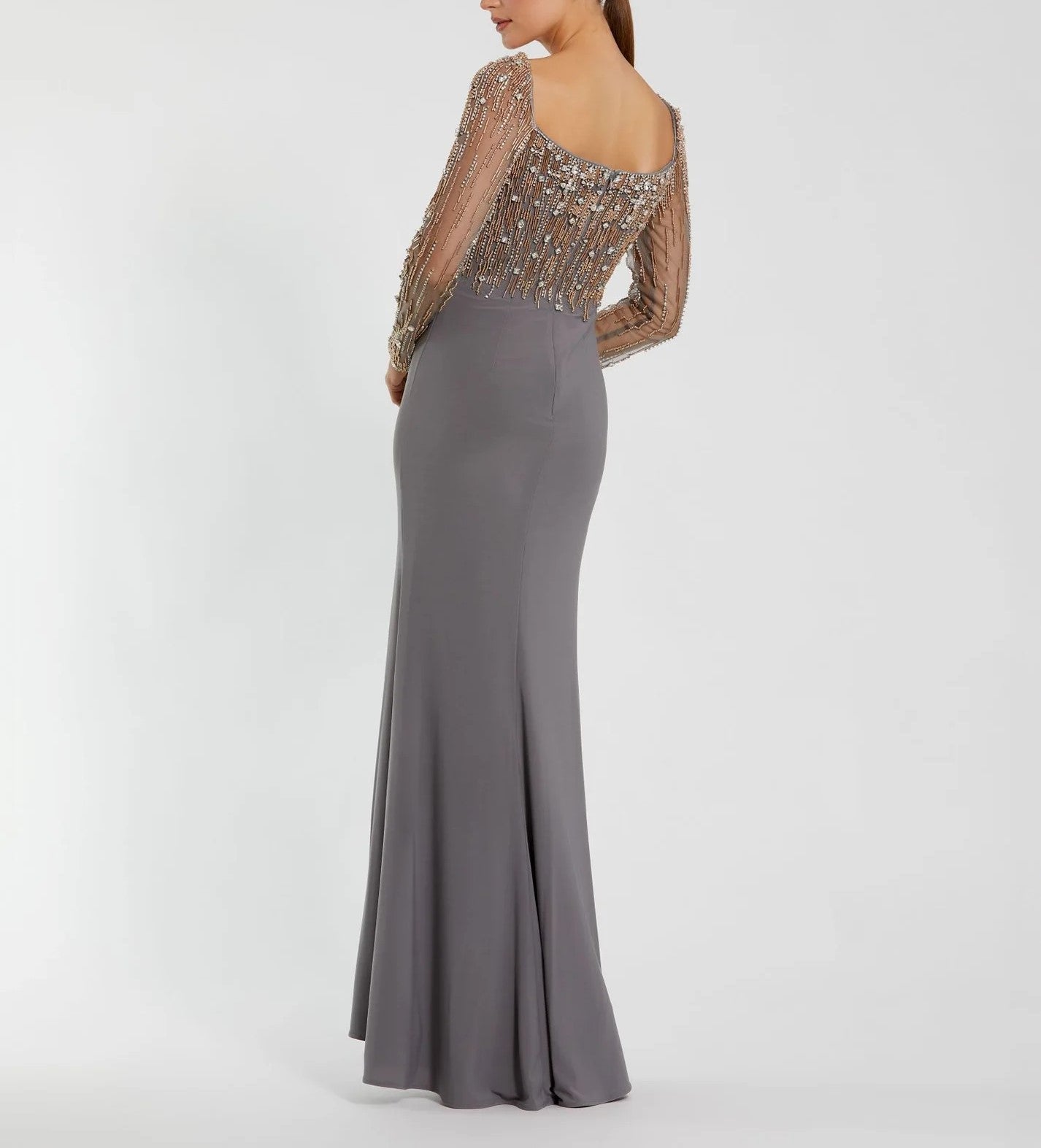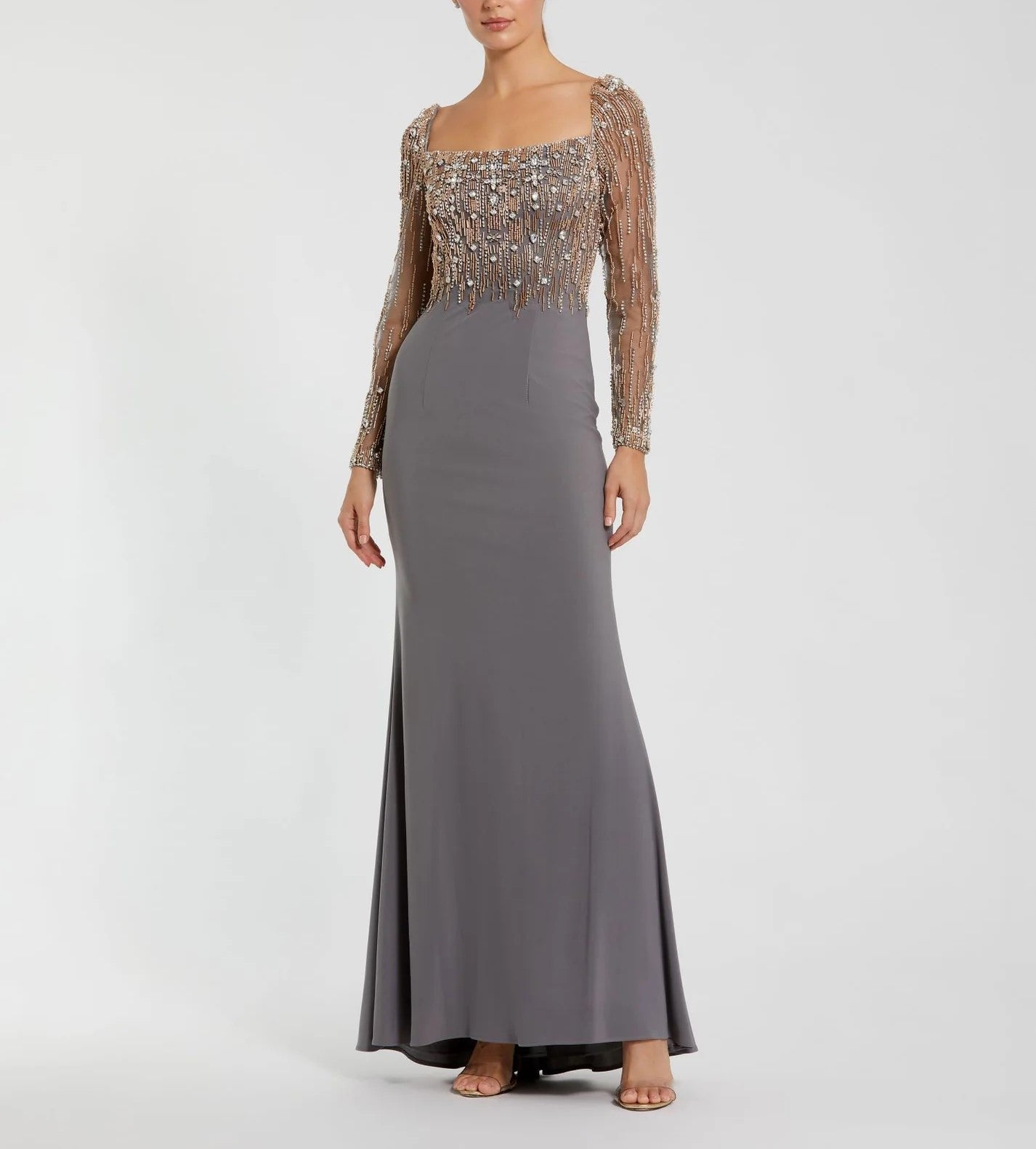 Beaded Square Neck Long Sleeve Jersey Gown