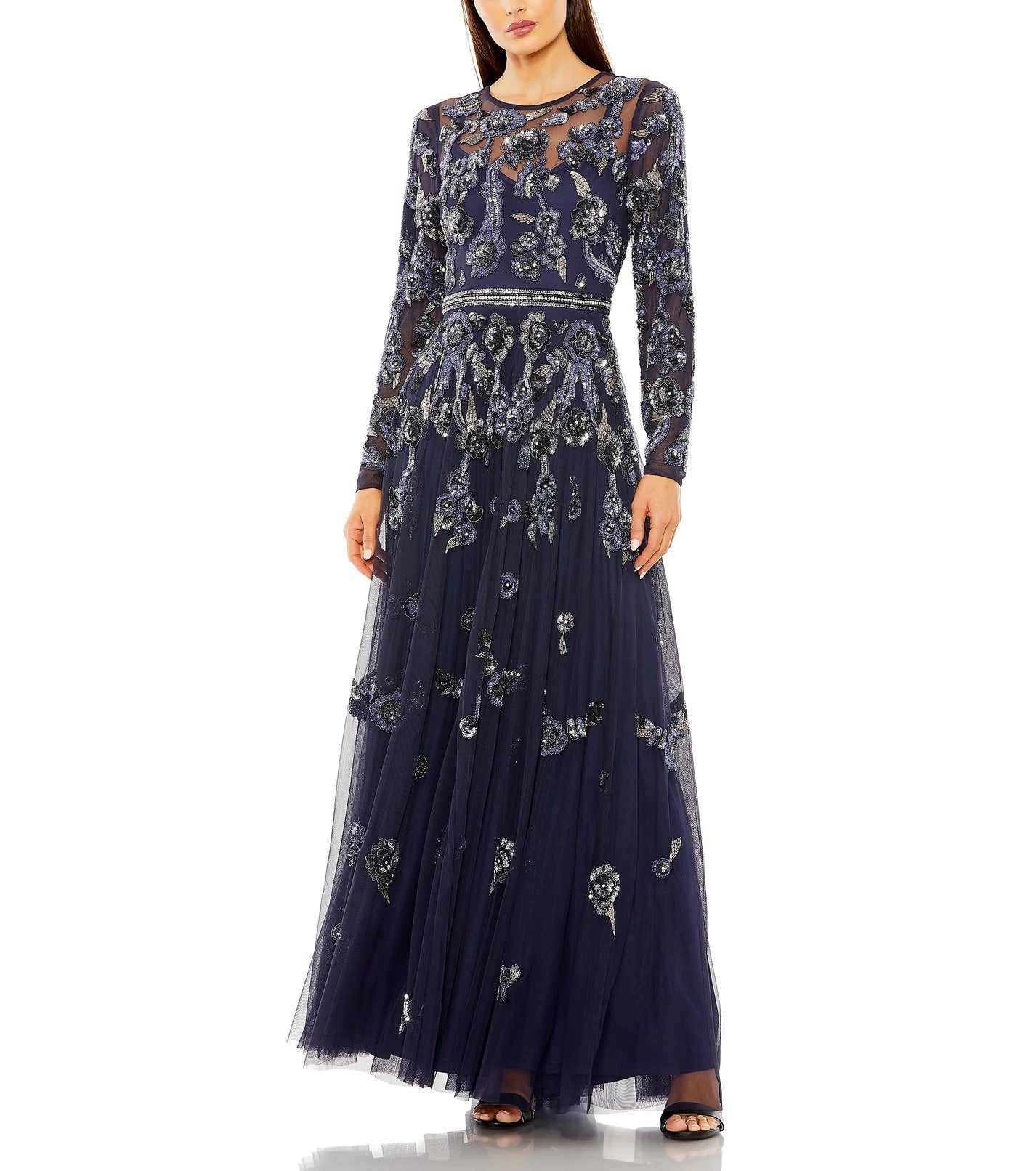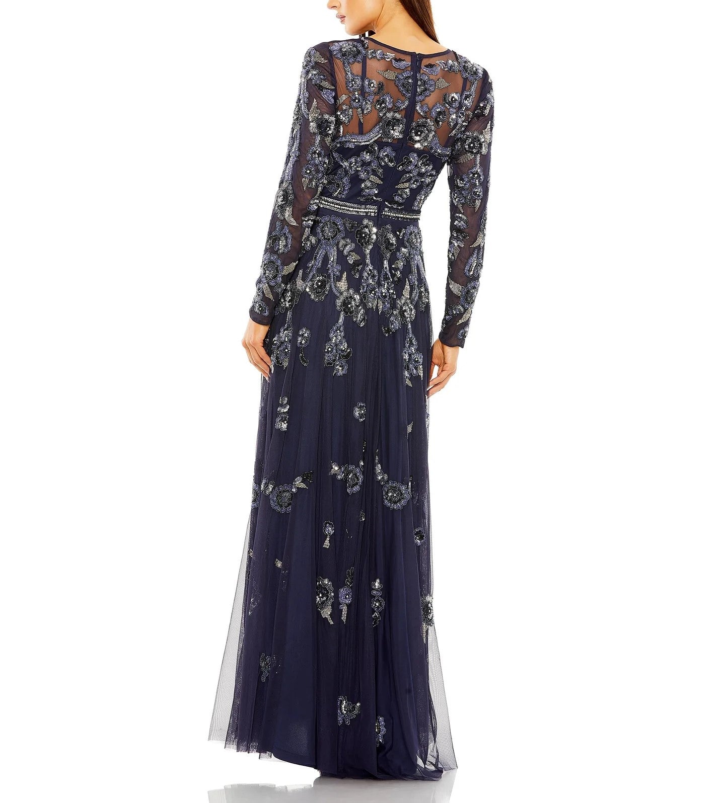 Long Sleeve High Neck Floral Bead A-Line Gown