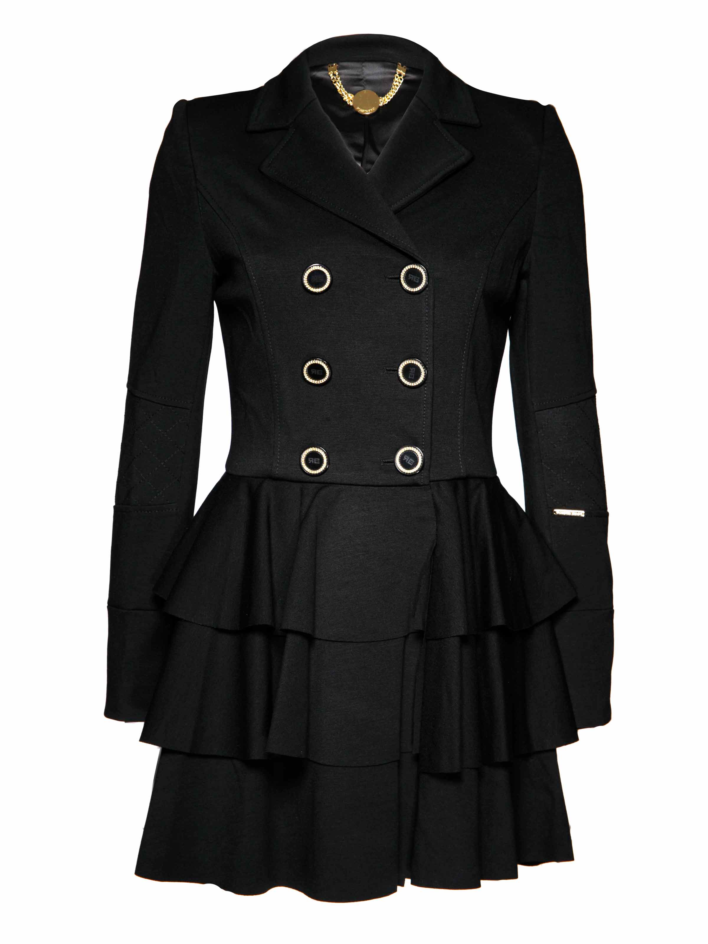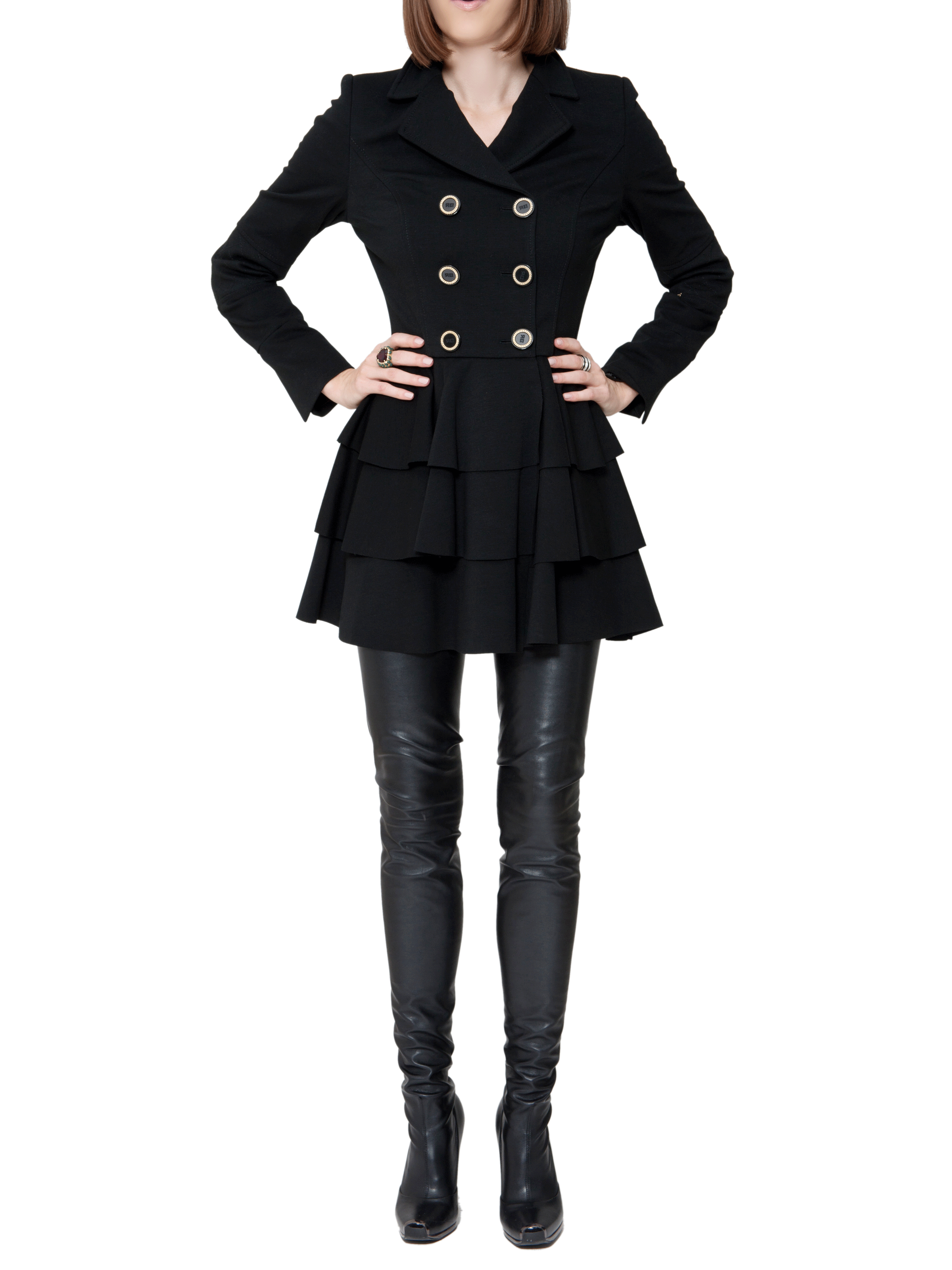 - Double breasted fitted frock coat featuring cross stitch detailing and a feminine pleated skirt.