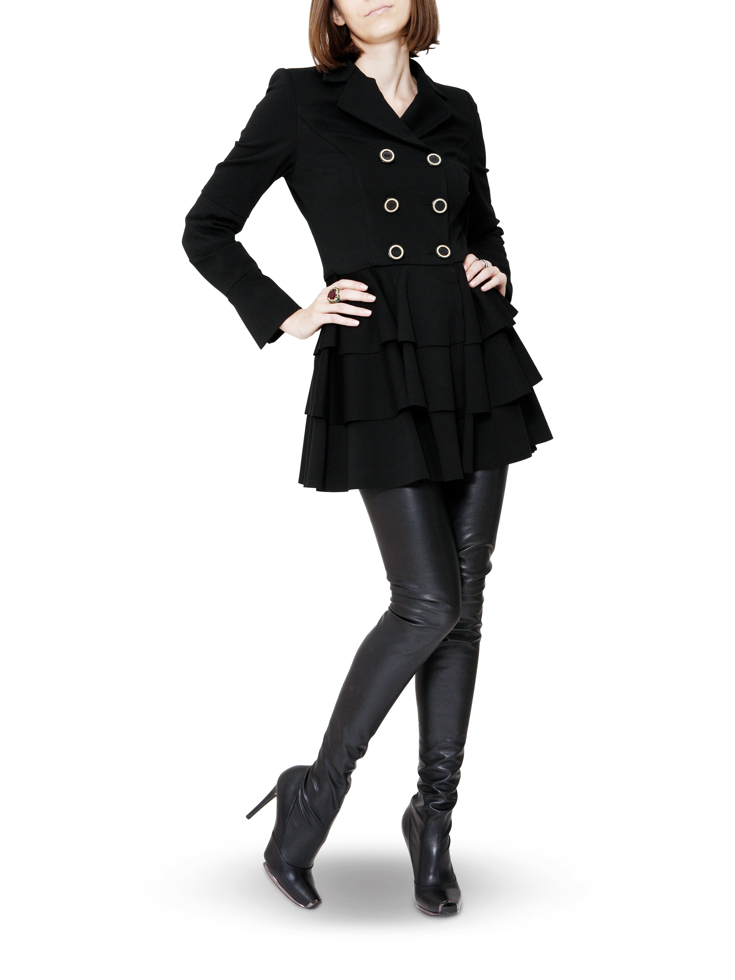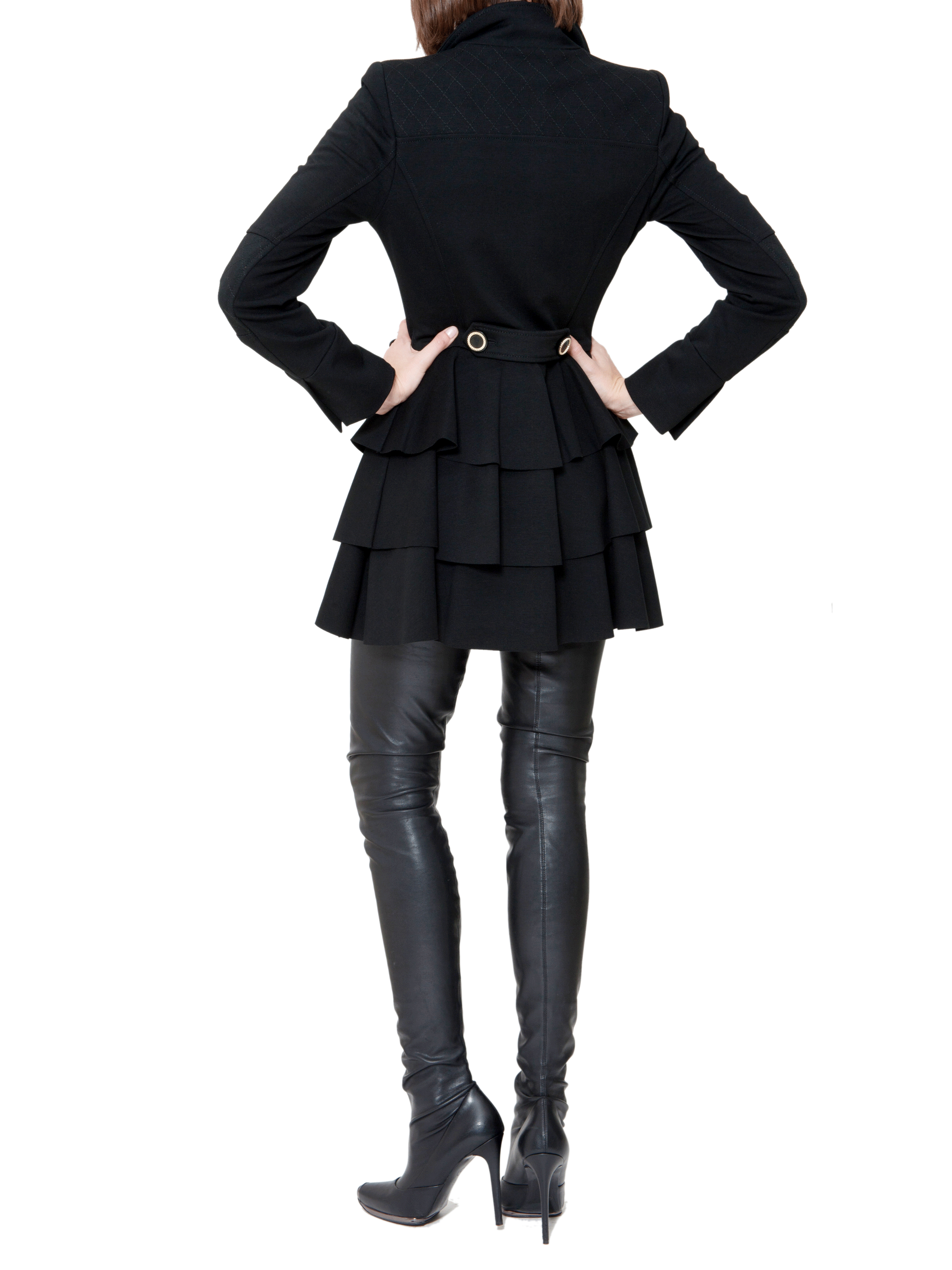 Accessorize Roberta Biagi's outstanding black frock coat with thigh high boots for an ultra glamorous style statement.