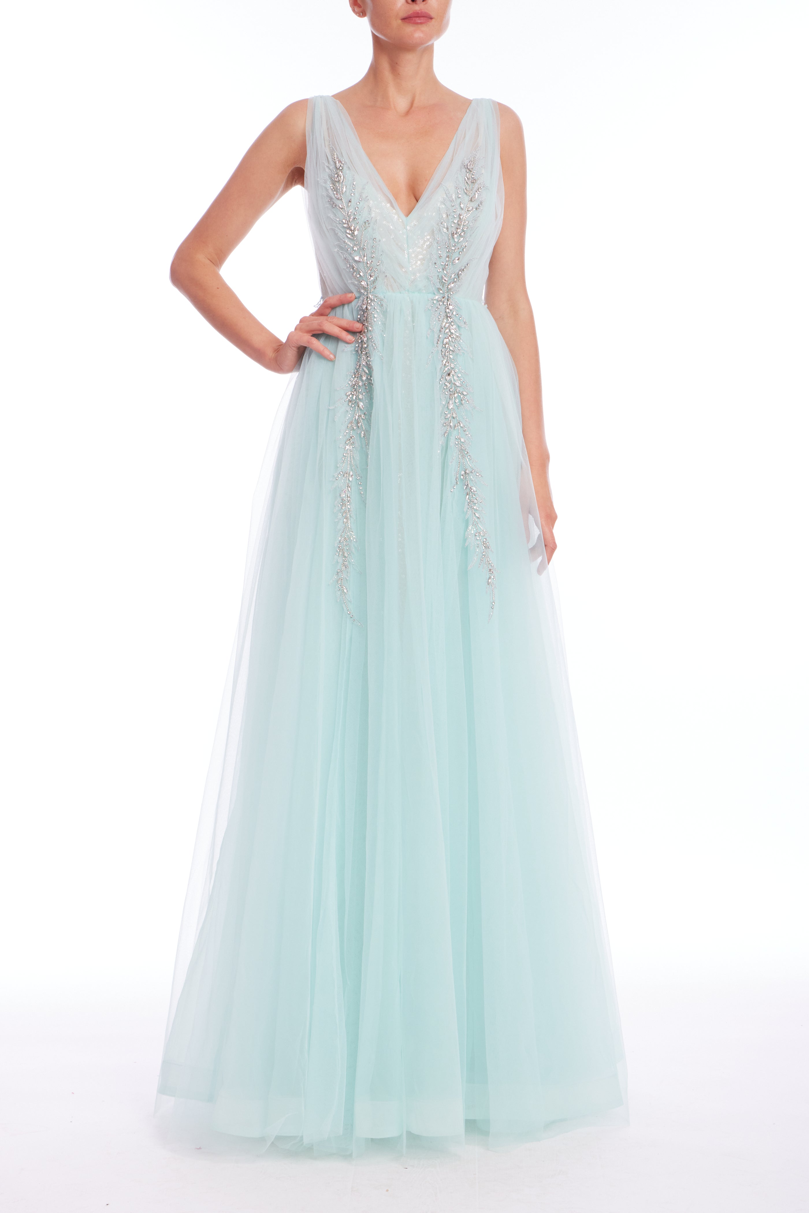 Pair with silver or metallic heels and delicate jewelry to let the crystals and tulle take center stage. A sleek updo or soft waves will complement the regal look, and a clutch with crystal or metallic accents will add the perfect finishing touch.