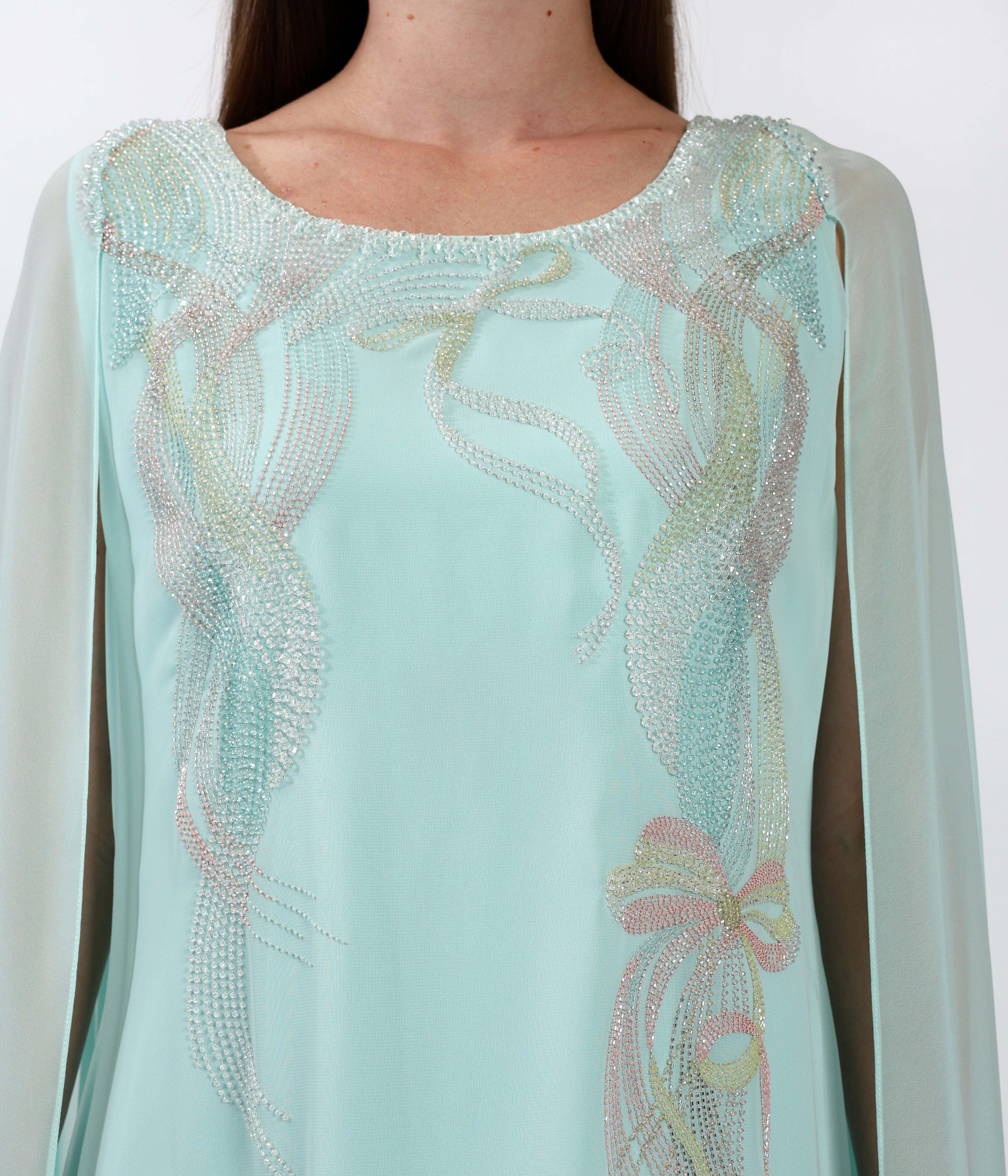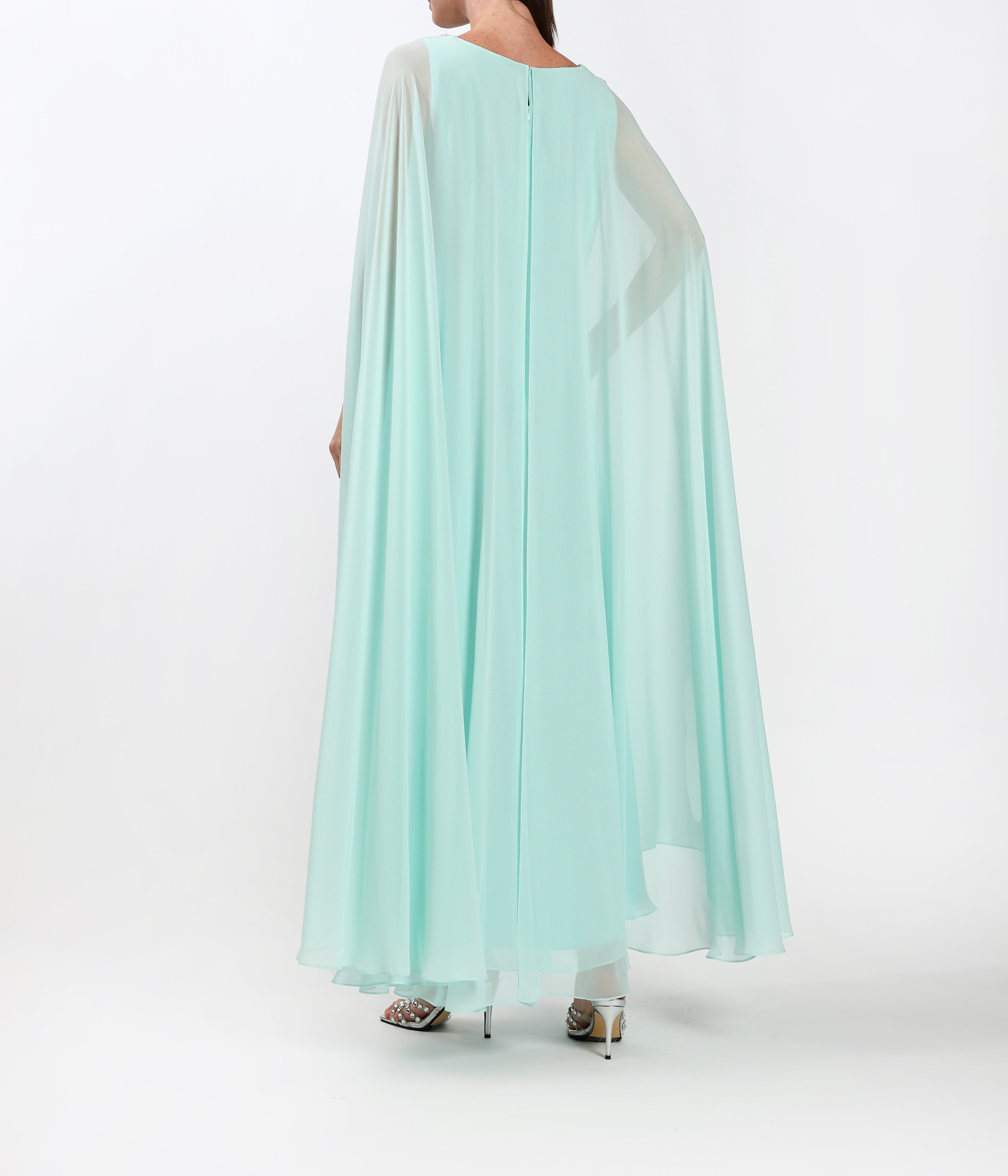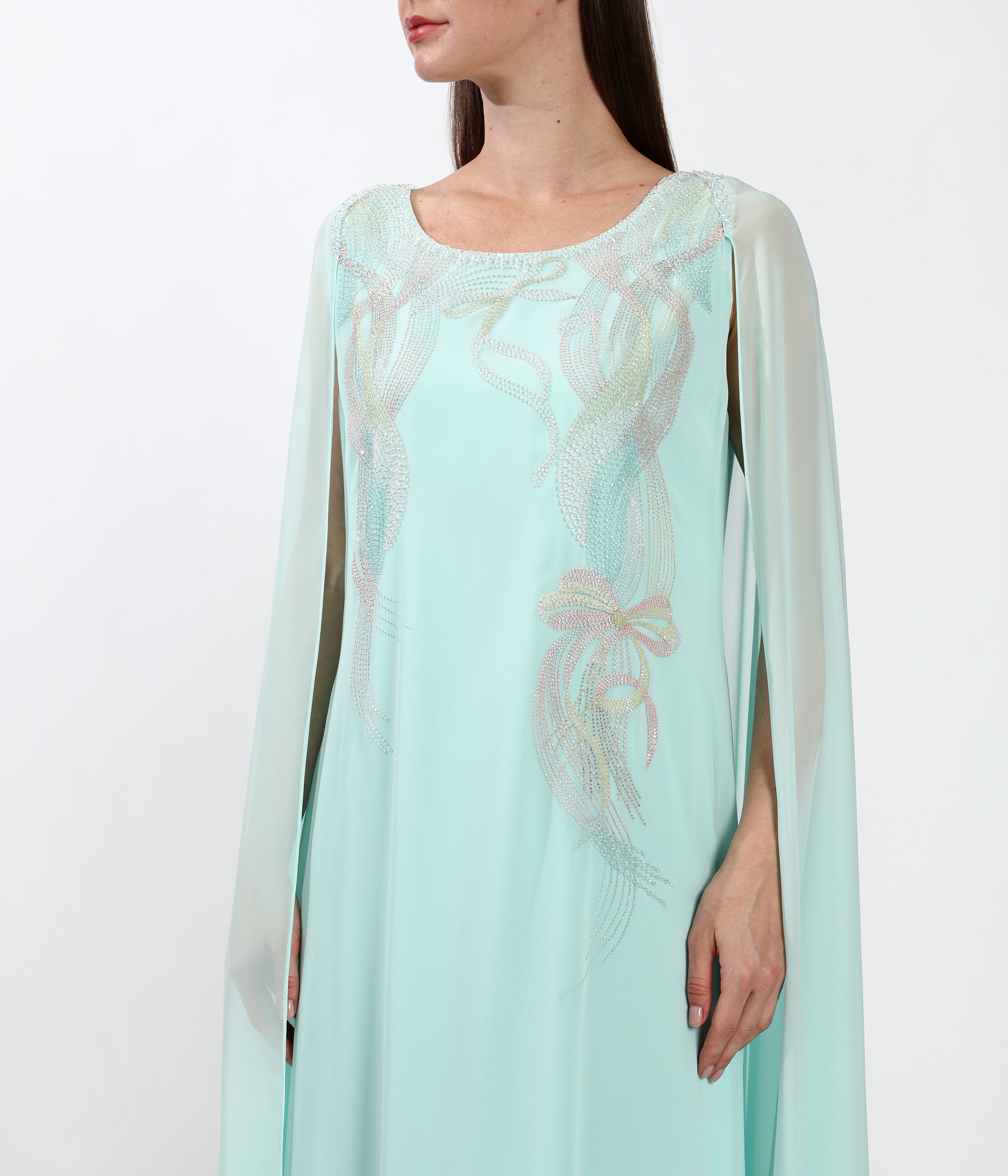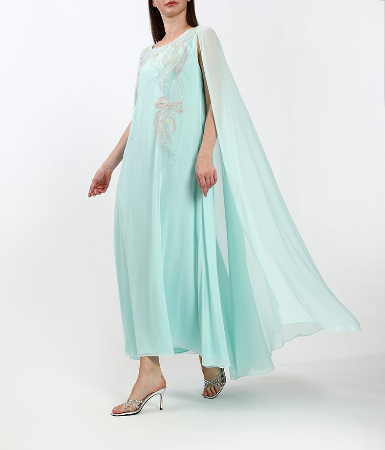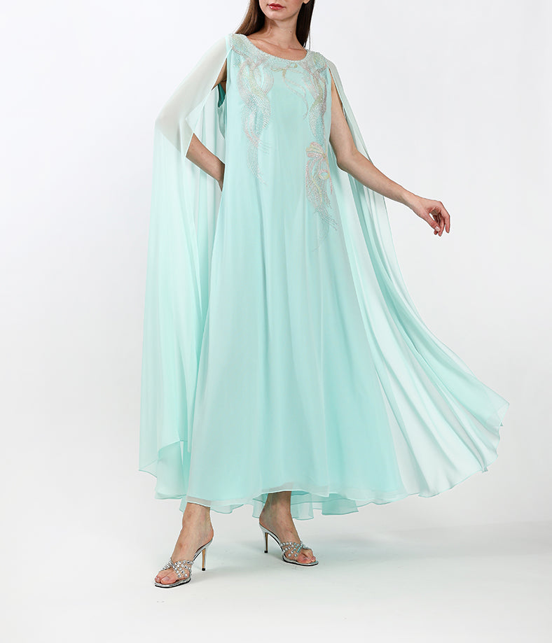 Light Chiffon Dress With Continuous Hand Cape And Handmade Embellishments