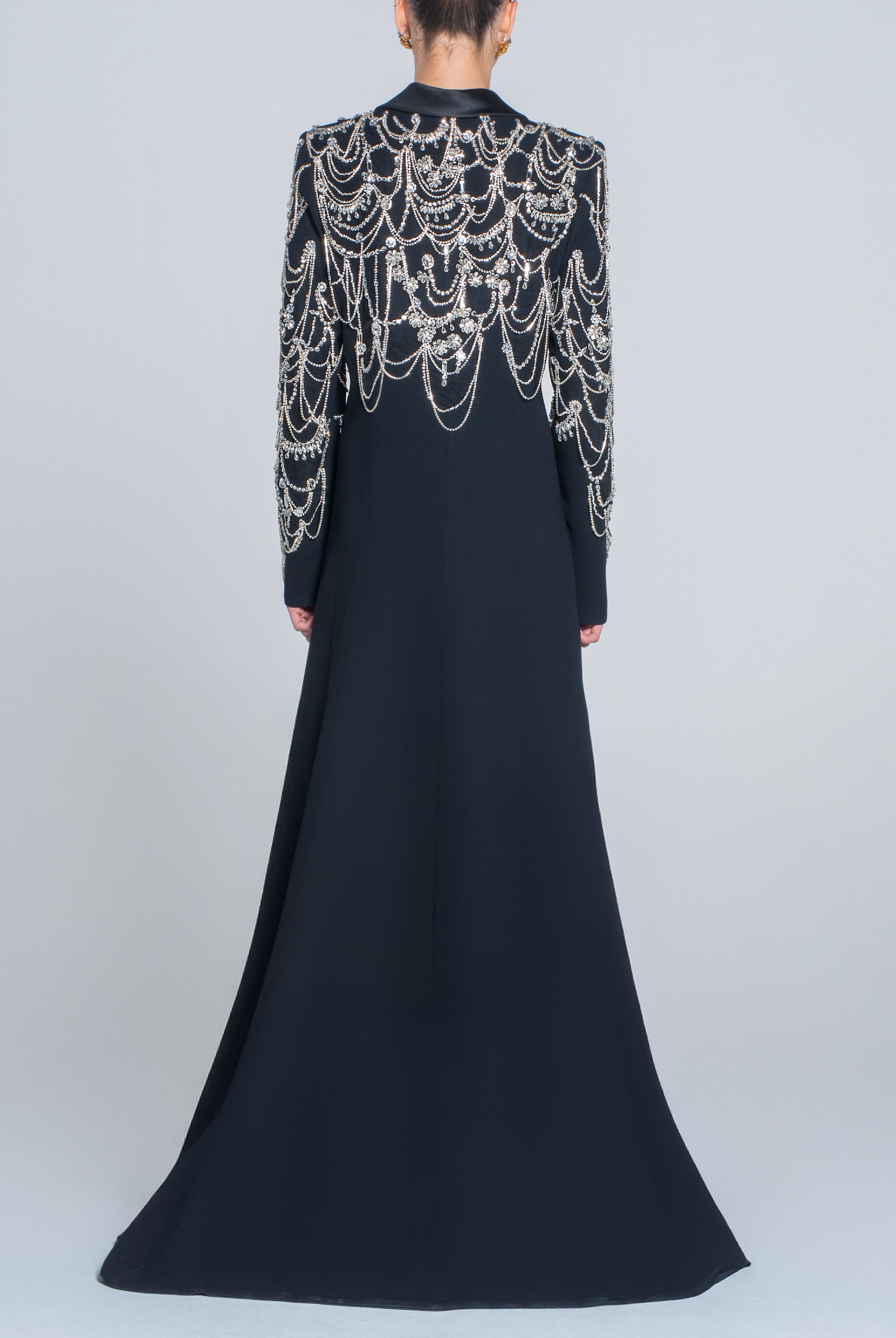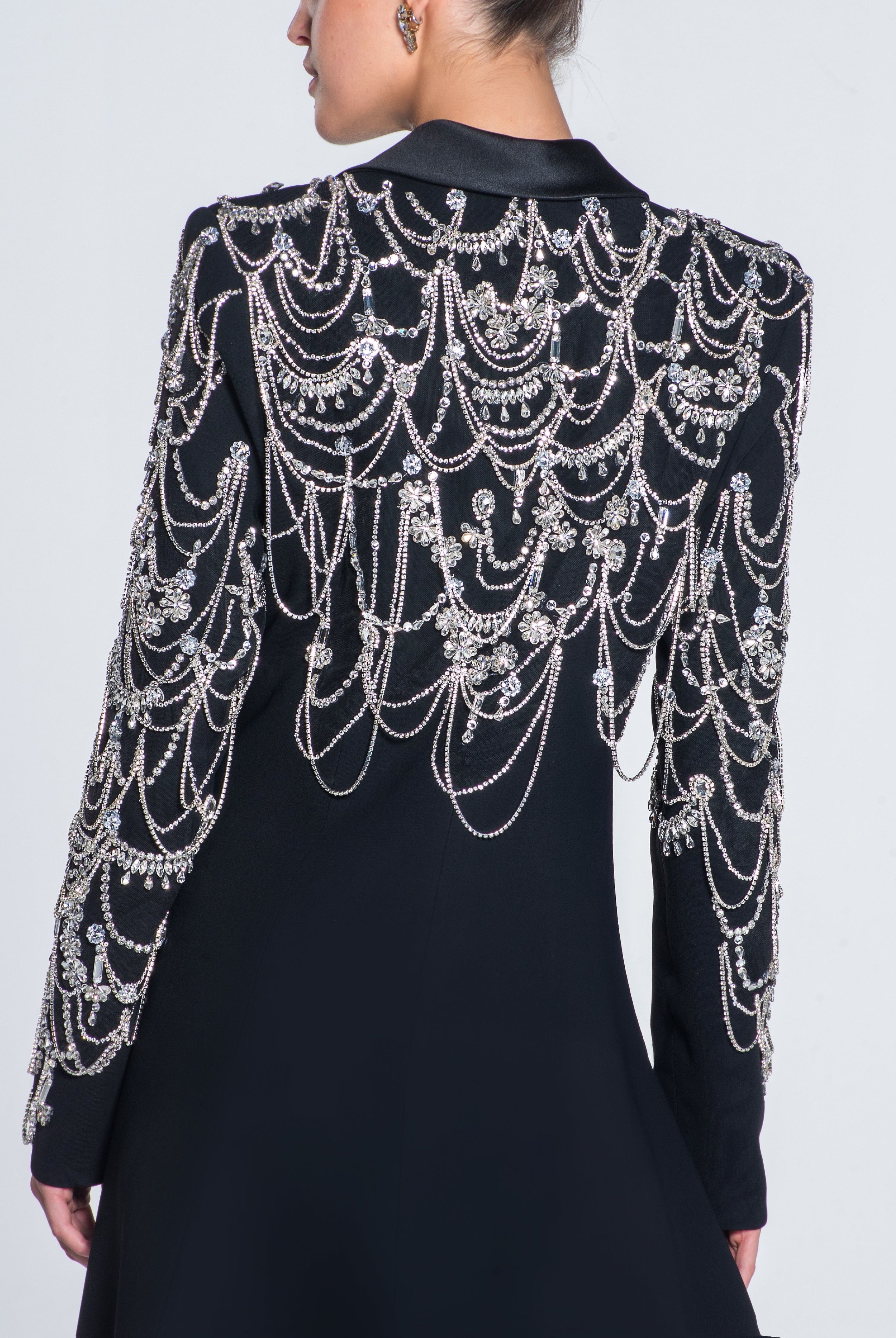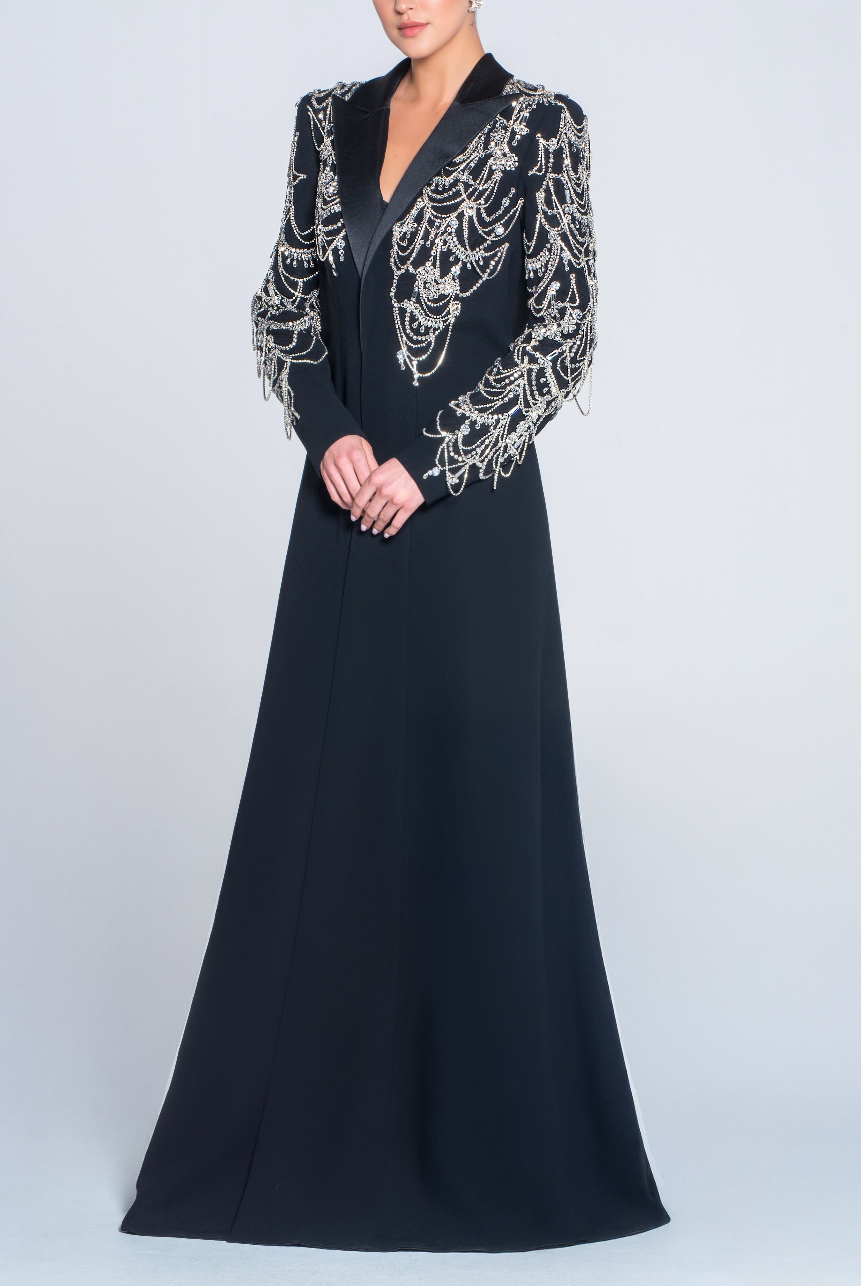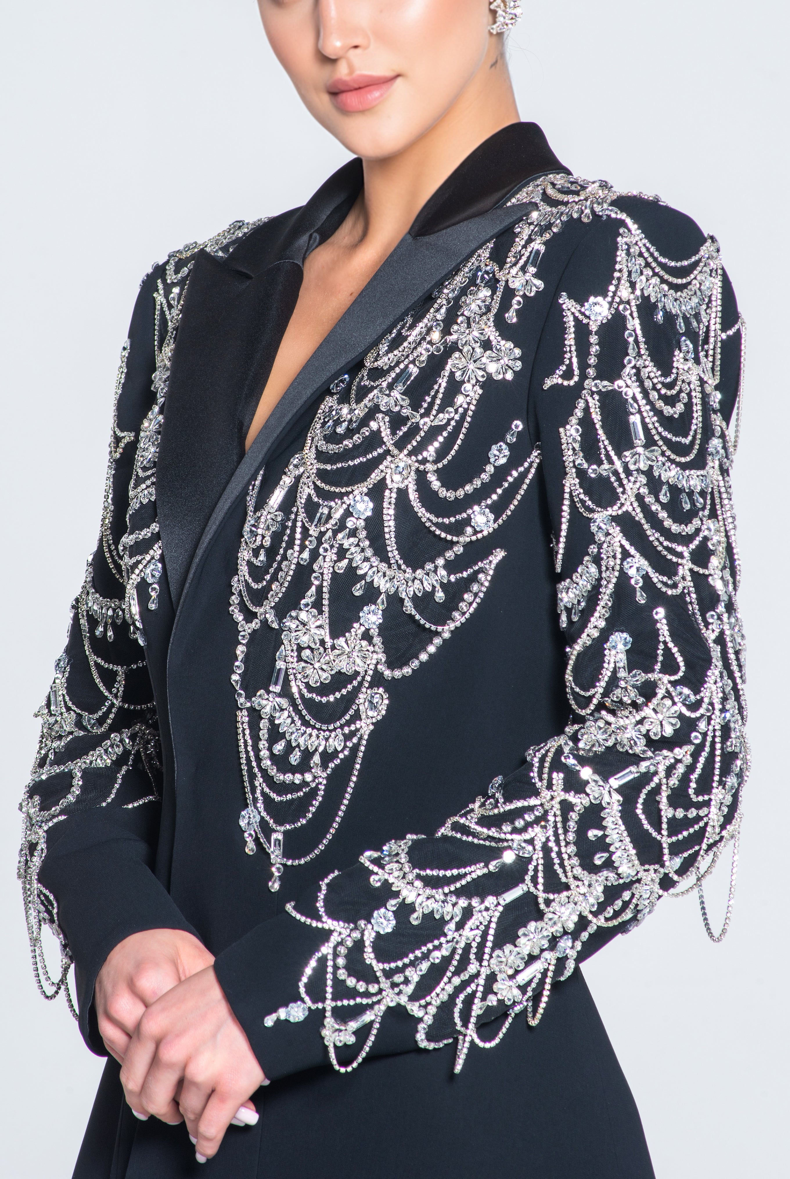 - Silver crystals and stones along shoulders and sleeves embellishment