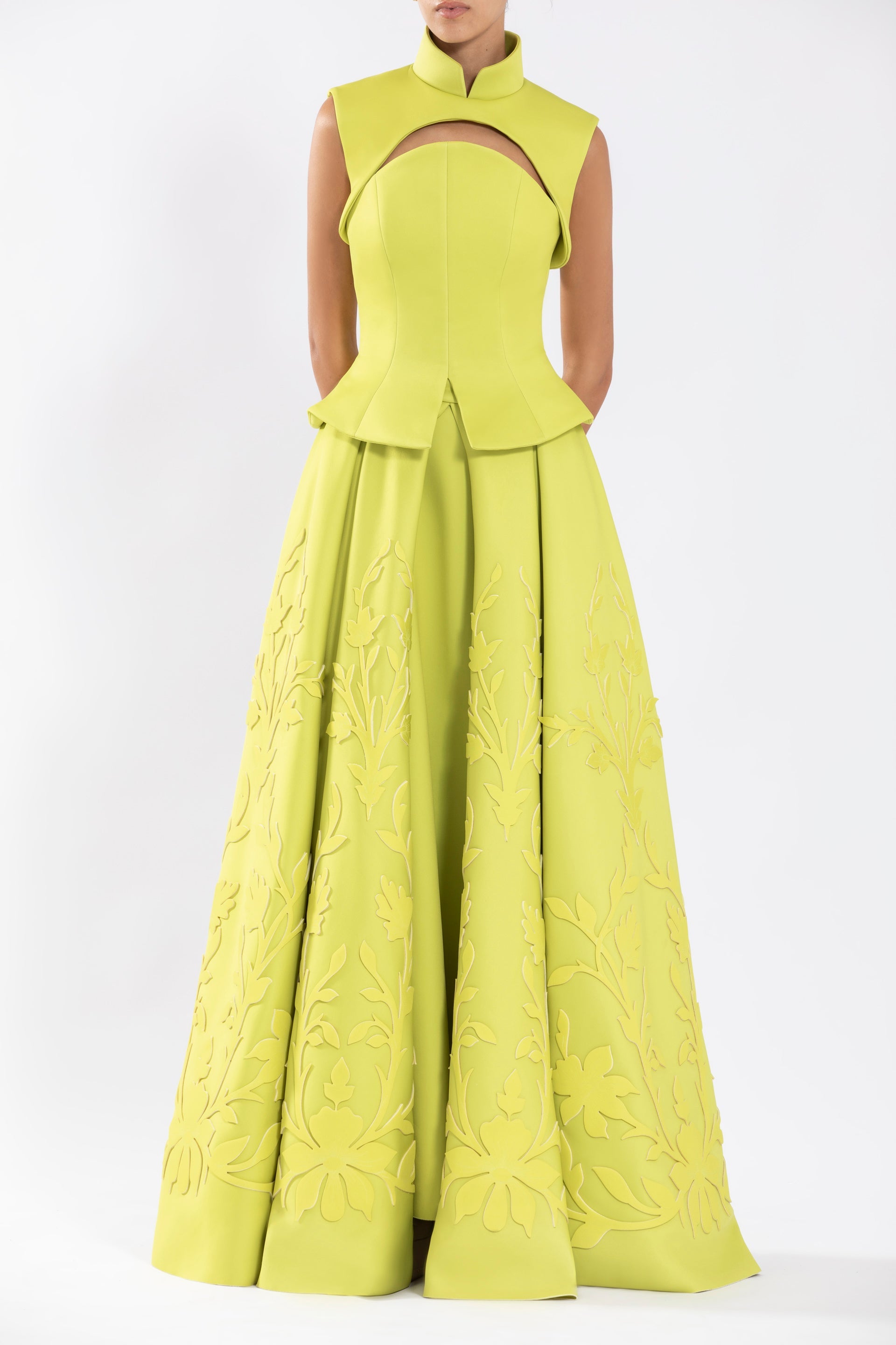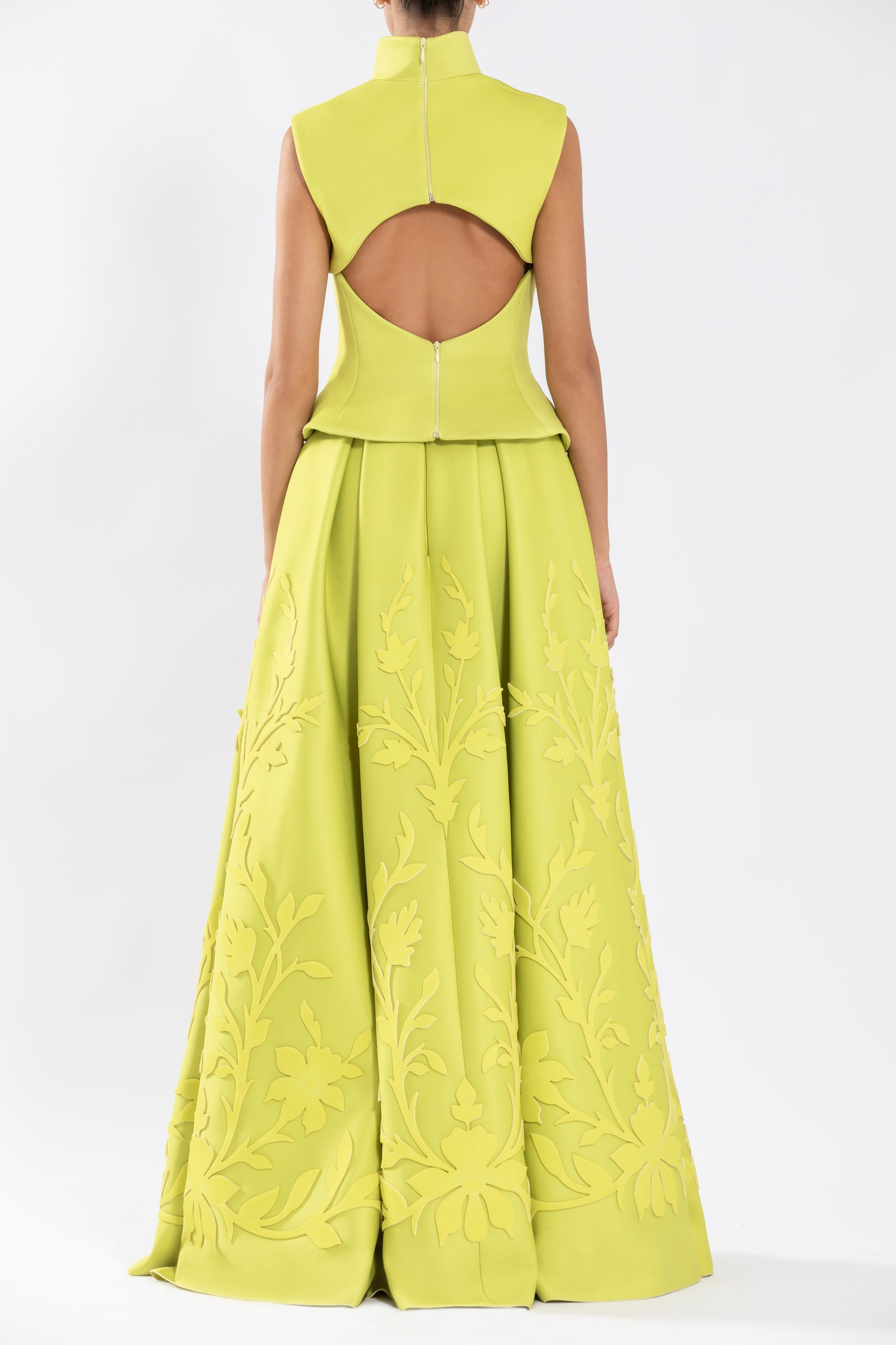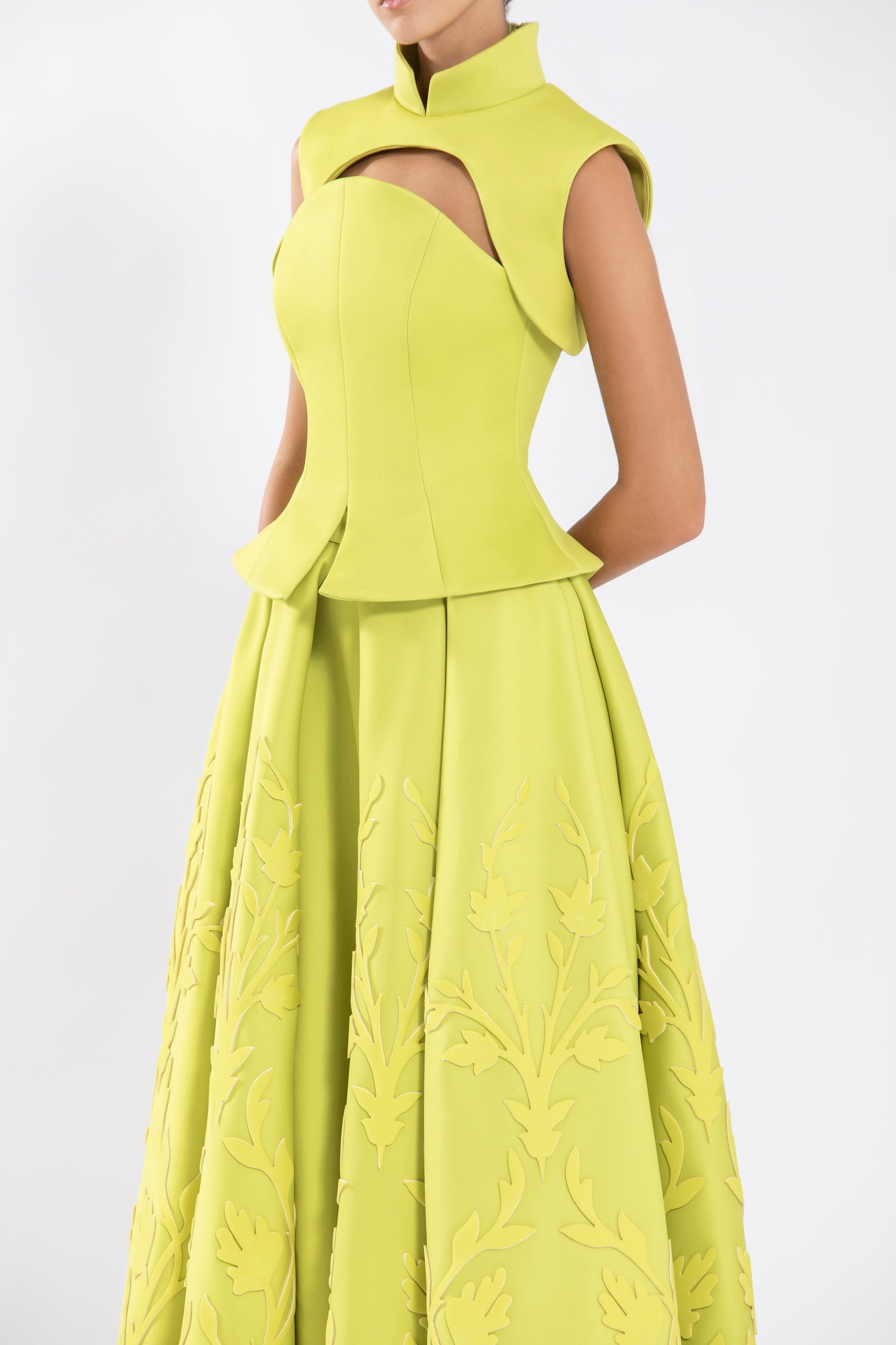 Lime Green neoprene, strapless corset with a flared edge, paired with a detachable edgy bolero that follows the cuts and lines of the corset.