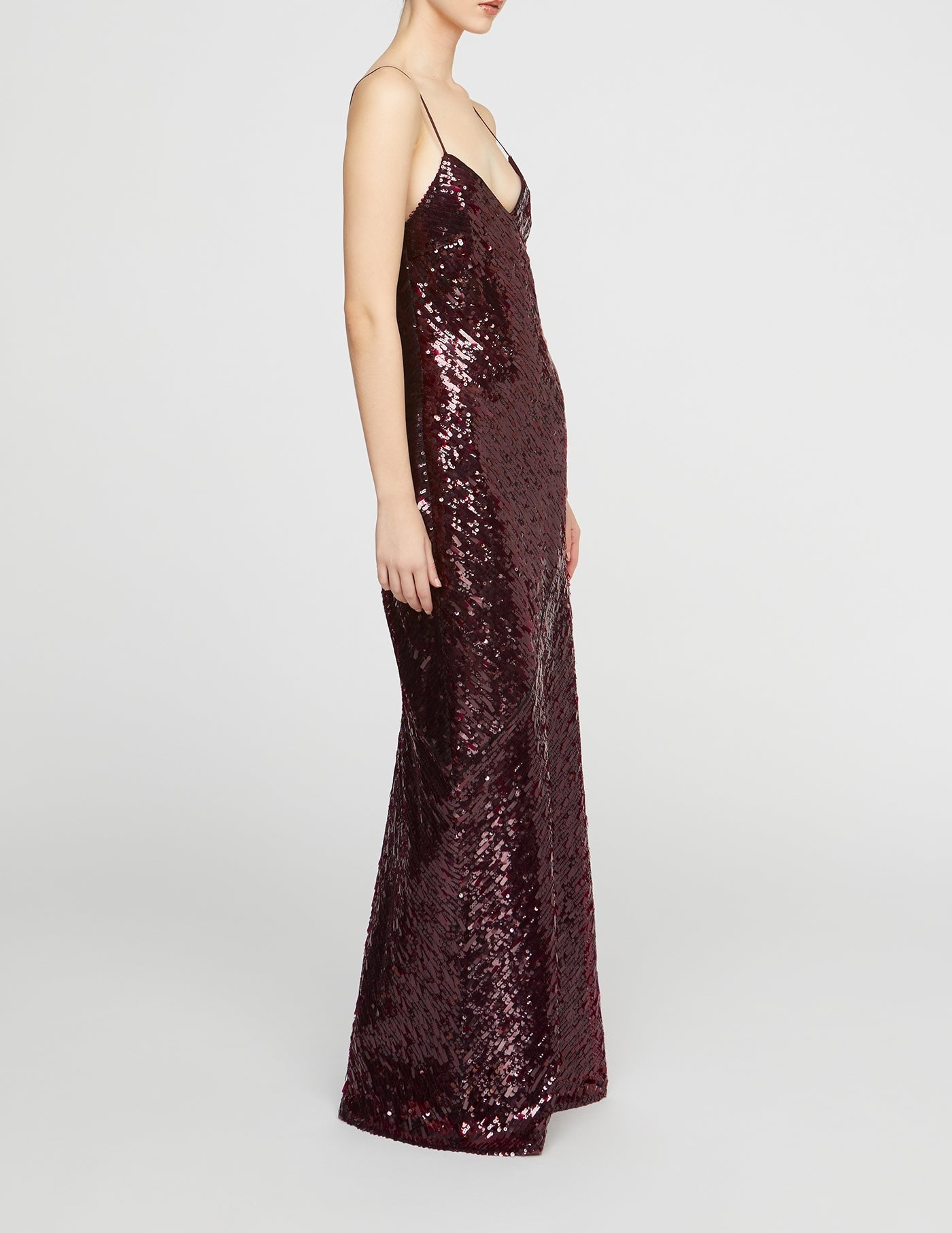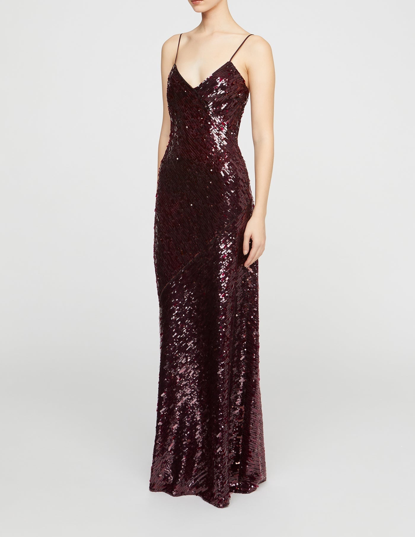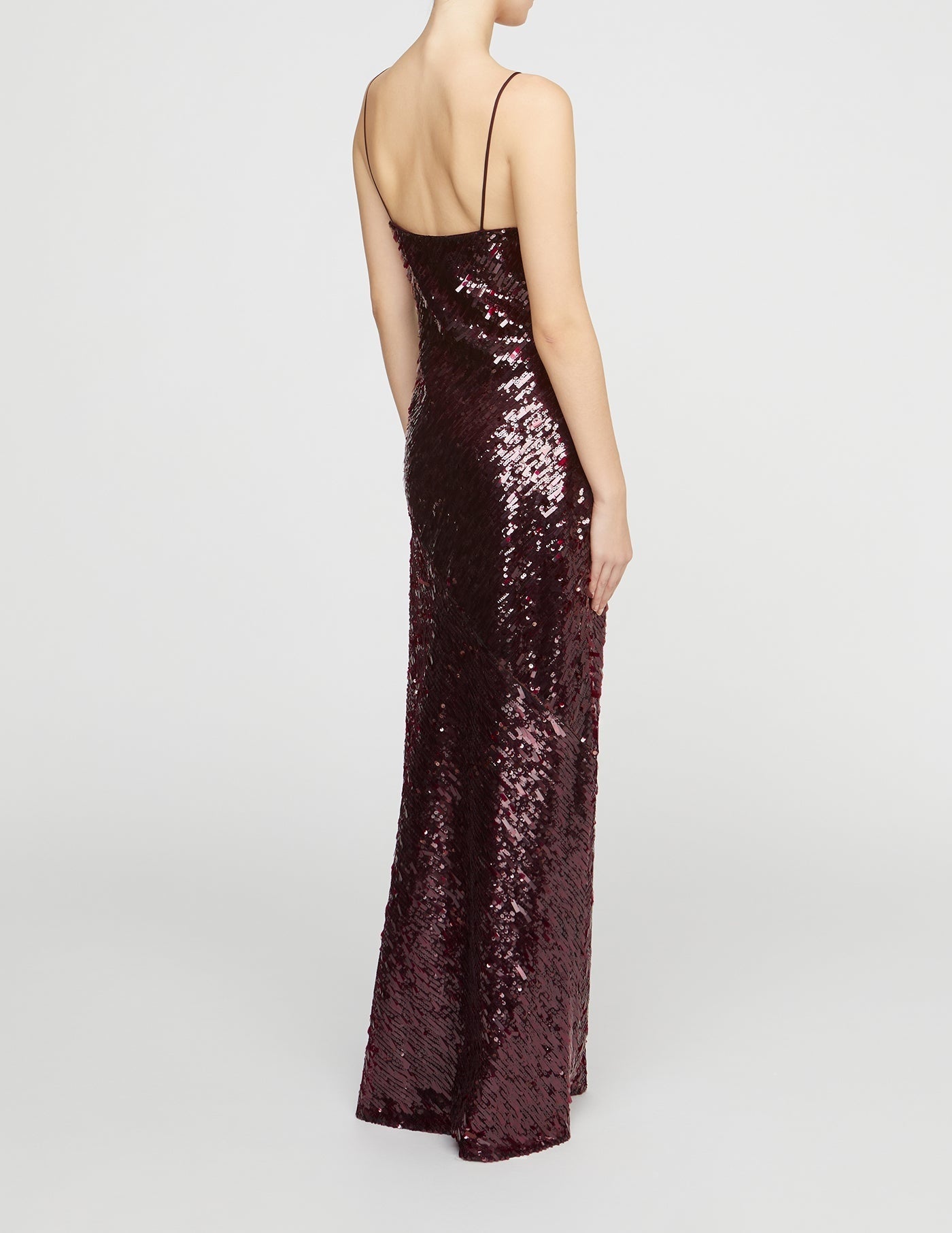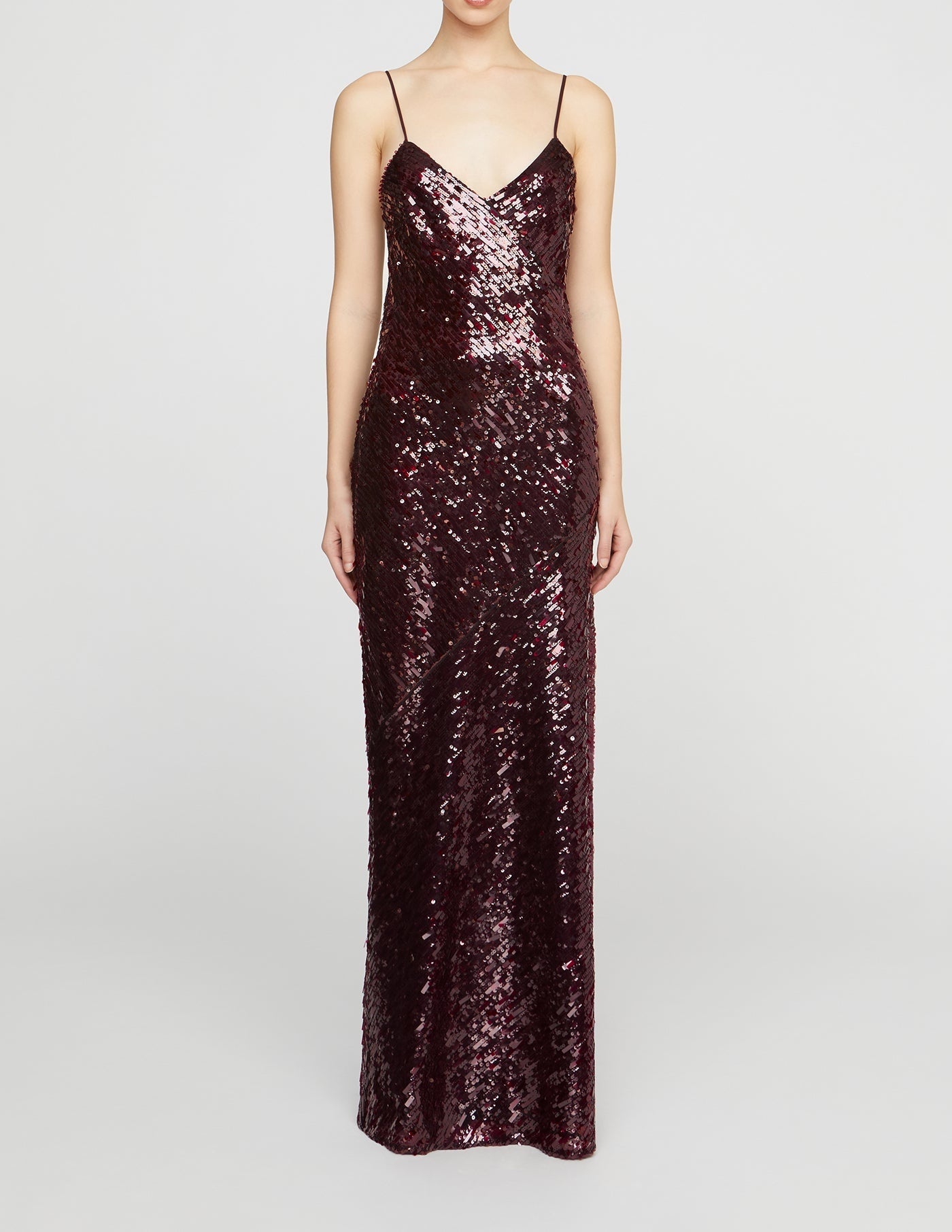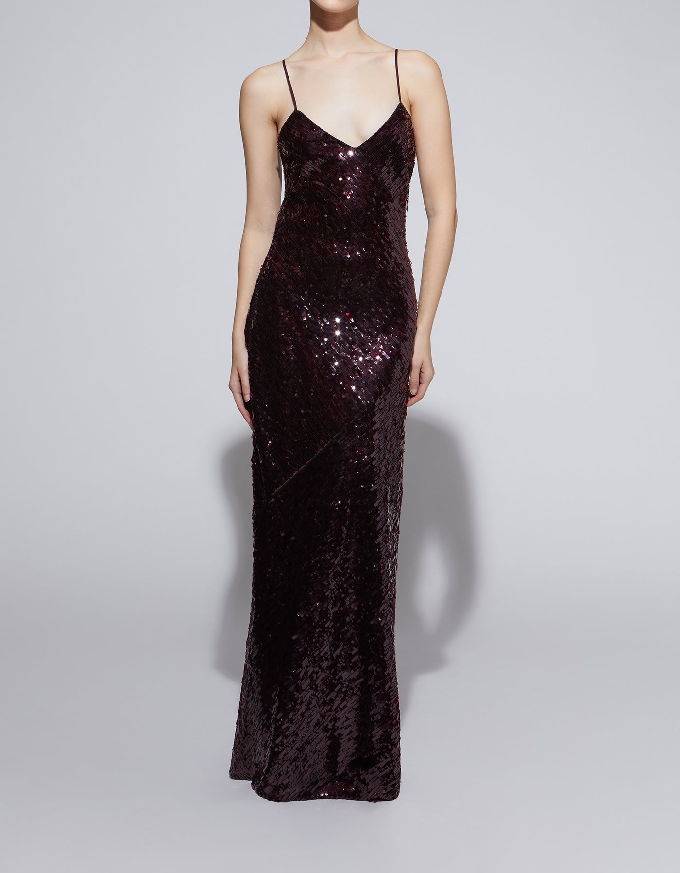 Sequin slip gown with delicate straps and a softly curved neckline. Designed for a smooth, sculpted fit that catches light from every angle—just the thing for gala nights, formal fêtes, or dancing past midnight.