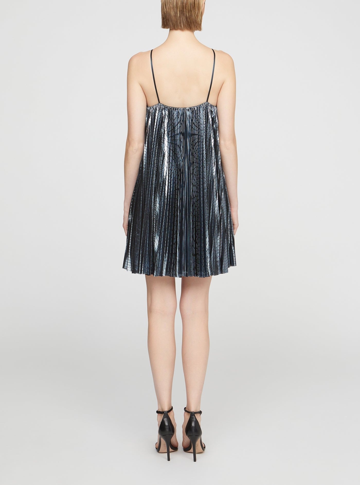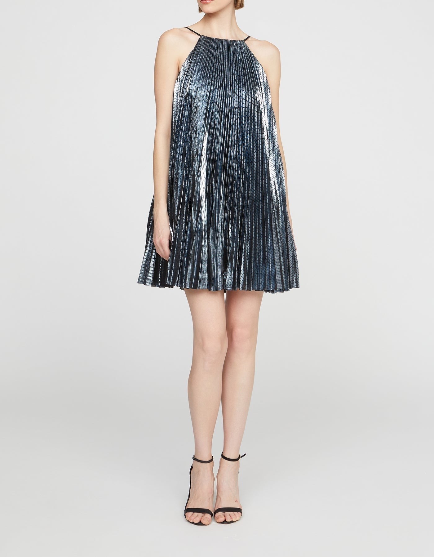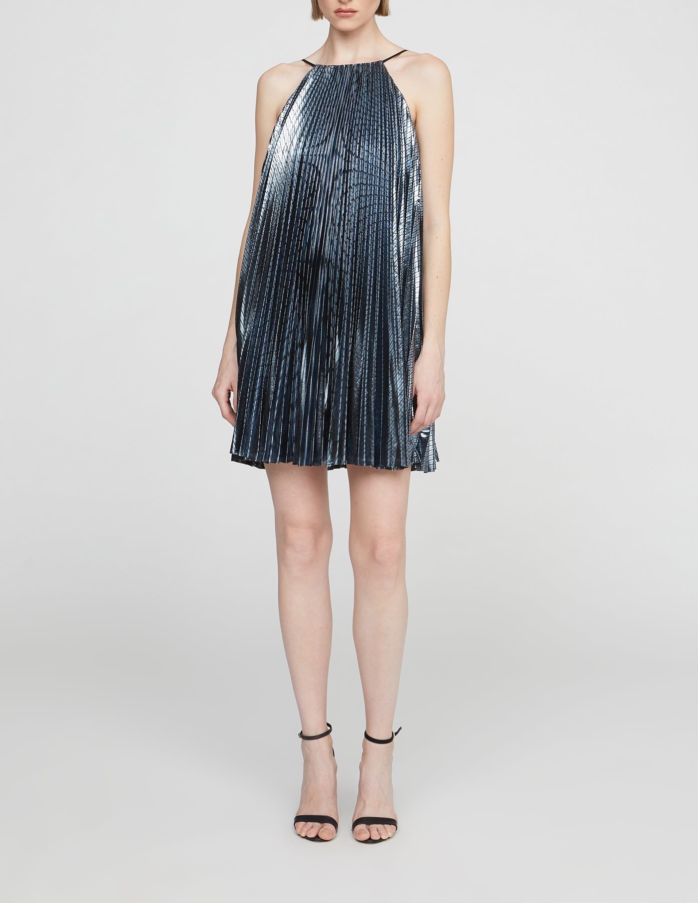 Metallic textured jersey mini dress with allover sunburst pleating and a relaxed trapeze shape. A statement pick for dance floors, birthdays, or year-end celebrations.