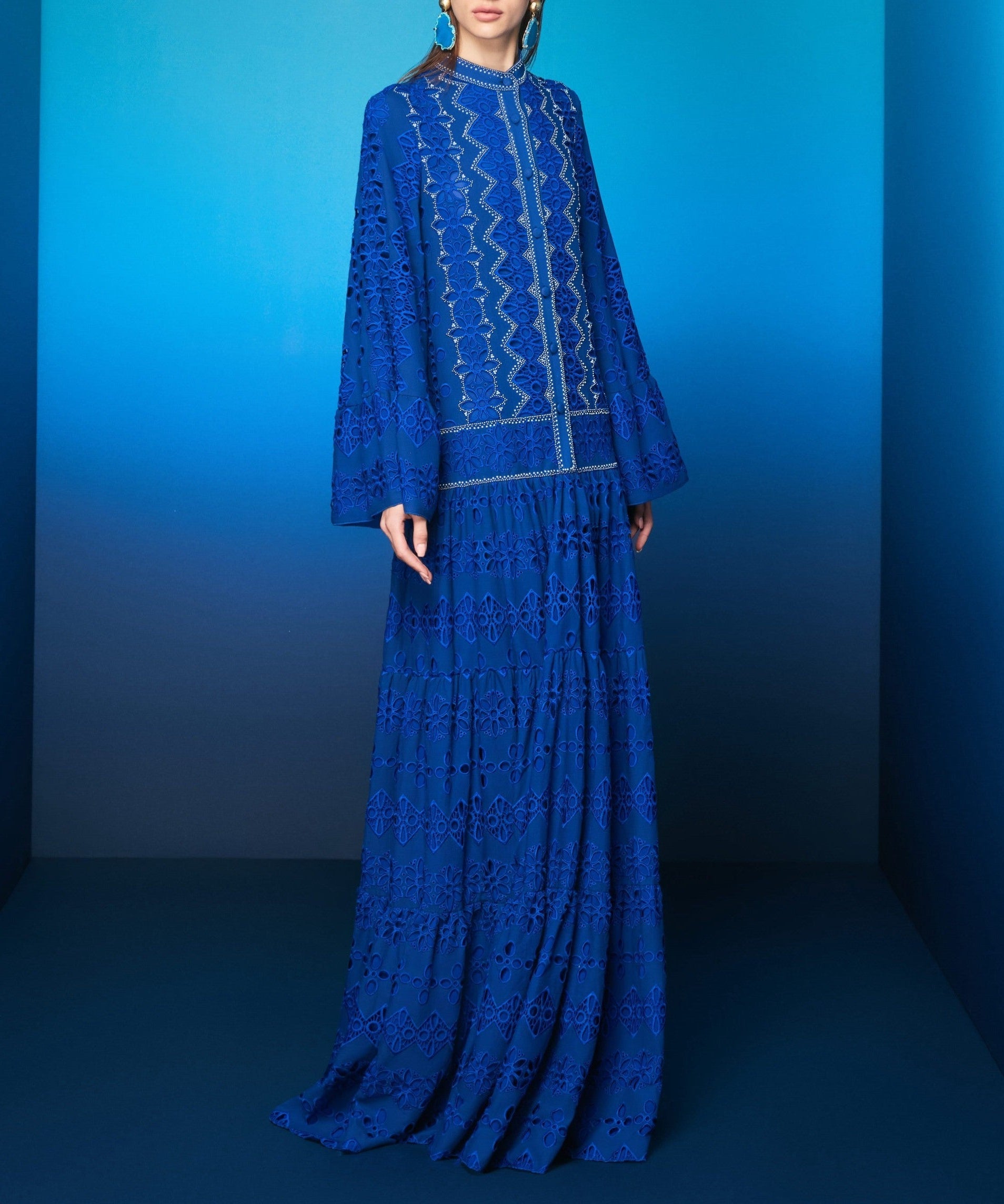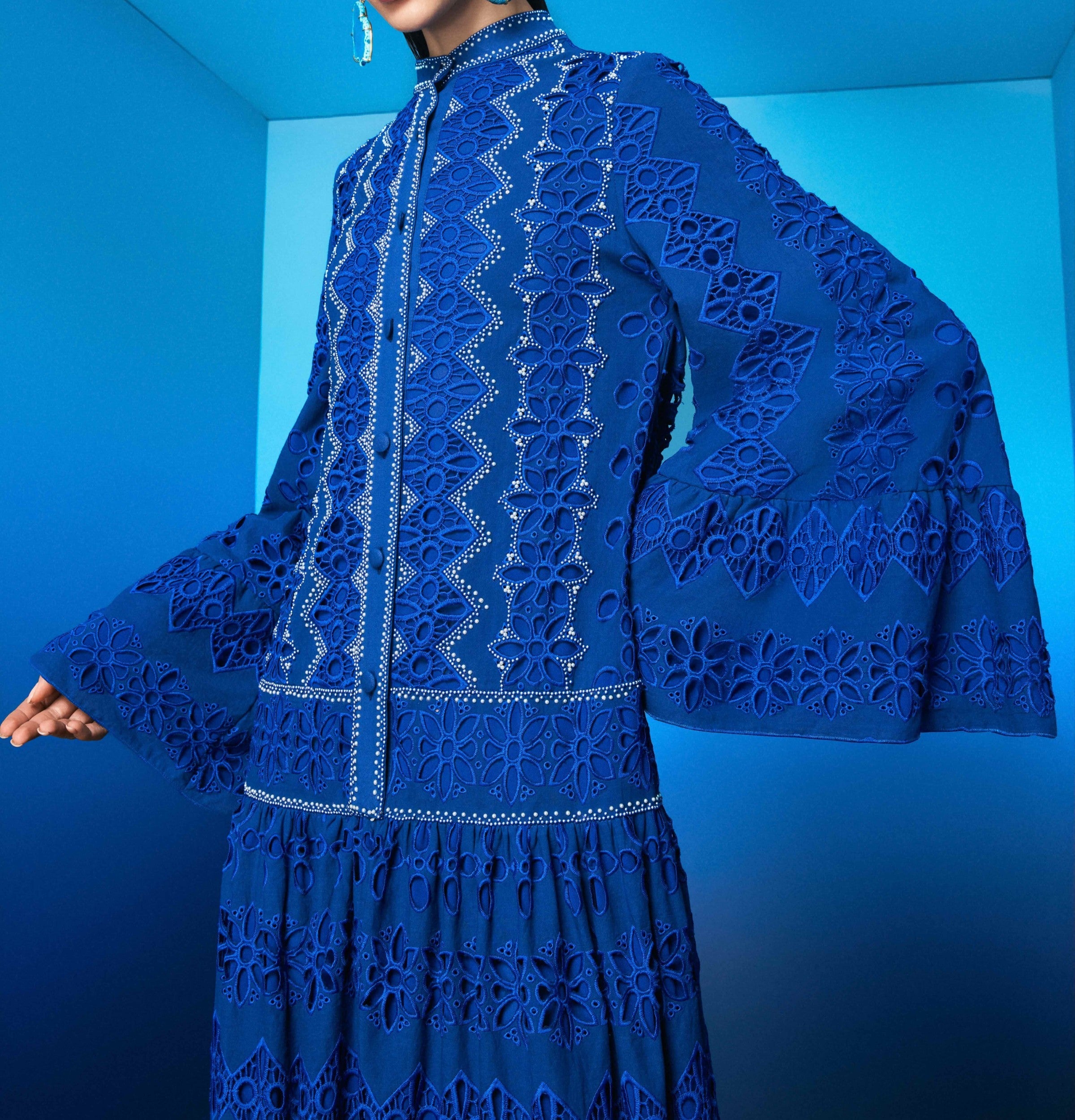 - A long deep blue cotton crochet gown with kimono sleeves, softly draped