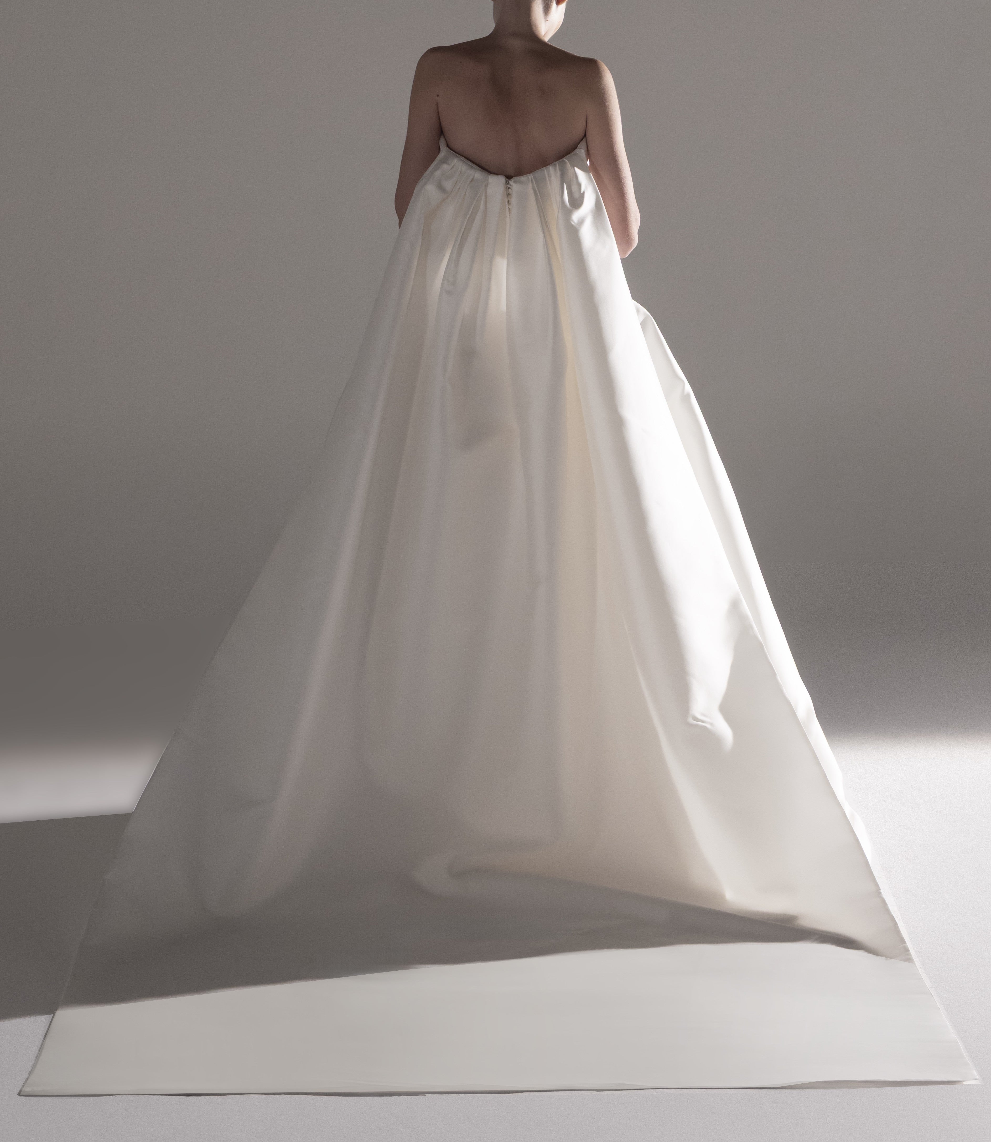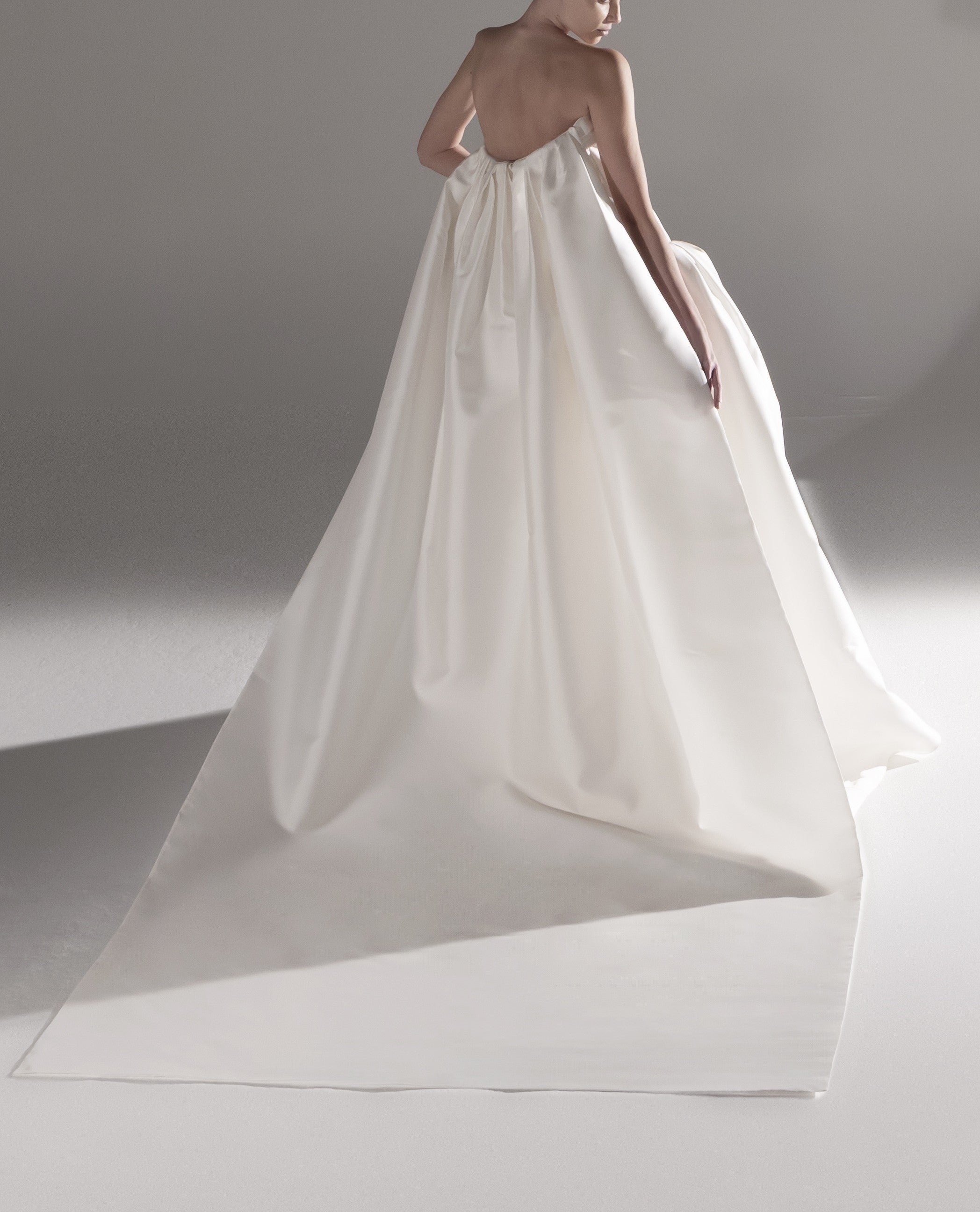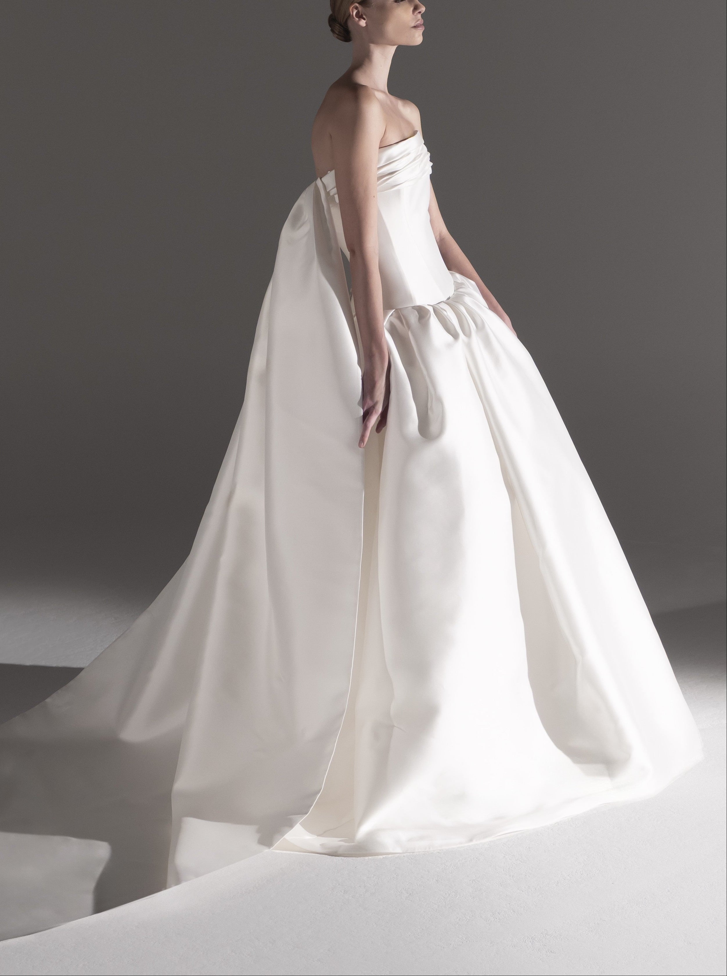 - This exquisite white gown drapes elegantly, showcasing a sophisticated, minimalist design. The luxurious fabric flows to create a dramatic train, exuding grace and refined beauty ideal for a memorable occasion.