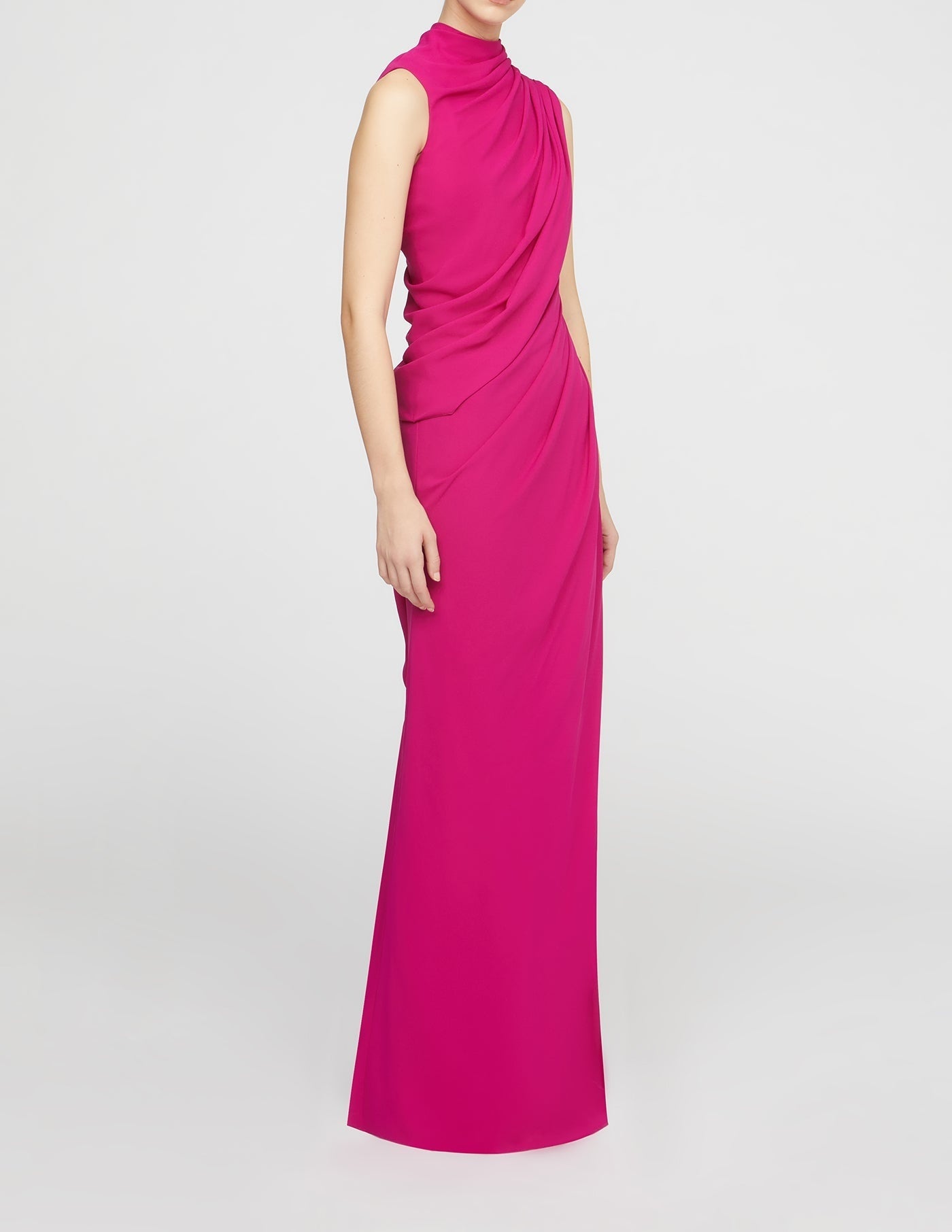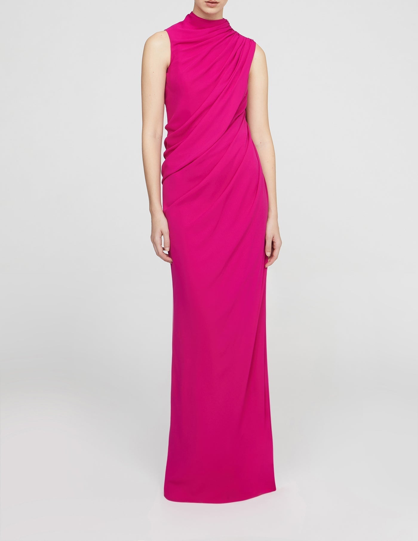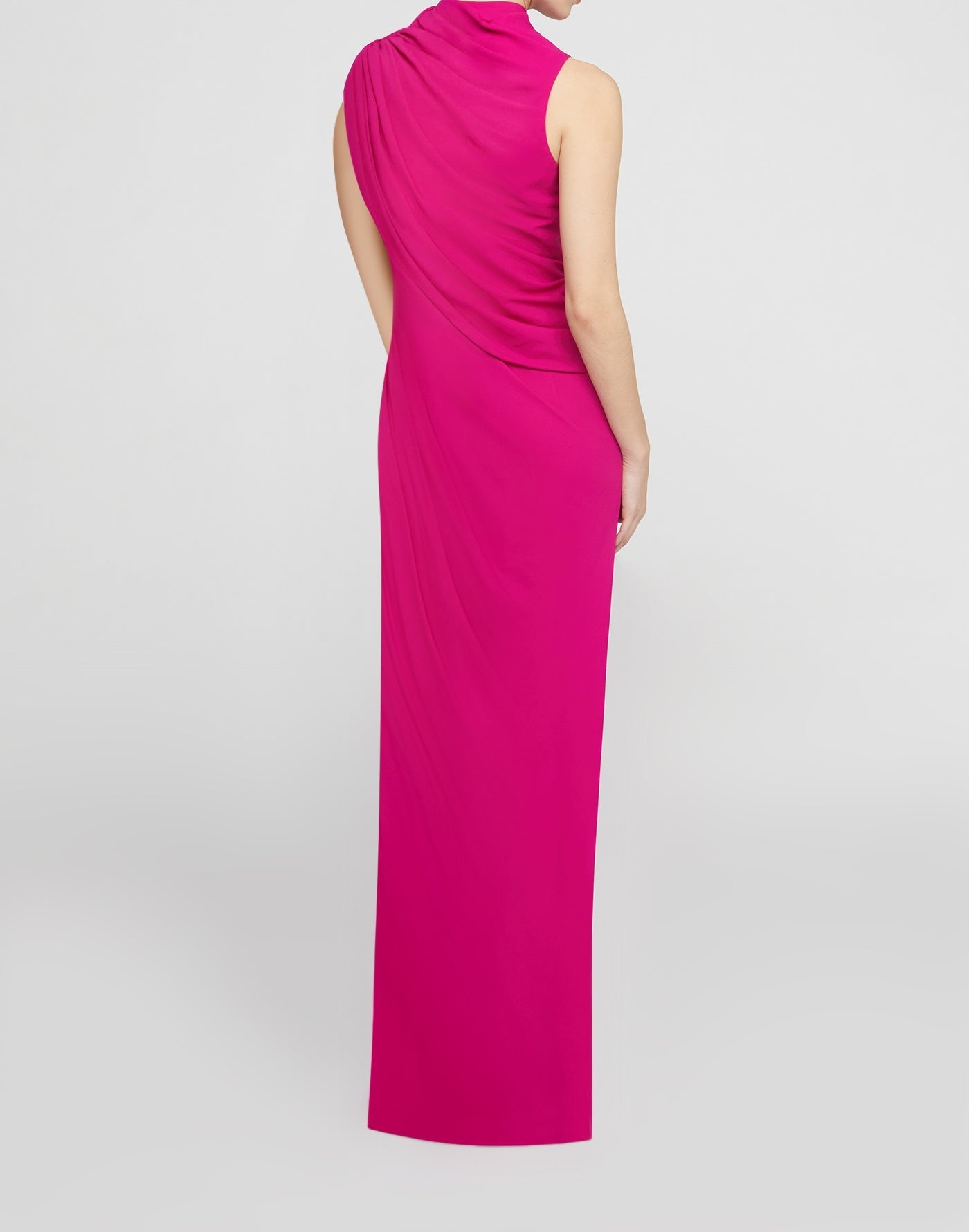 Sleek georgette gown with gathered draping that curves softly across the bodice and skirt. Designed with a high neckline and asymmetrical pleats for subtle sculpting. A refined pick for galas, black-tie receptions, and evening affairs.