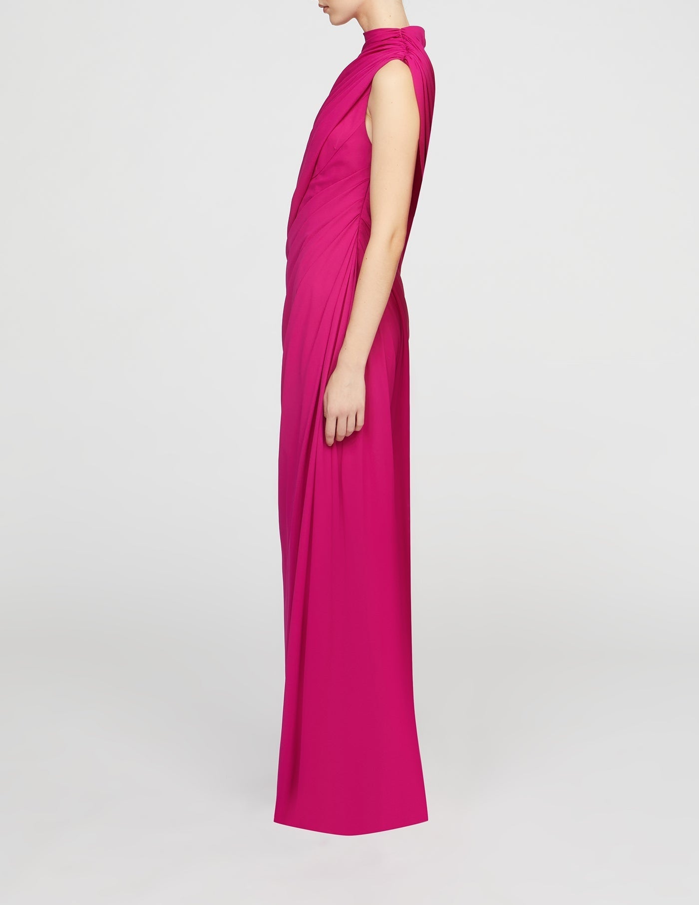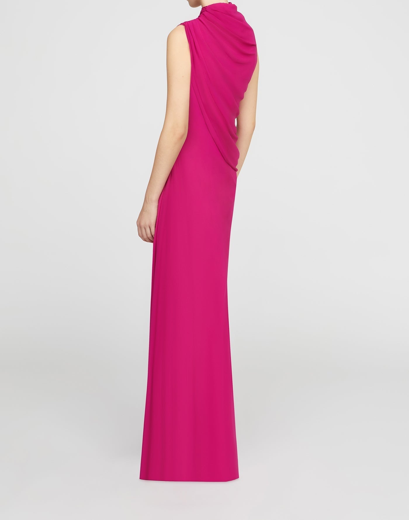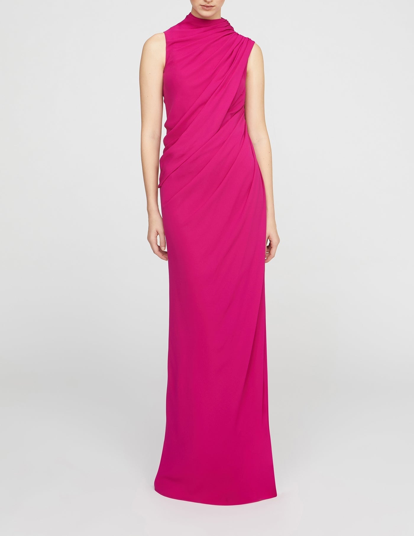 Sleek georgette gown with gathered draping that curves softly across the bodice and skirt. Designed with a high neckline and asymmetrical pleats for subtle sculpting. A refined pick for galas, black-tie receptions, and evening affairs.