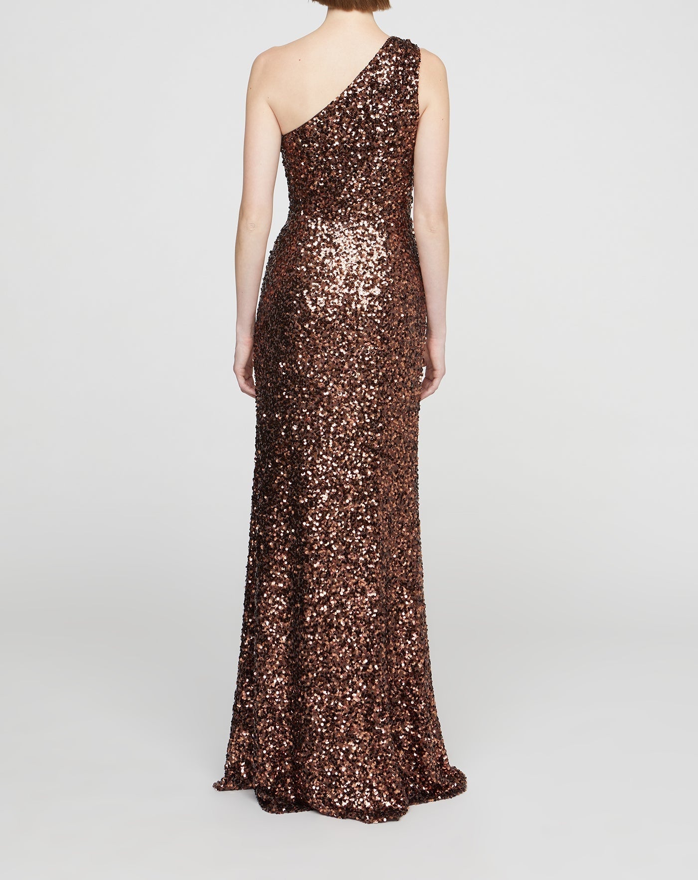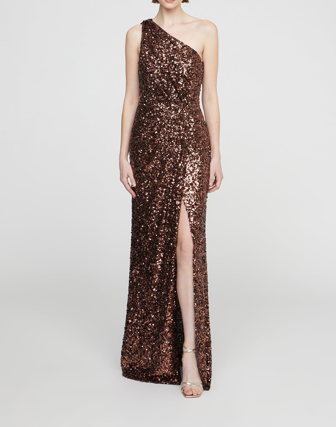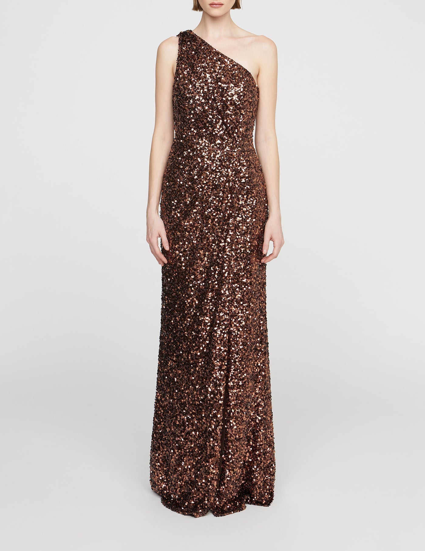 Fully drenched in multi-toned sequins, this one-shoulder gown shines with a sculpted fit and angled neckline that highlights the collarbone. Finished with a soft flare and floor-length hem—ready for black-tie galas, winter weddings, or a red carpet moment.