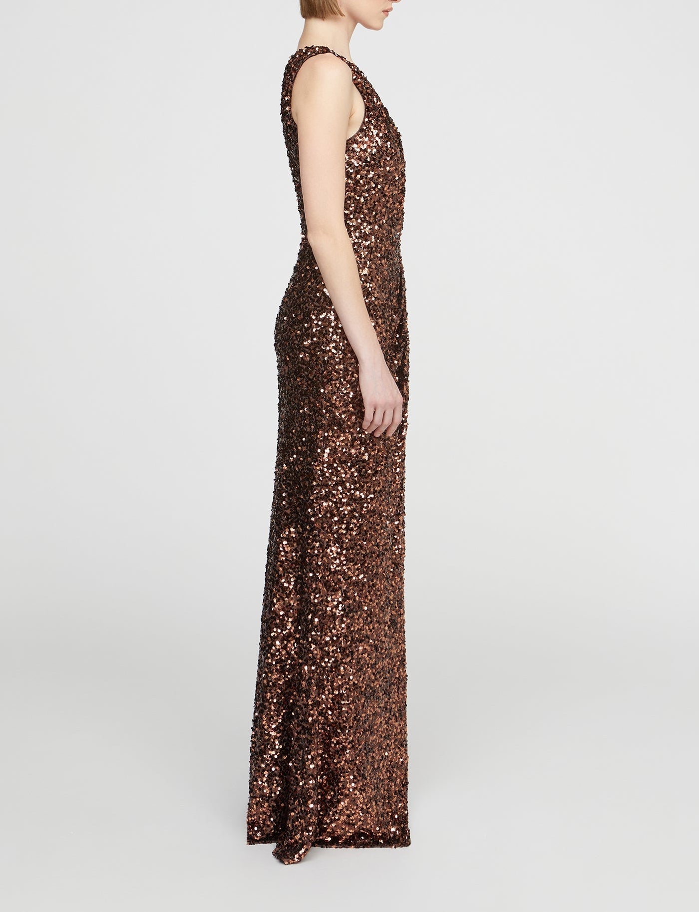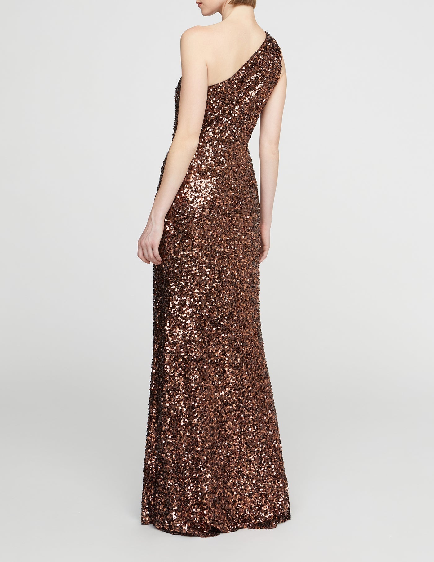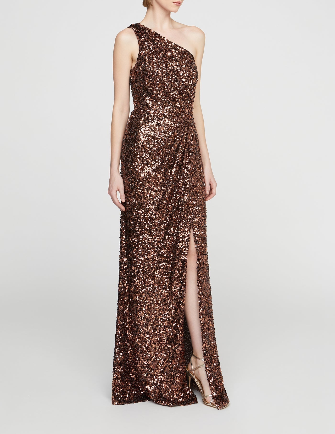 Fully drenched in multi-toned sequins, this one-shoulder gown shines with a sculpted fit and angled neckline that highlights the collarbone. Finished with a soft flare and floor-length hem—ready for black-tie galas, winter weddings, or a red carpet moment.