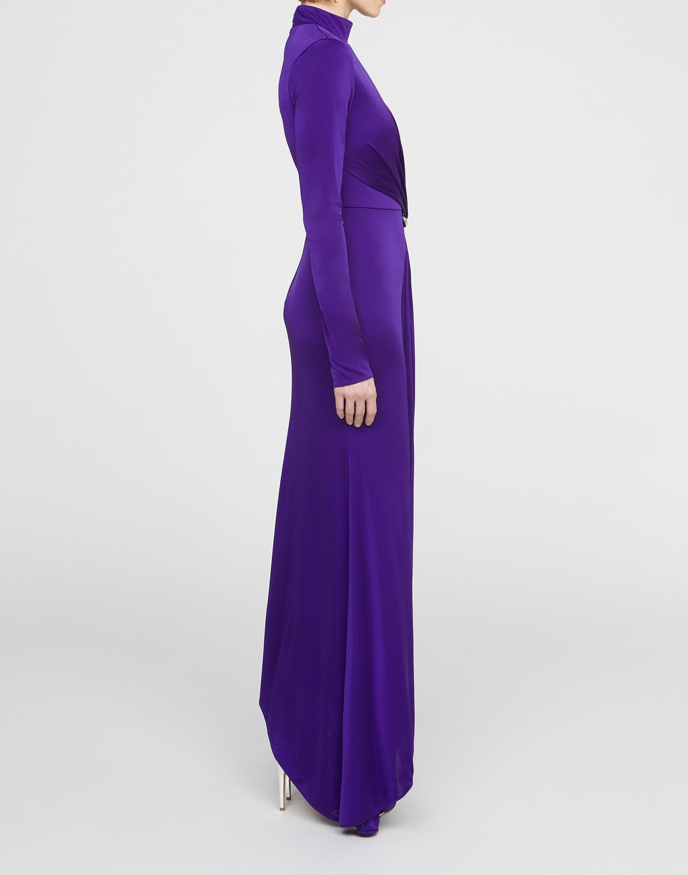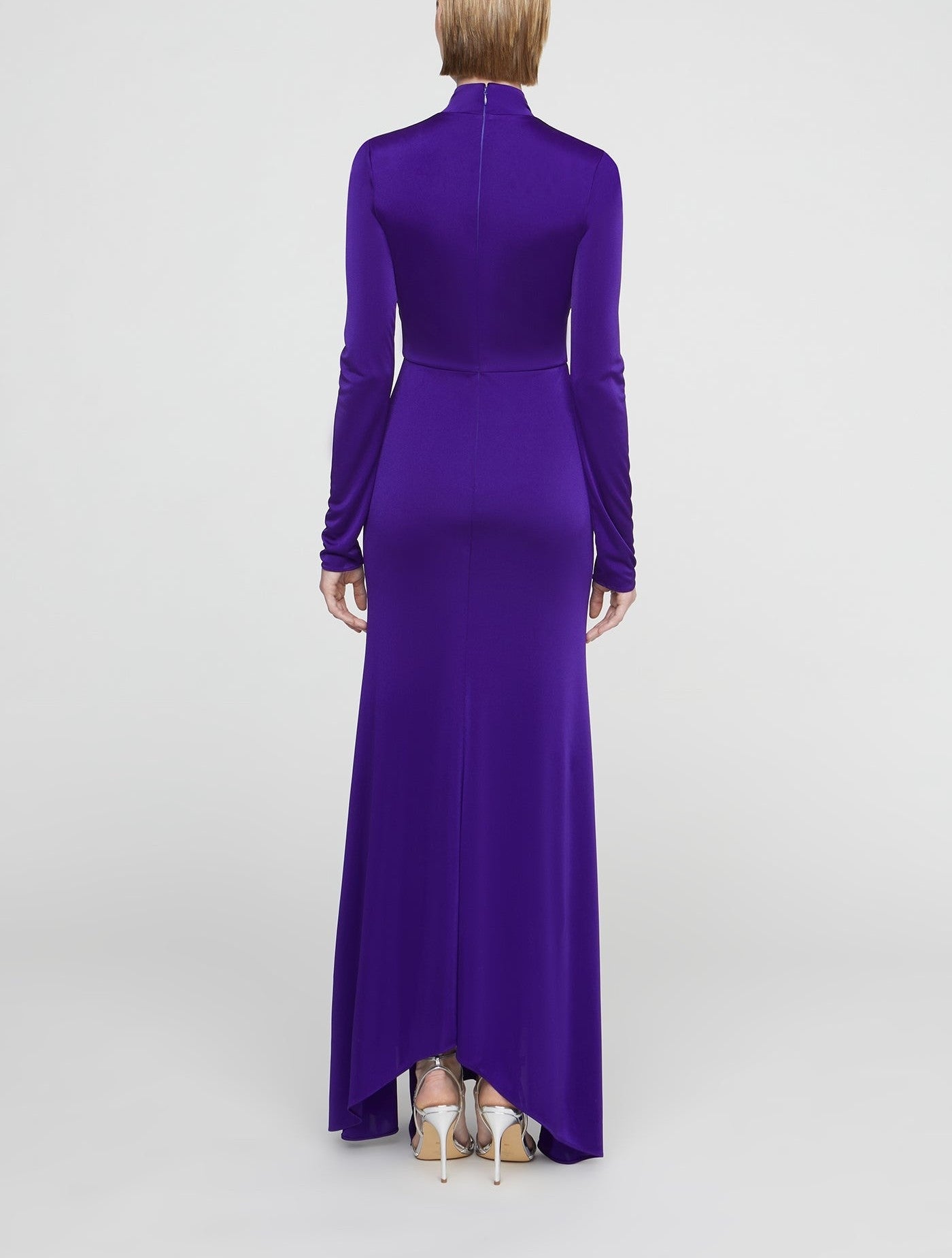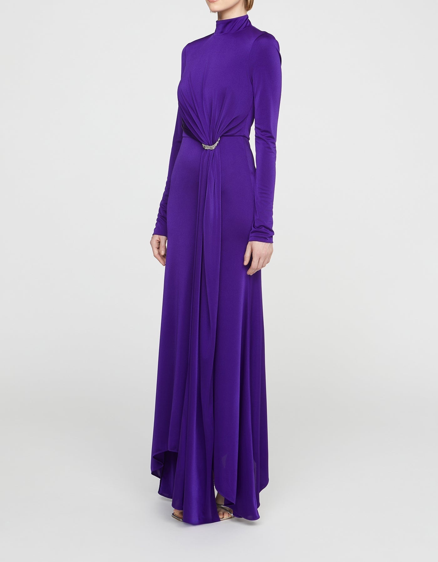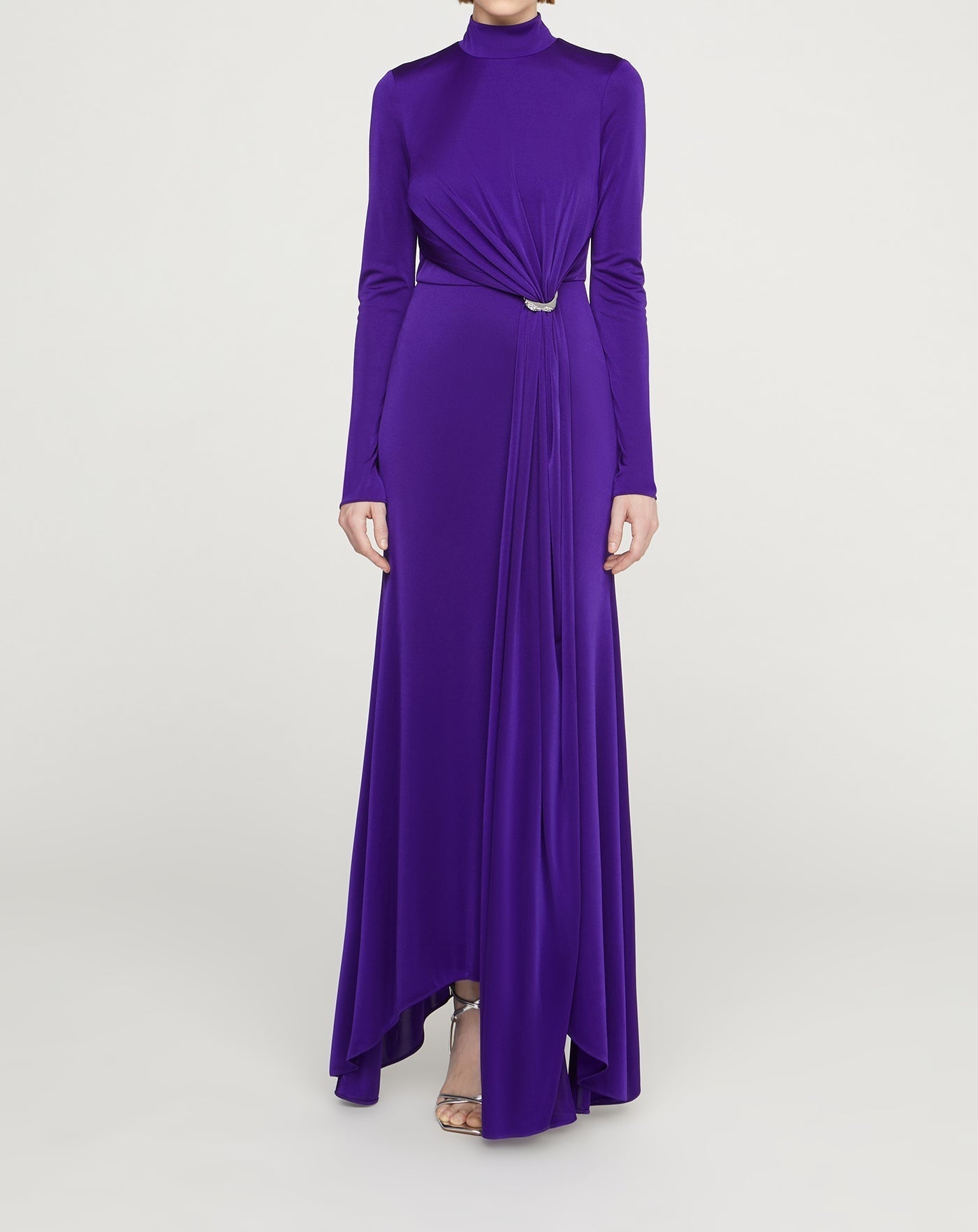 Gloss jersey gown with long sleeves, a high neckline, and sculptural draping gathered by custom metal hardware. The high-low hem adds movement—perfect for winter galas, dinners, or any after-dark invite.