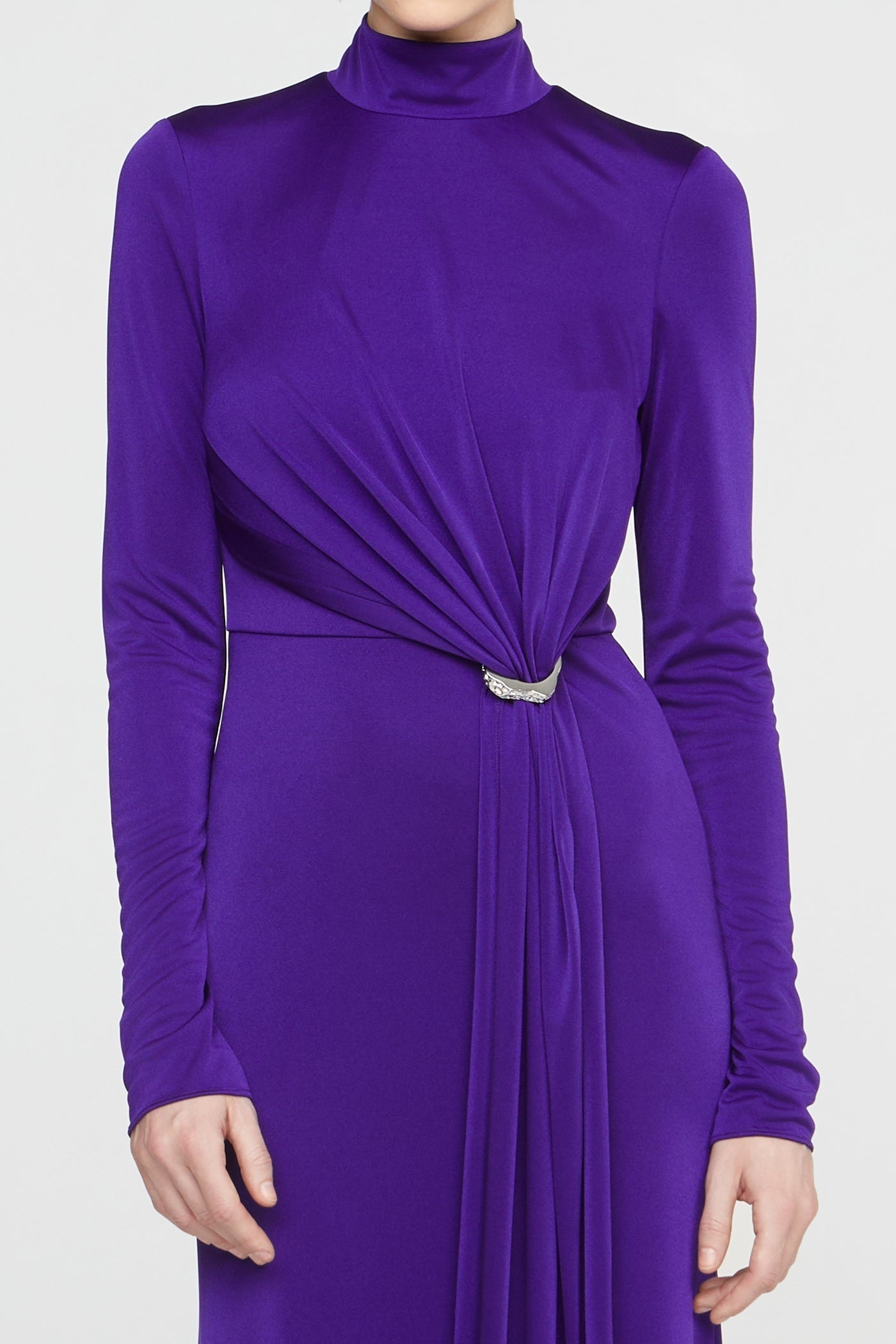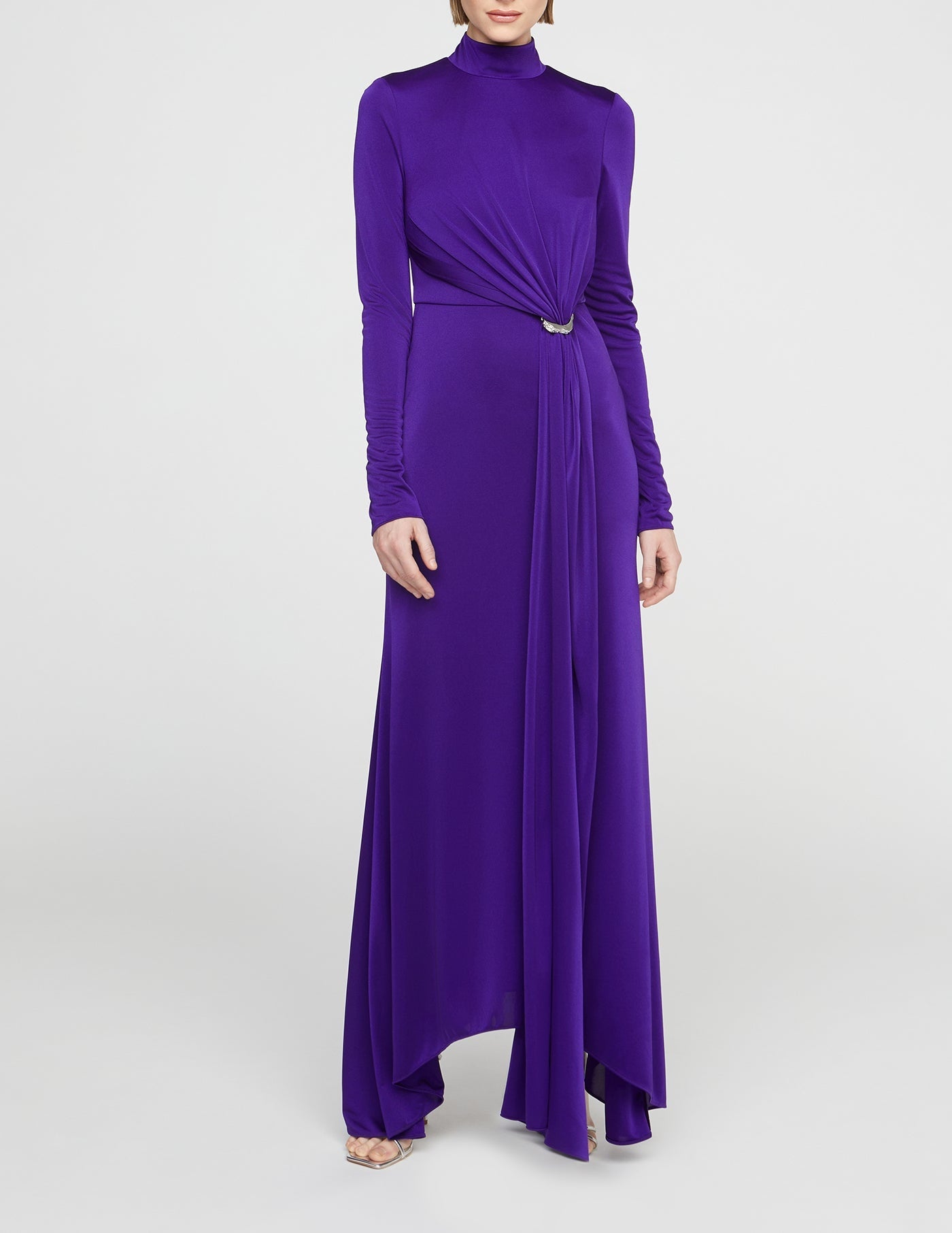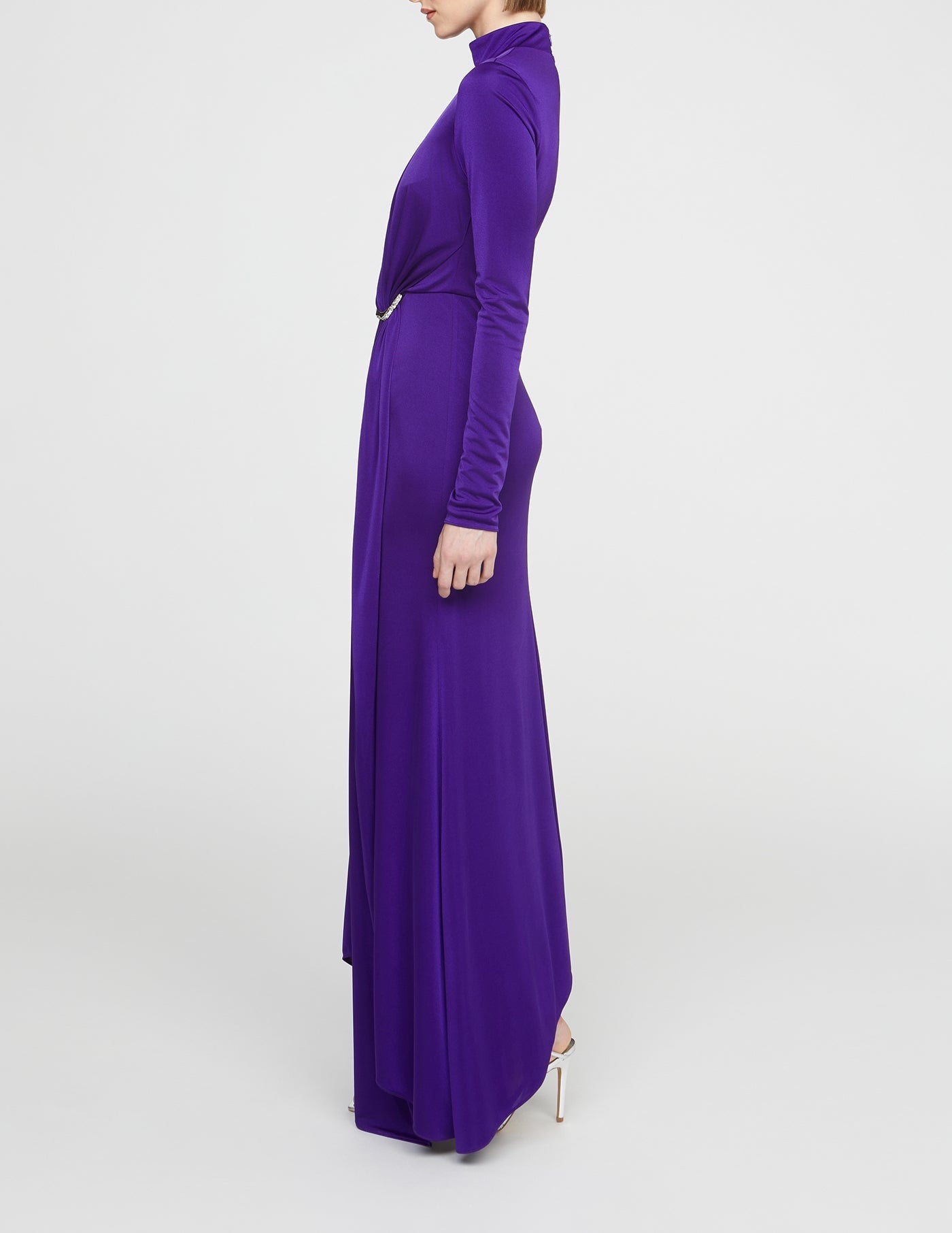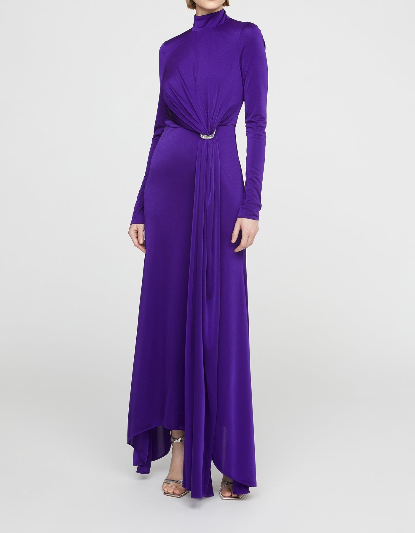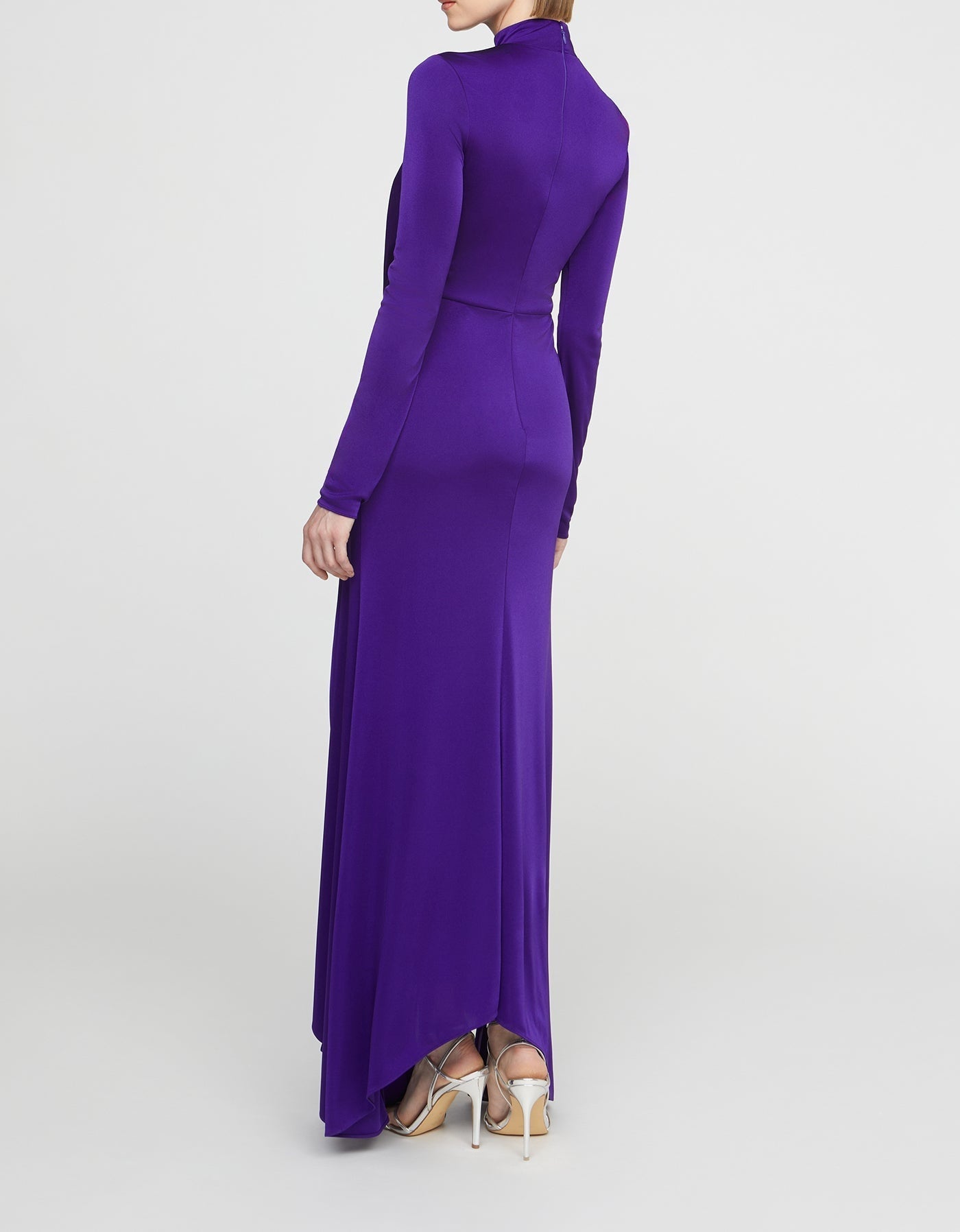 Gloss jersey gown with long sleeves, a high neckline, and sculptural draping gathered by custom metal hardware. The high-low hem adds movement—perfect for winter galas, dinners, or any after-dark invite.