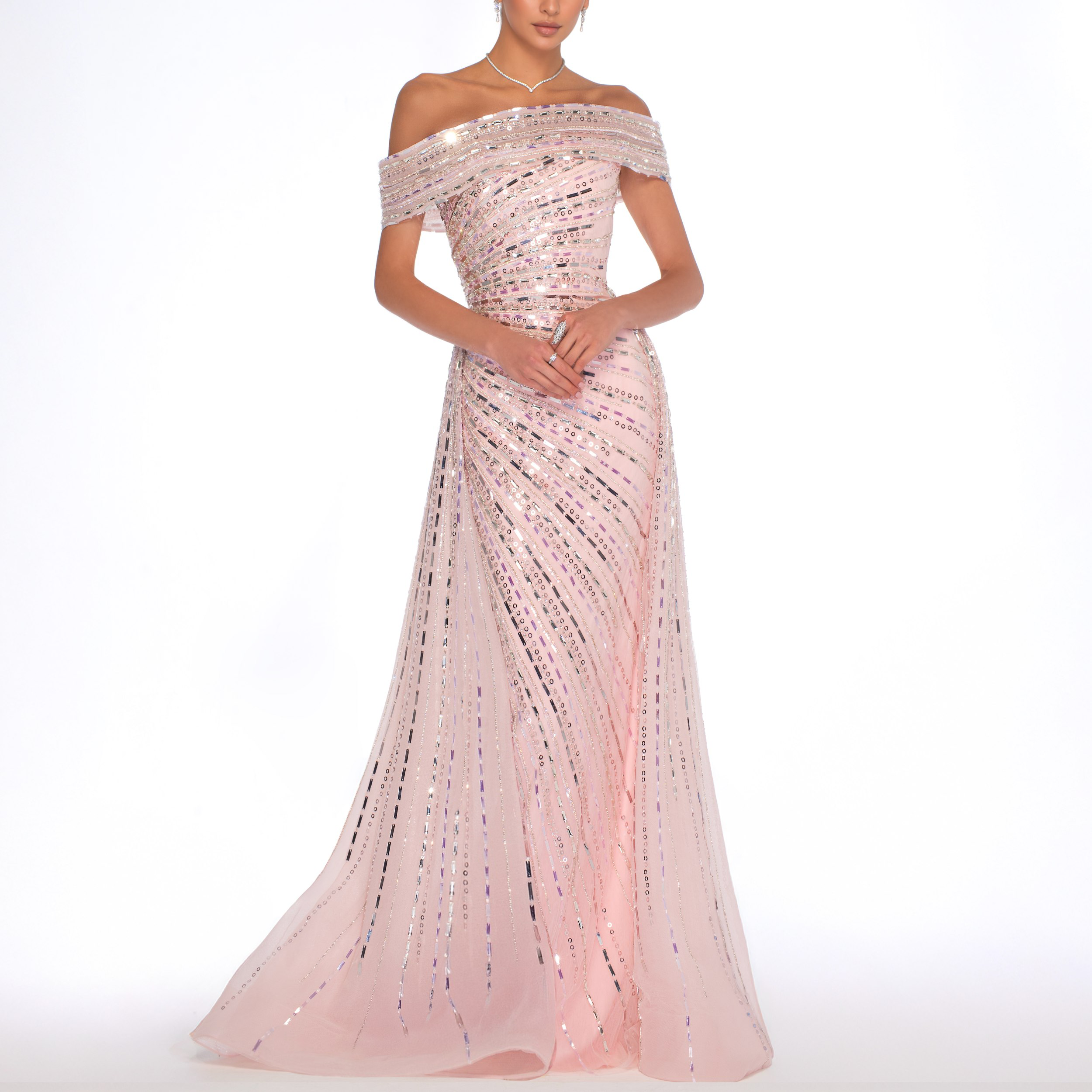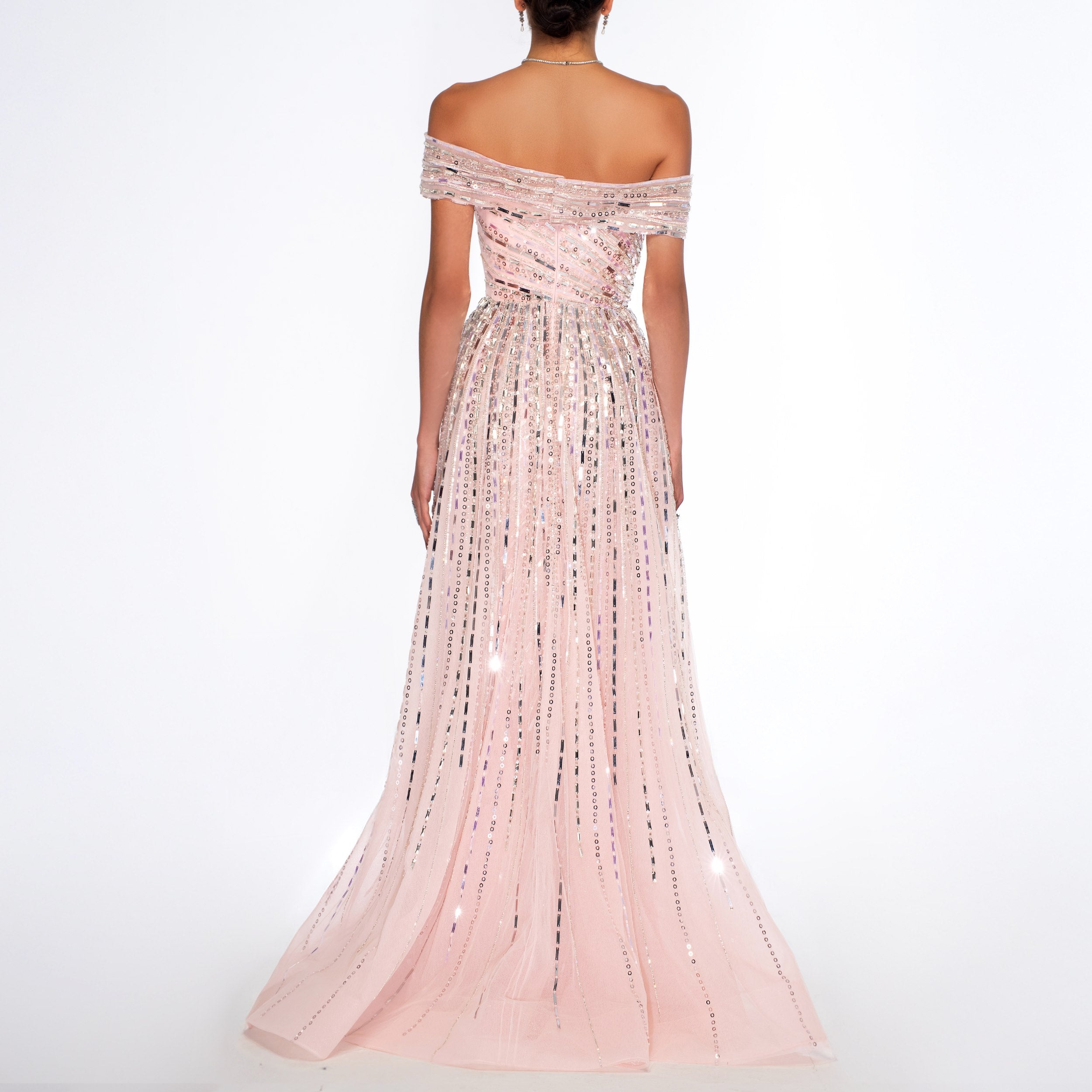 A fitted embellishment gown with an asymmetrical off-shoulder neckline, structured bodice, silver-toned embroidery, sequins, and a flowing overskirt.