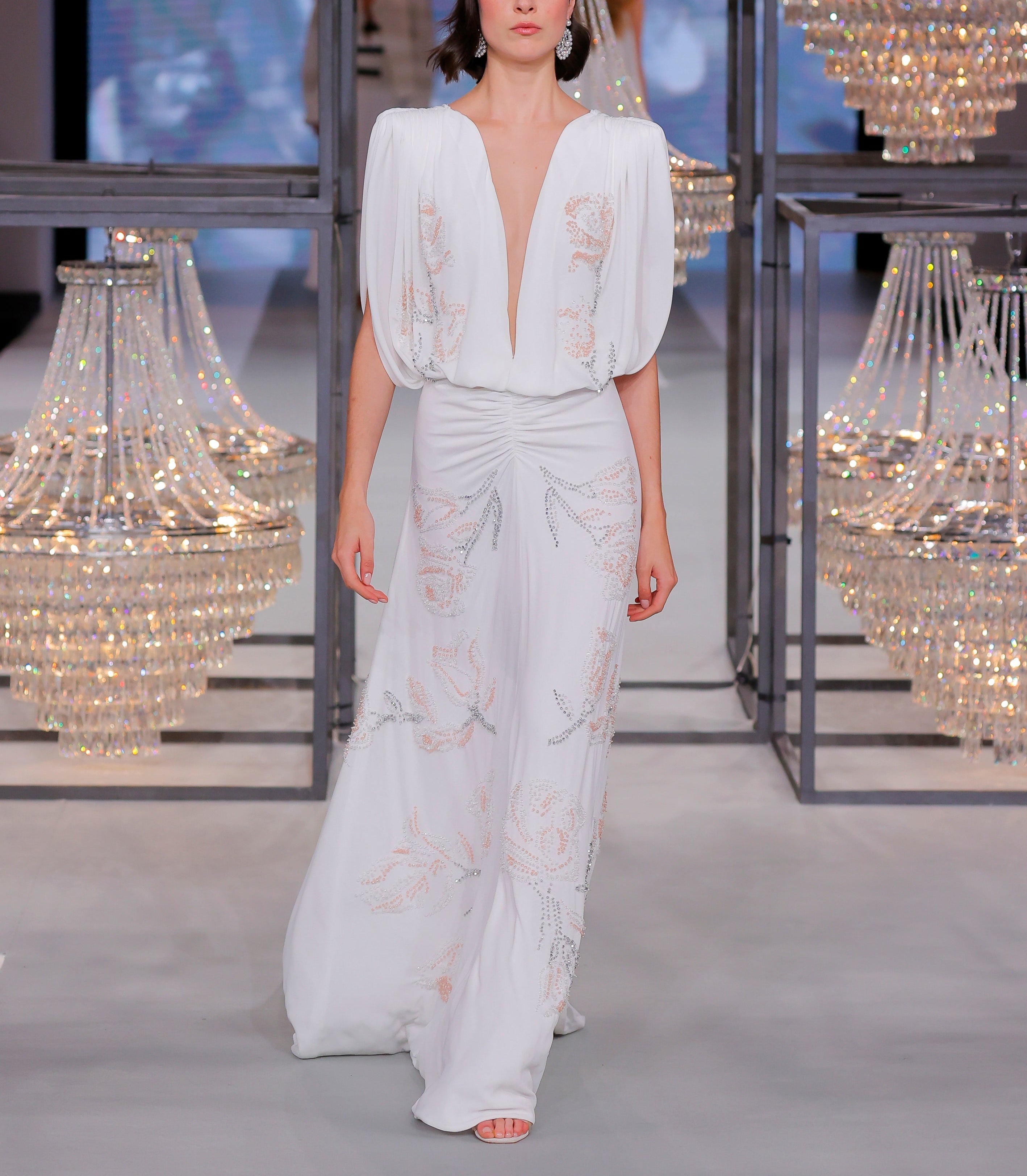 • Embroidery: Crystal floral motifs on each side of the bust and scattered around the skirt