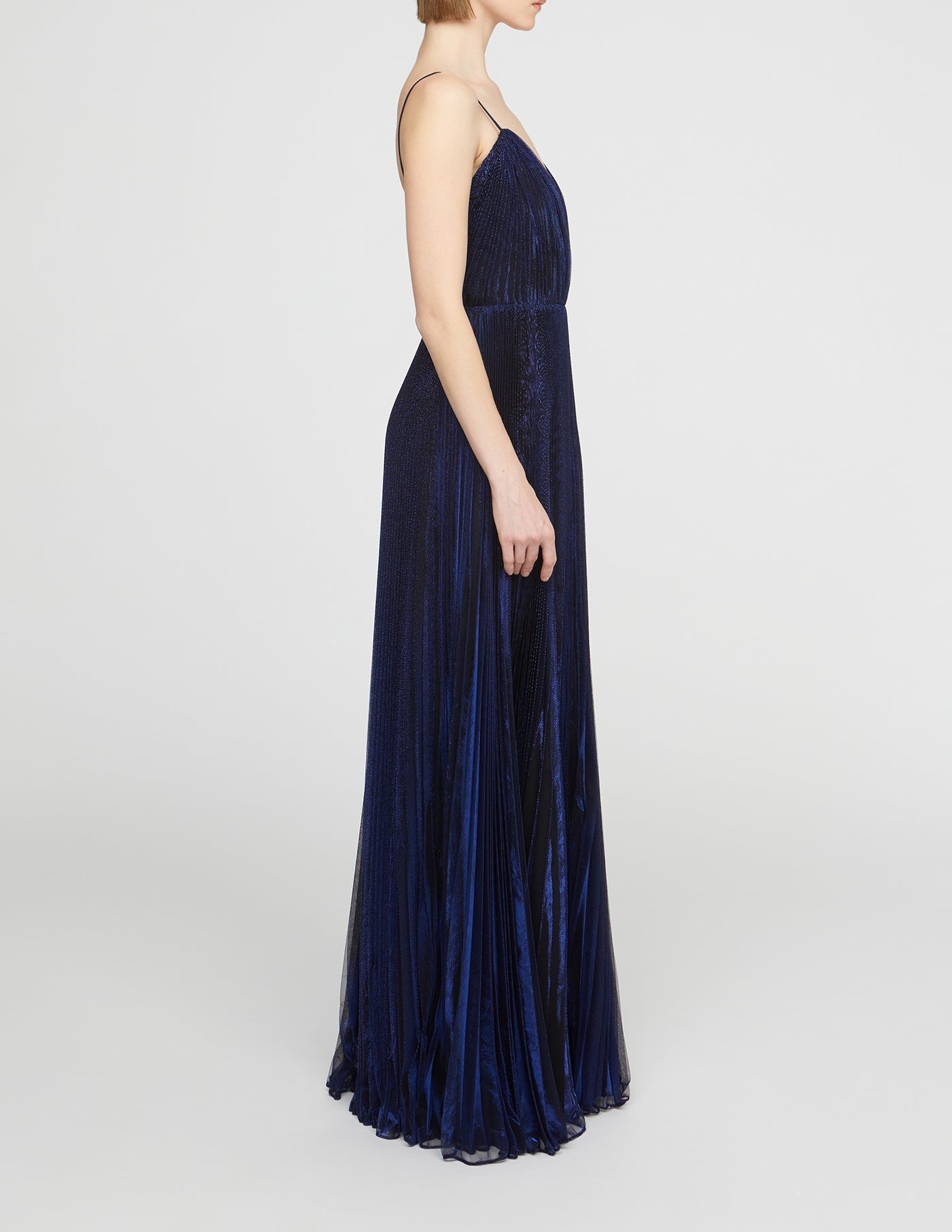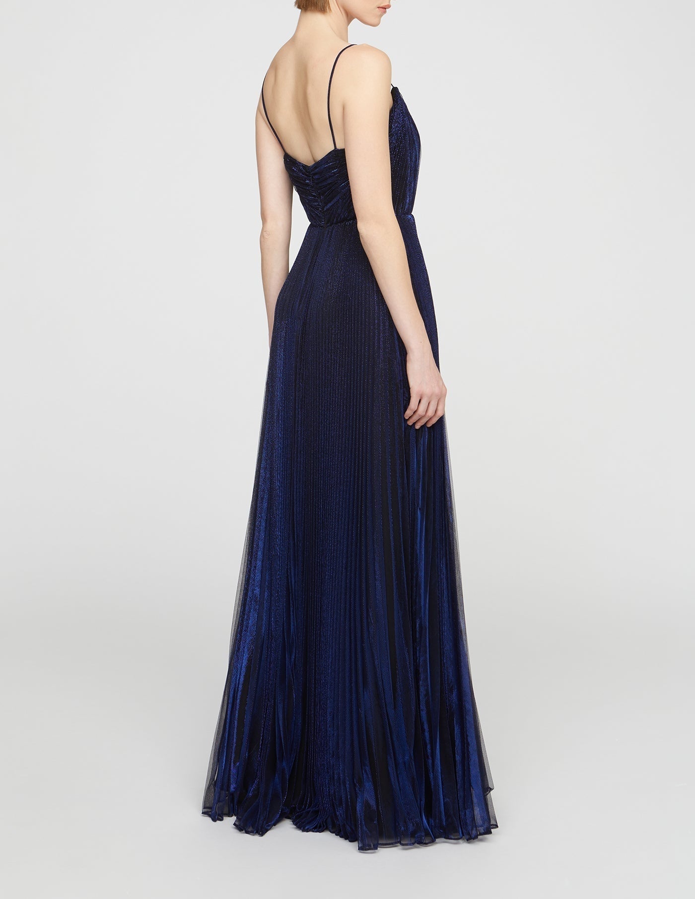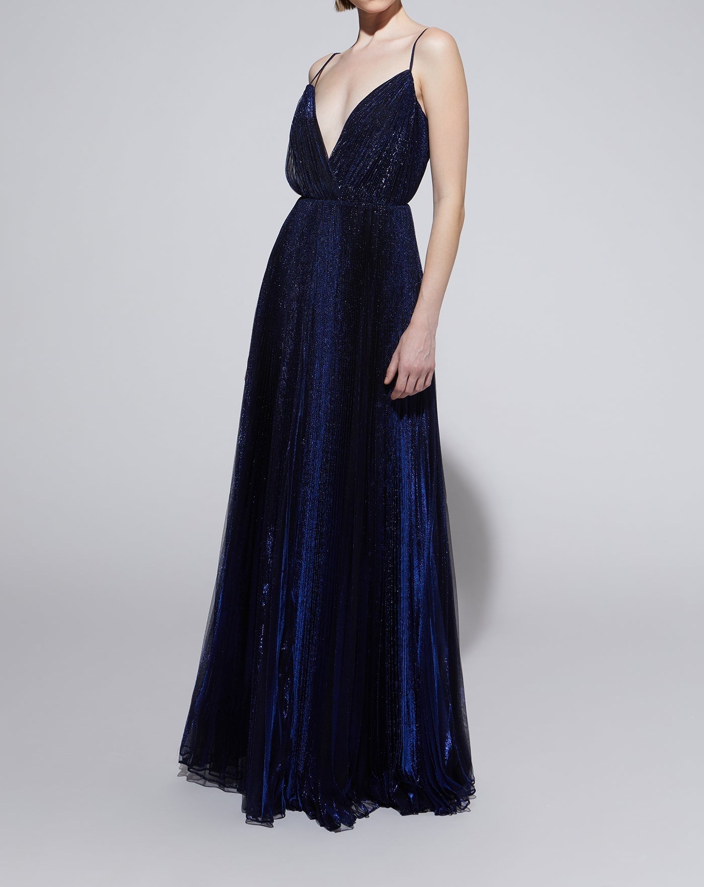 Crystal pleated gown in shimmering navy jersey. Soft and fluid with all-over texture and shine; an easy win for black-tie events.