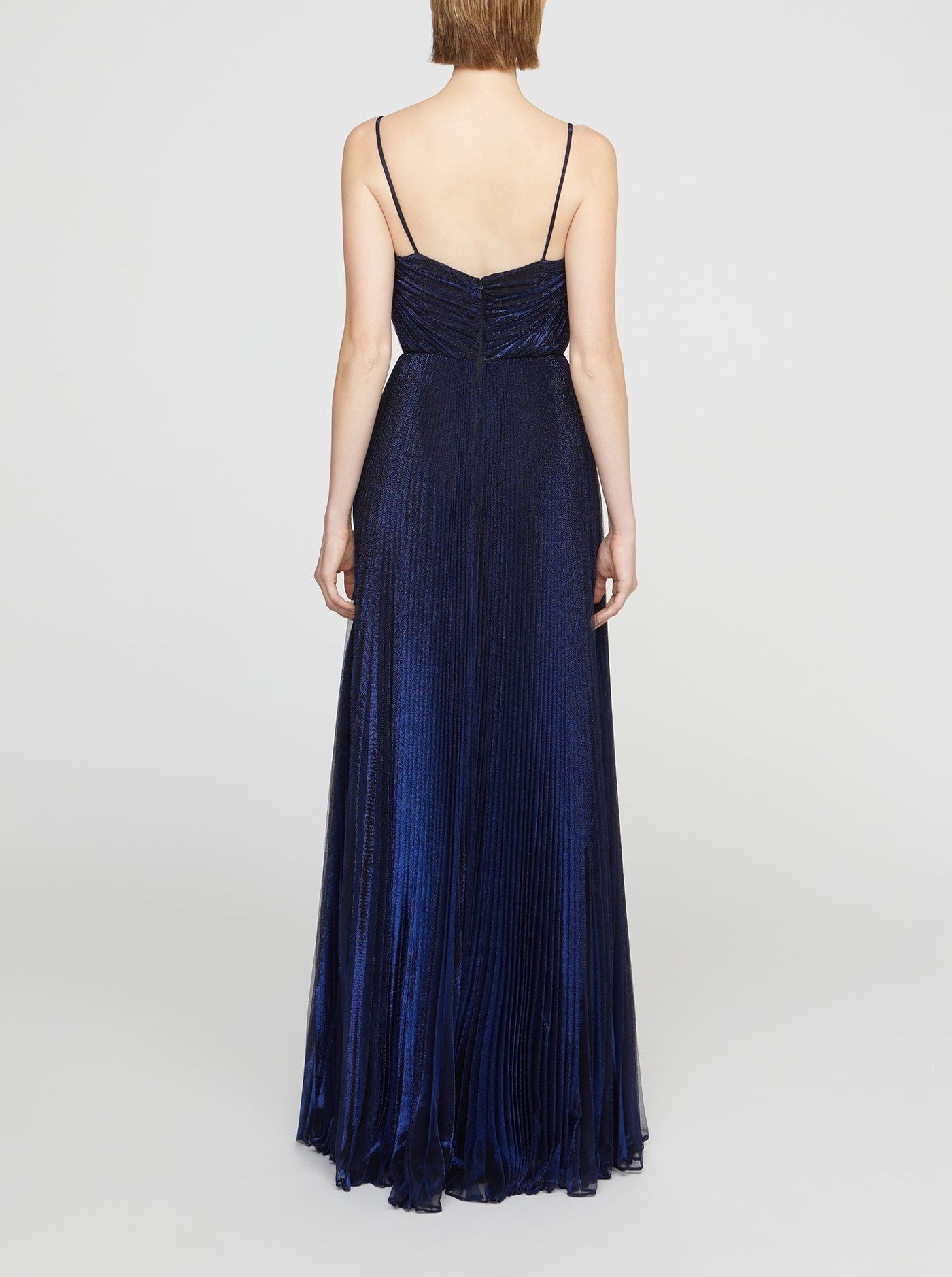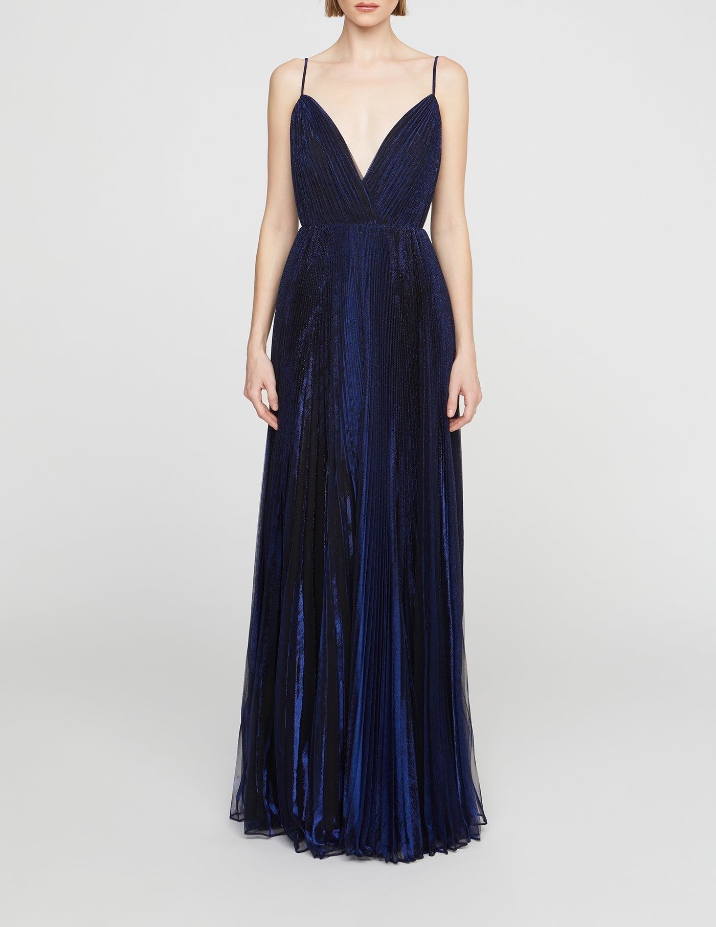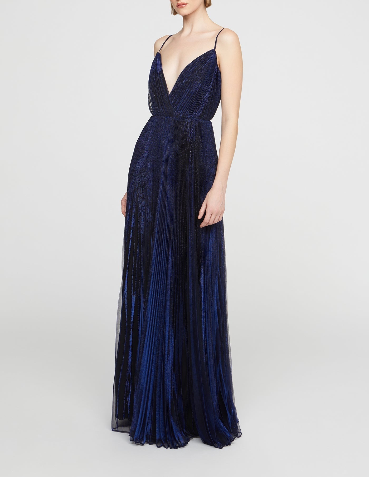 Crystal pleated gown in shimmering navy jersey. Soft and fluid with all-over texture and shine; an easy win for black-tie events.