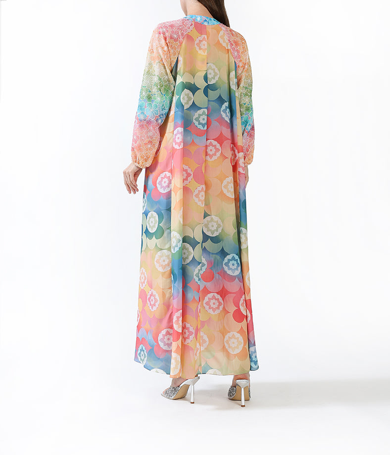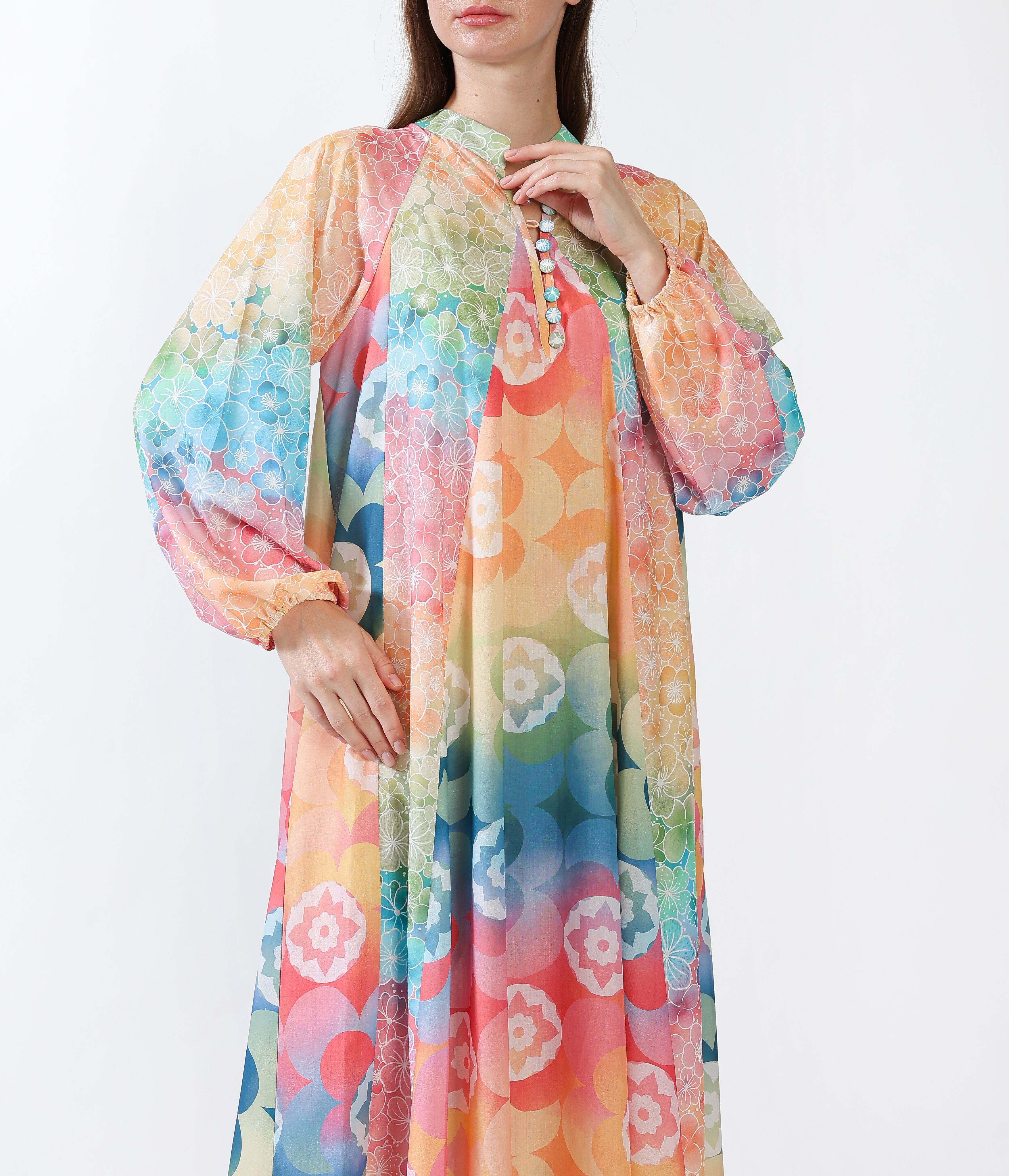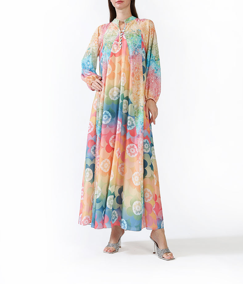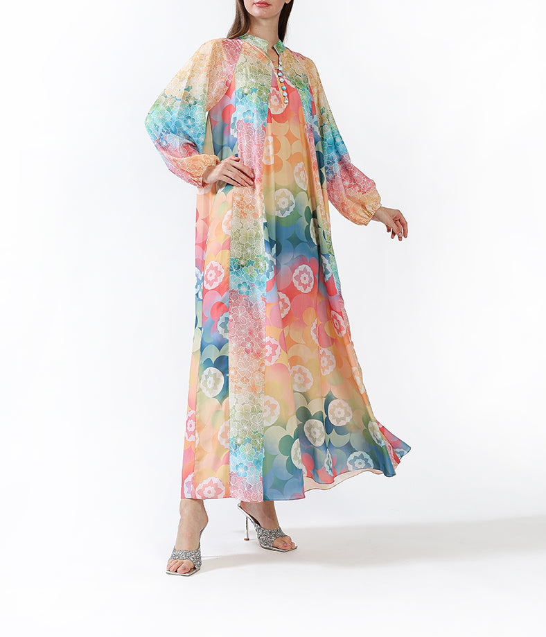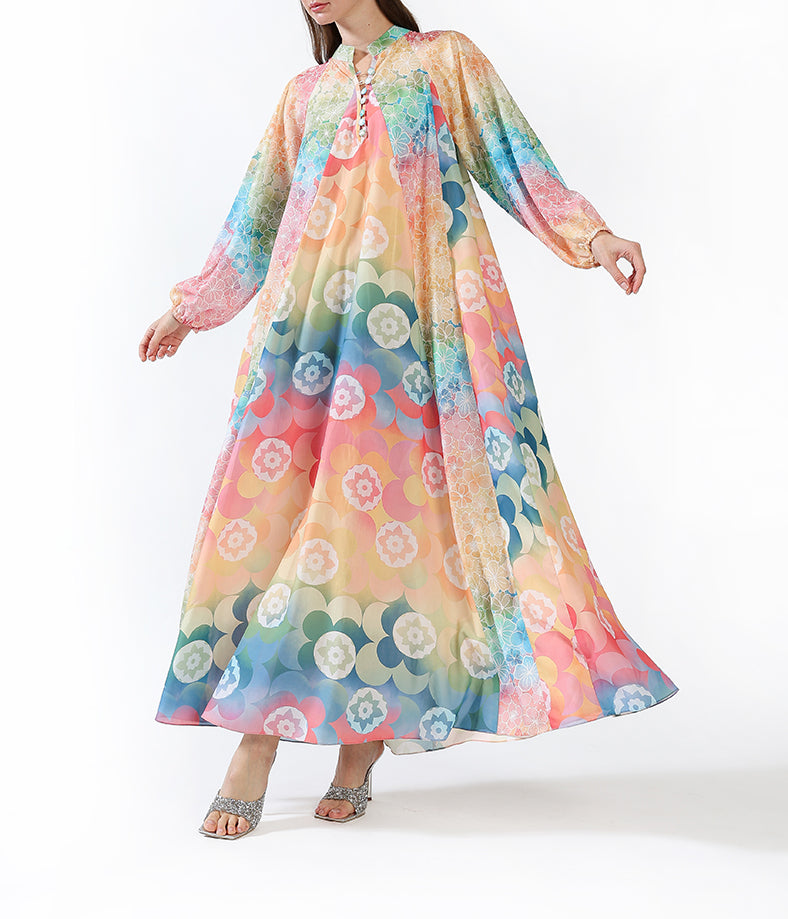To Highlight The Intricate Moonflower Prints, Keep Accessories Minimal But Striking Think Bold Gold Jewelry Or Subtle Metallics. Pair With Elegant Heels Or Sandals For A Balanced Look. A Simple, Clean Makeup Look With A Touch Of Shimmer On The Eyes Will Complement The Piece's Vibrant Colors. The Hood Adds A Unique, Fashionable Touch, Making This Jalabeya Perfect For Both Formal And Festive Occasions. -