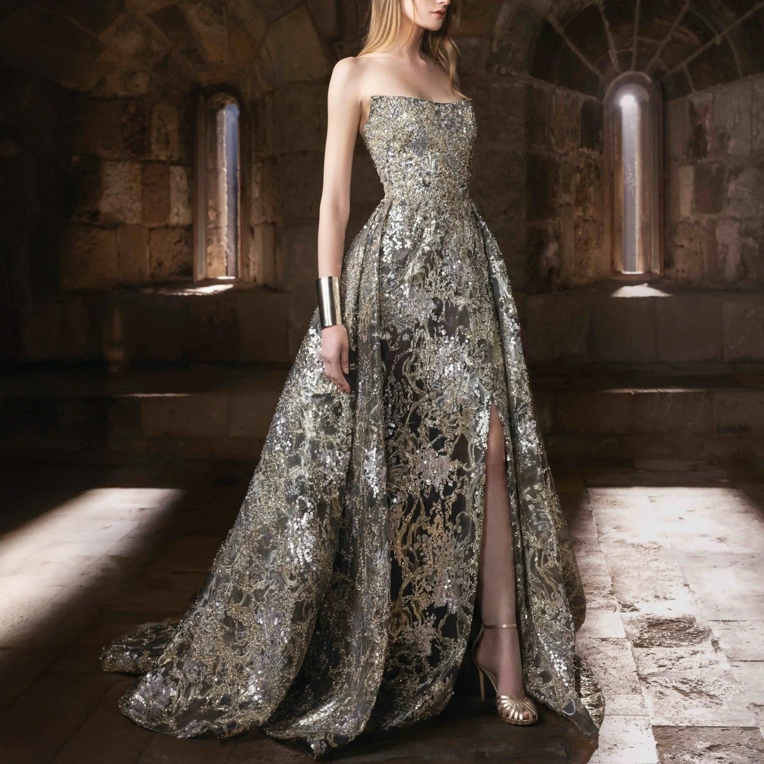- A strapless black gown with a dramatic overskirt, high slit, and silver and gold embroidery. The crystal-embellished bodice and sequined details add shimmering volume.