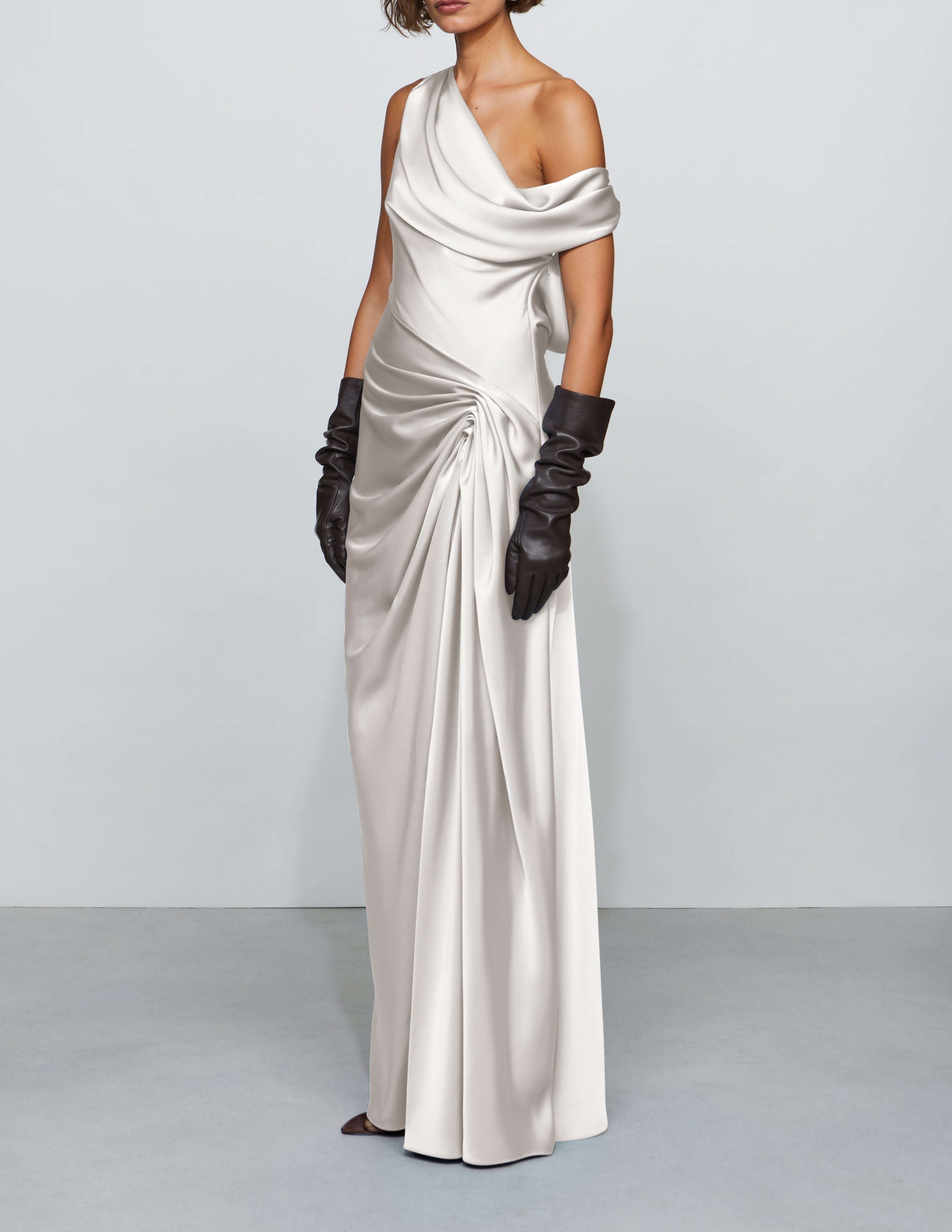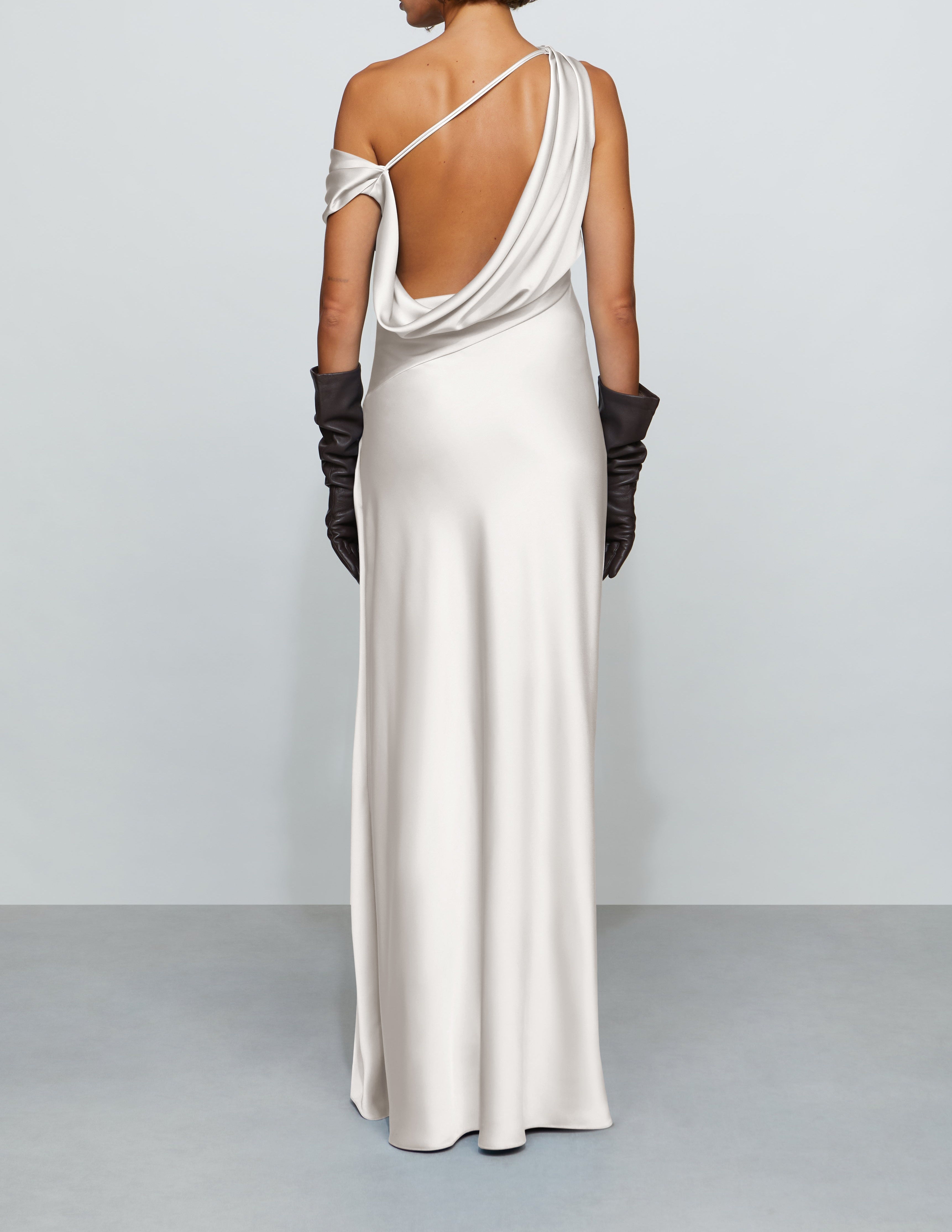 Double-faced satin gown with an asymmetric cowl neckline, bold open back, and sculptural draping through the slit. With a liquid shine and strong lines, it’s a certified showstopper.