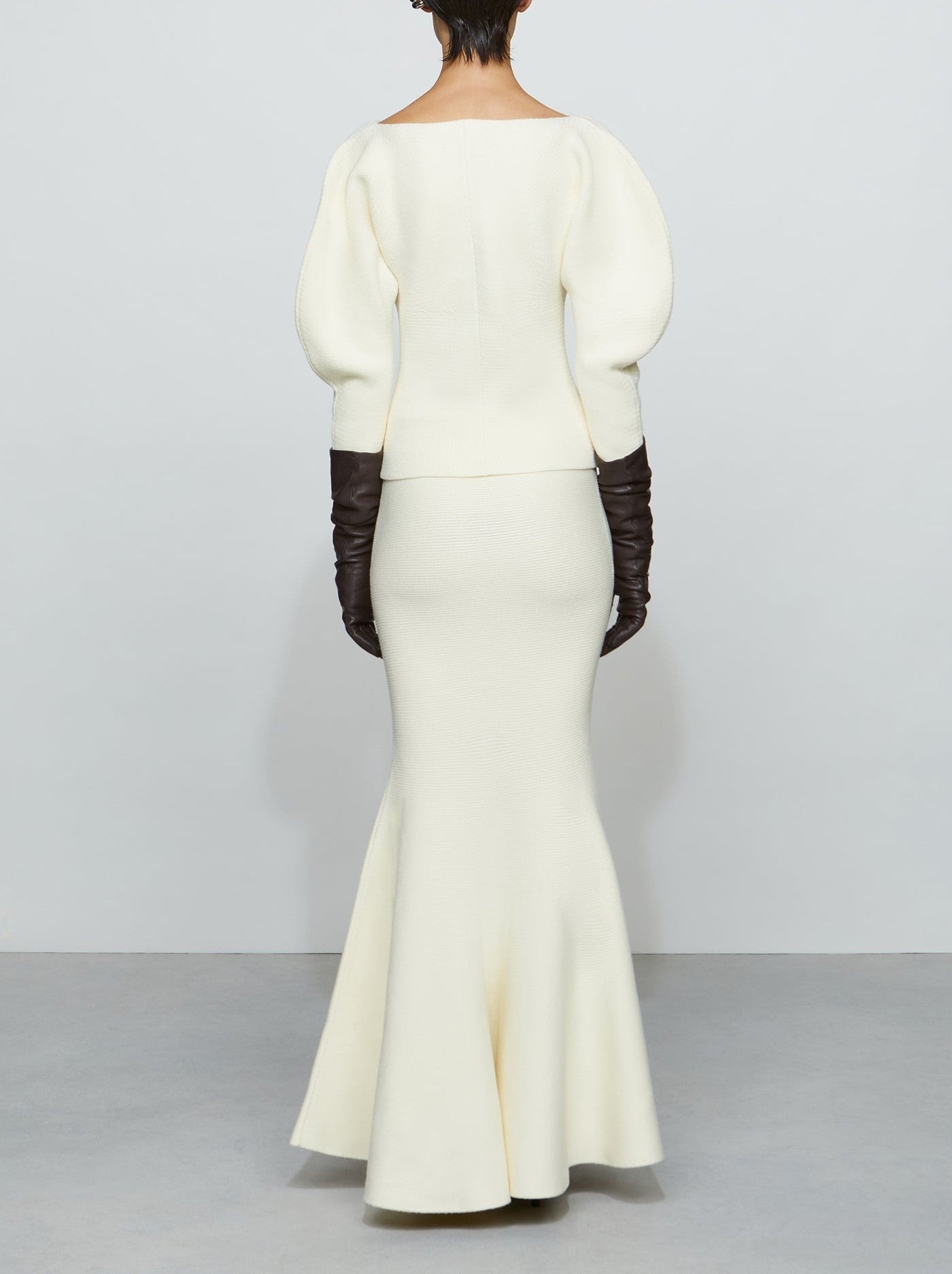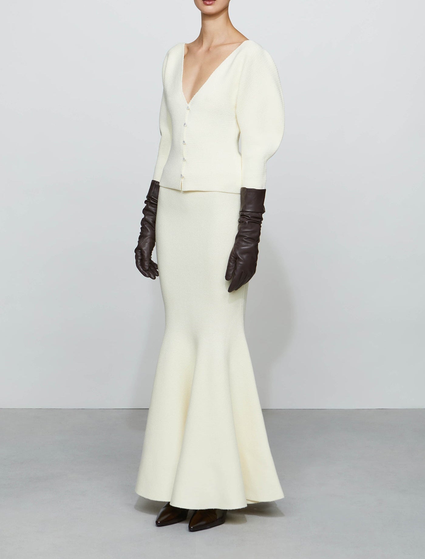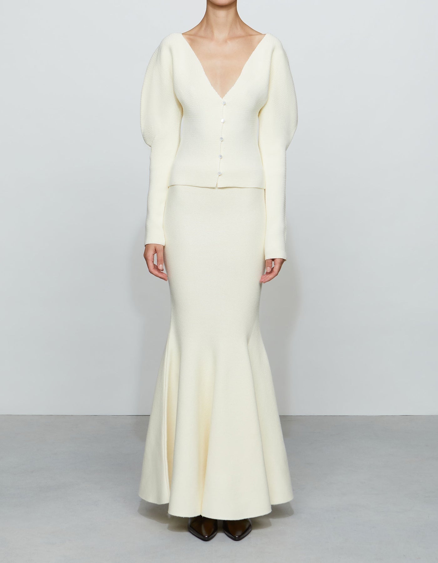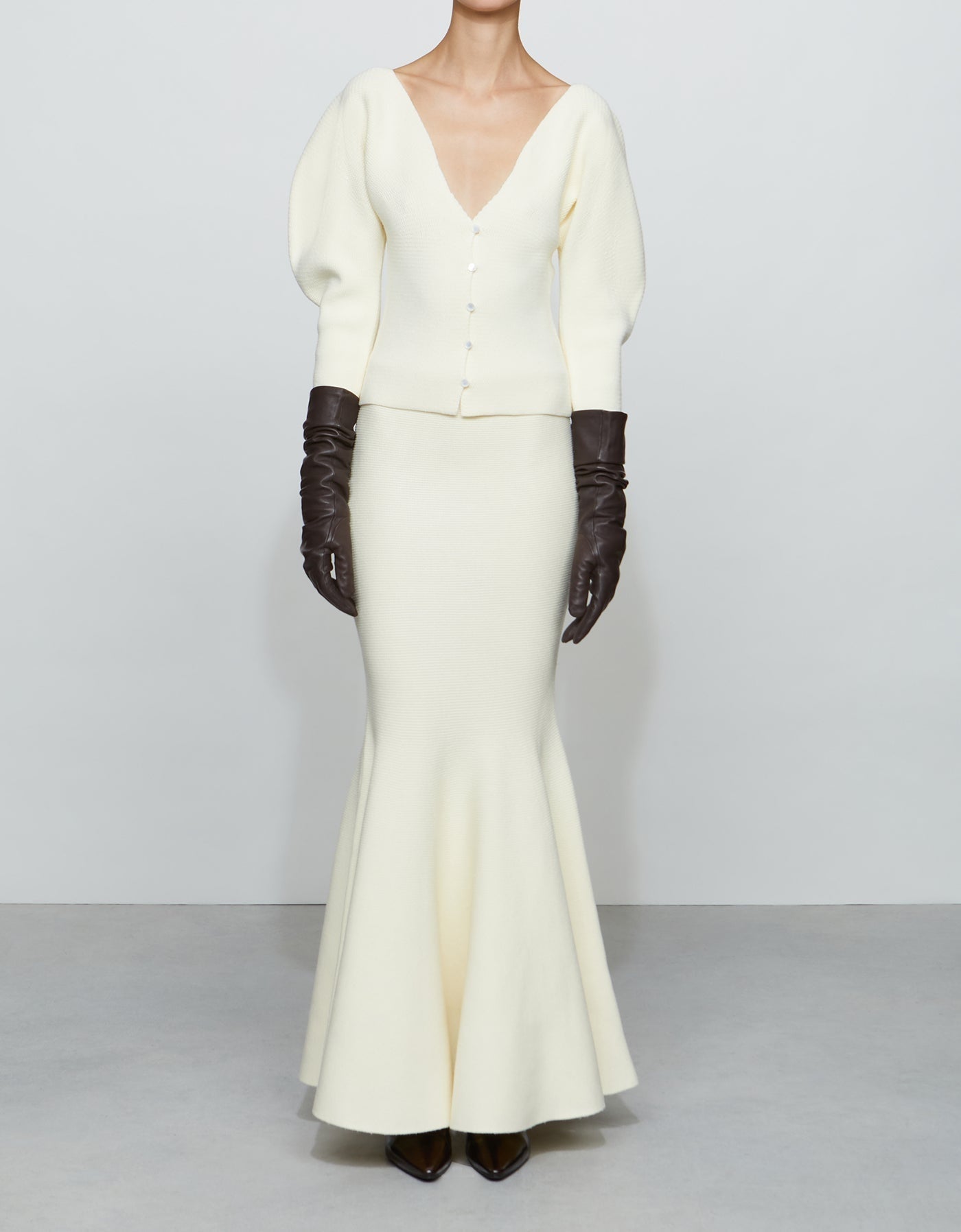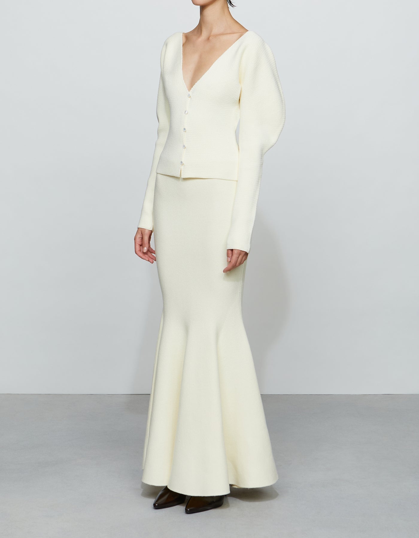 Pearl-button cardigan in sculpted knit with raw edges, voluminous long sleeves, and a deep V neckline. Substantial but soft, with just enough drama for the bridal brunch or holiday dinner.