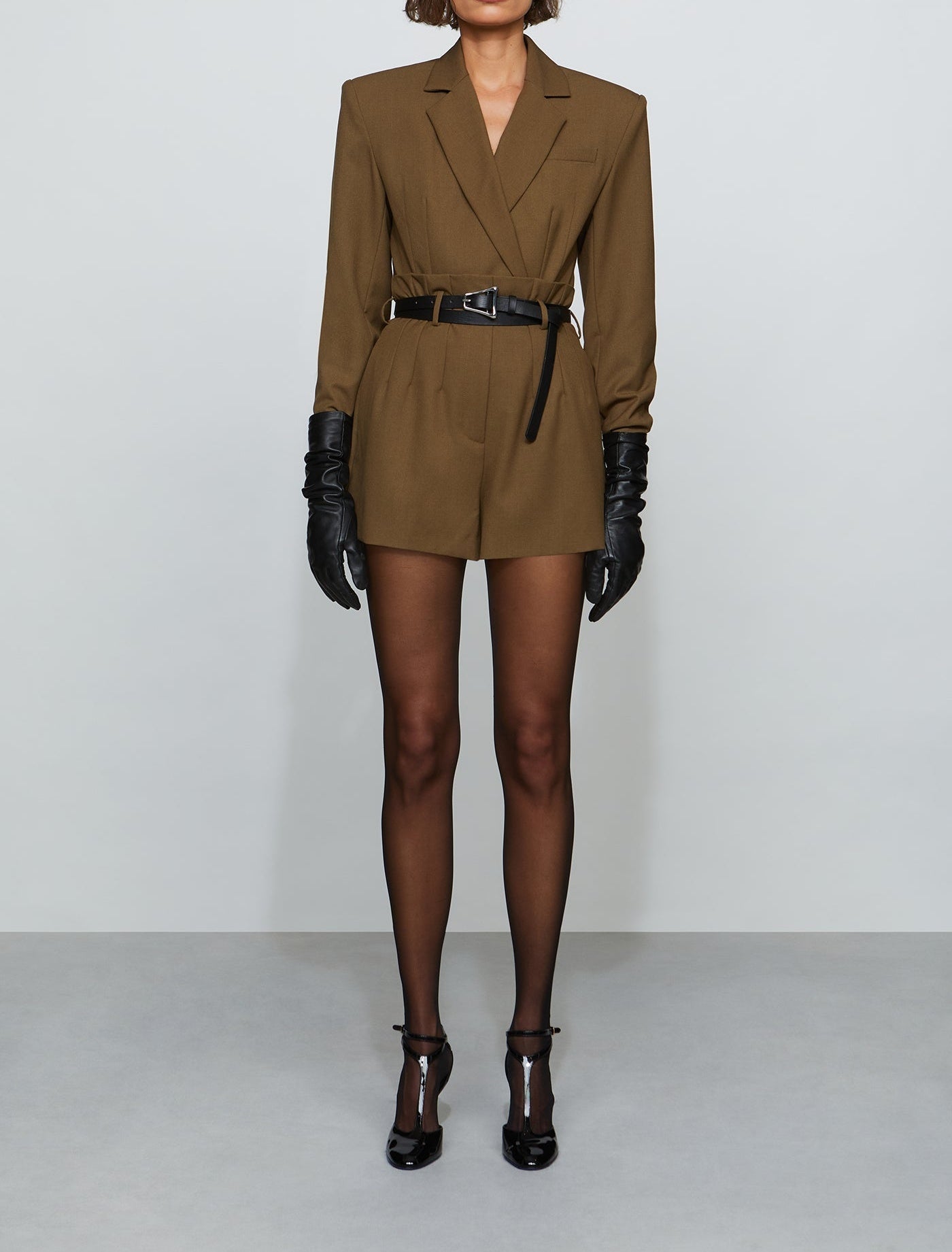 High-waisted twill suiting shorts with a sharp tailored fit. Finished with custom silver hardware and a double-wrap belt—style it with a chunky knit and boots or loafers.