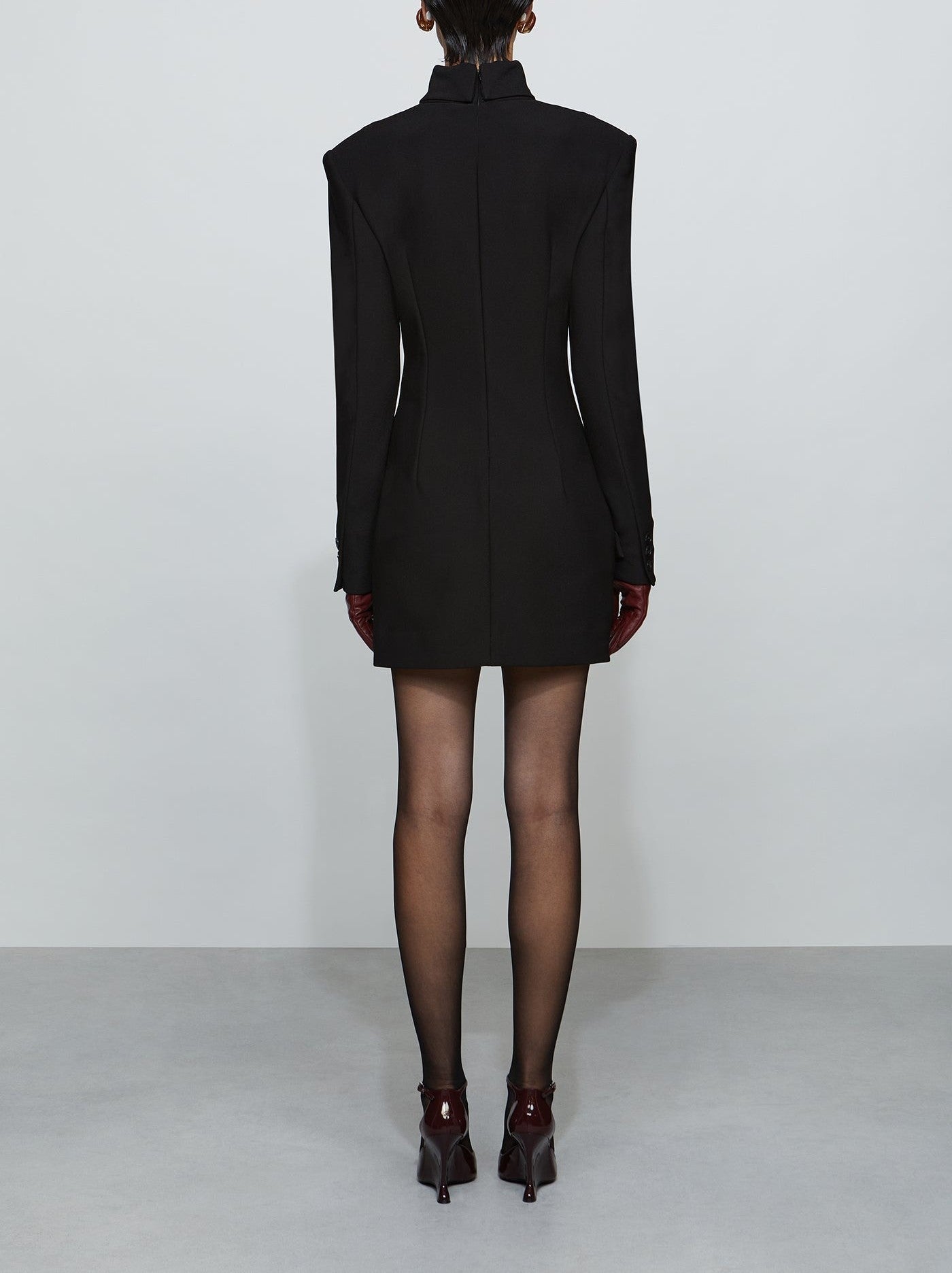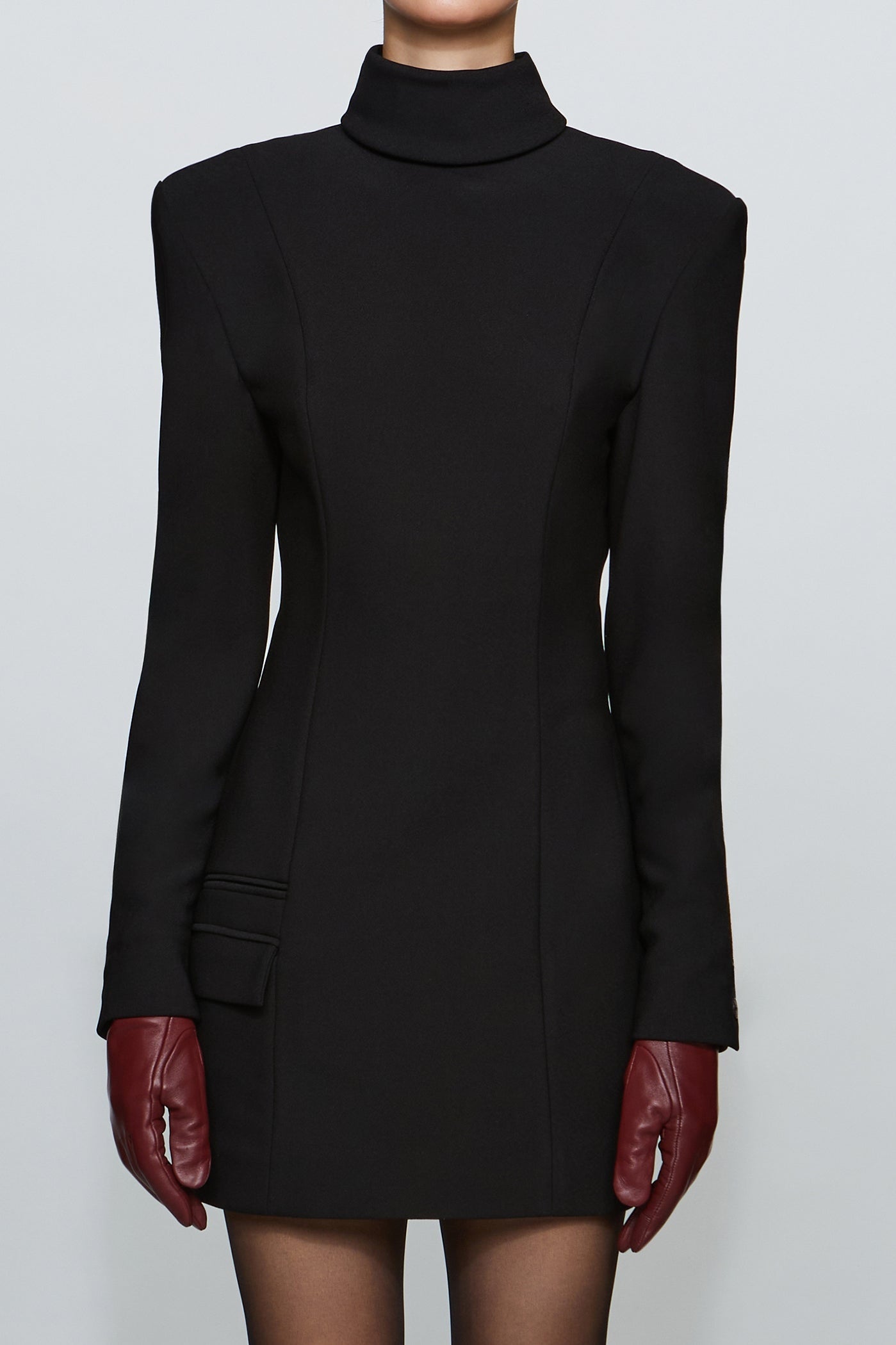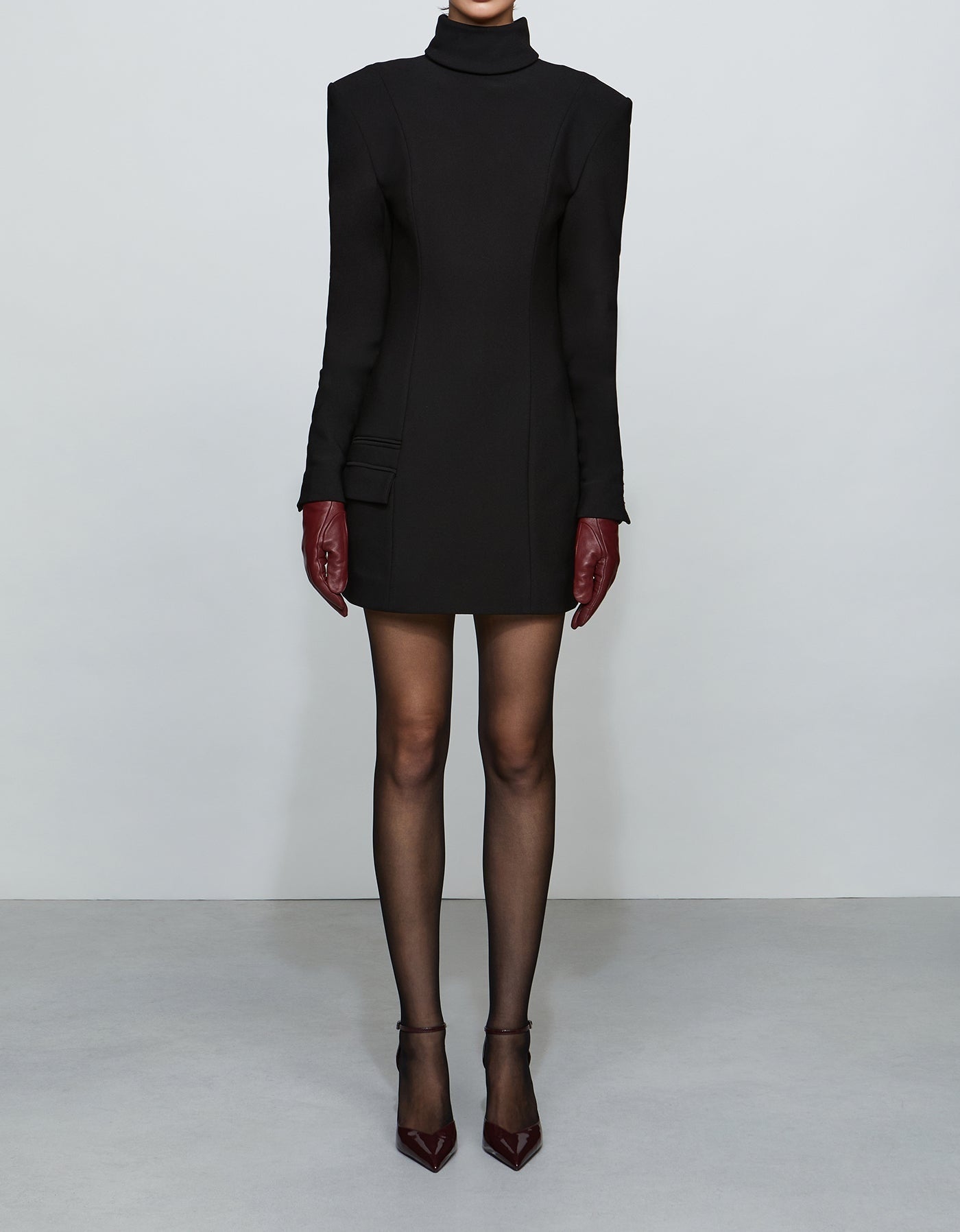Stretch crepe mini dress with sharp shoulders, hip pocket detailing, and a high turtleneck. Wear it with socks and loafers for the office—then swap in a heel for date night or dinner with the girls.