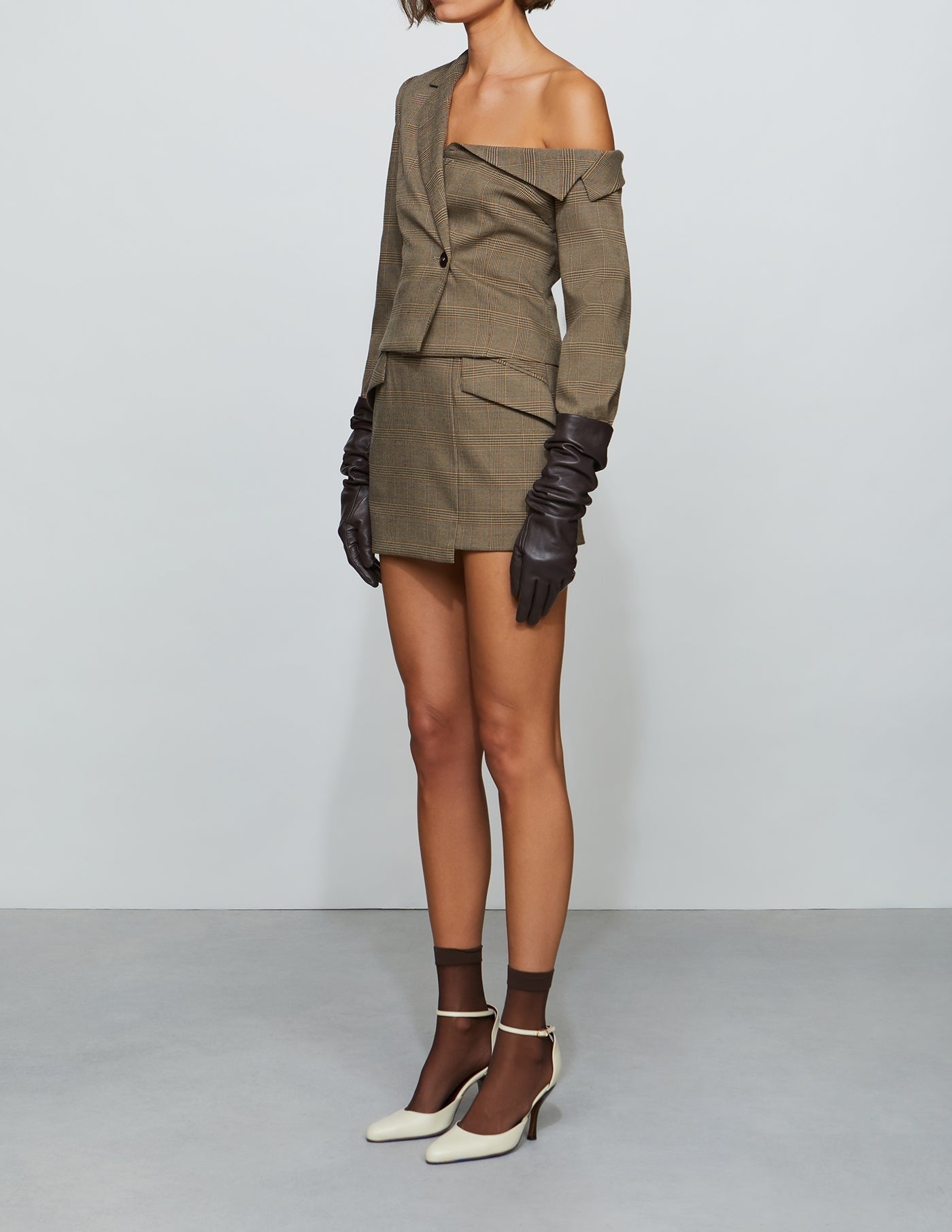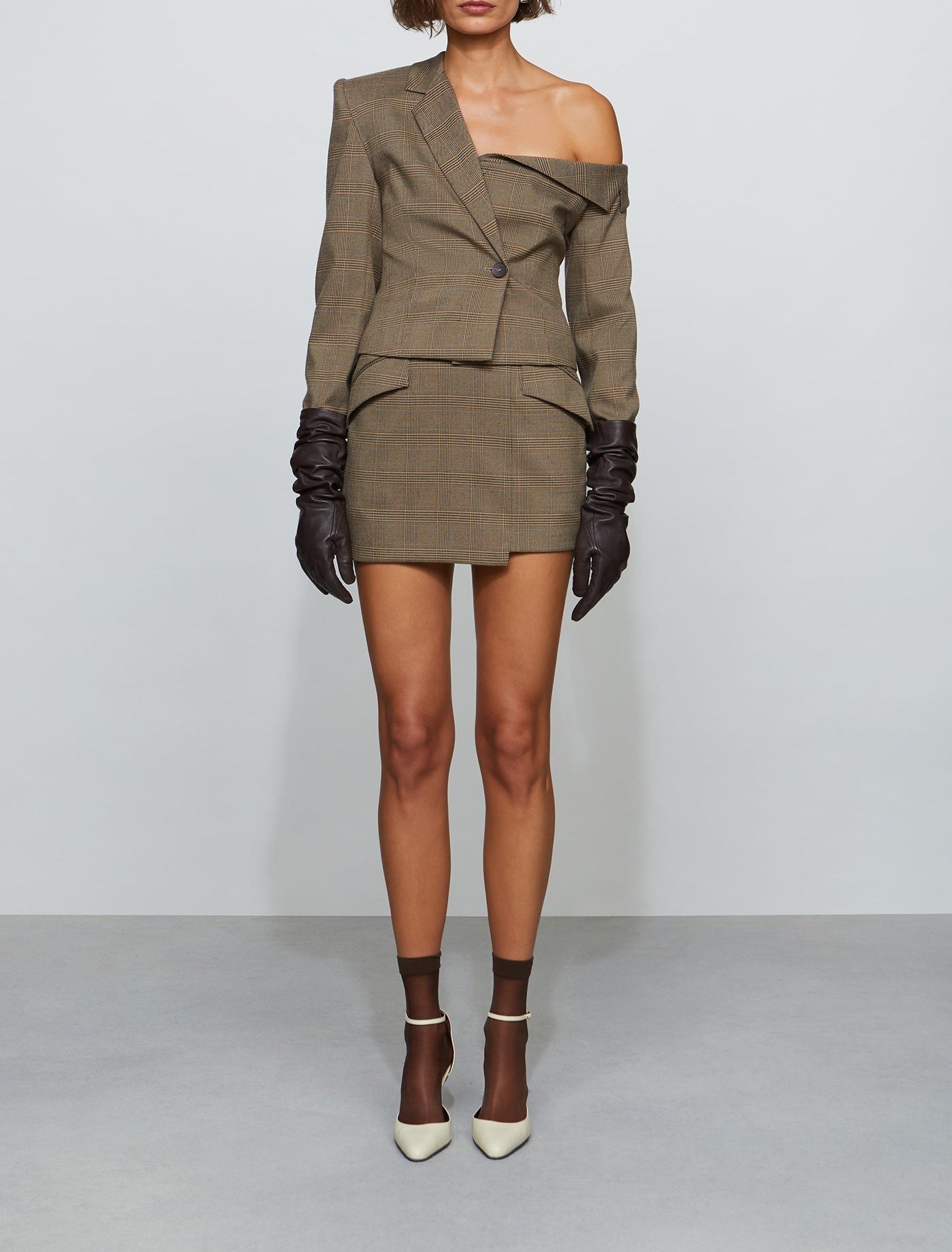 Plaid suiting mini with an angled hem and clean tailoring. Designed with two hip pockets and a sharp check pattern that reads office-to-out. Style it with socks and loafers by day—swap for boots or heels at night.