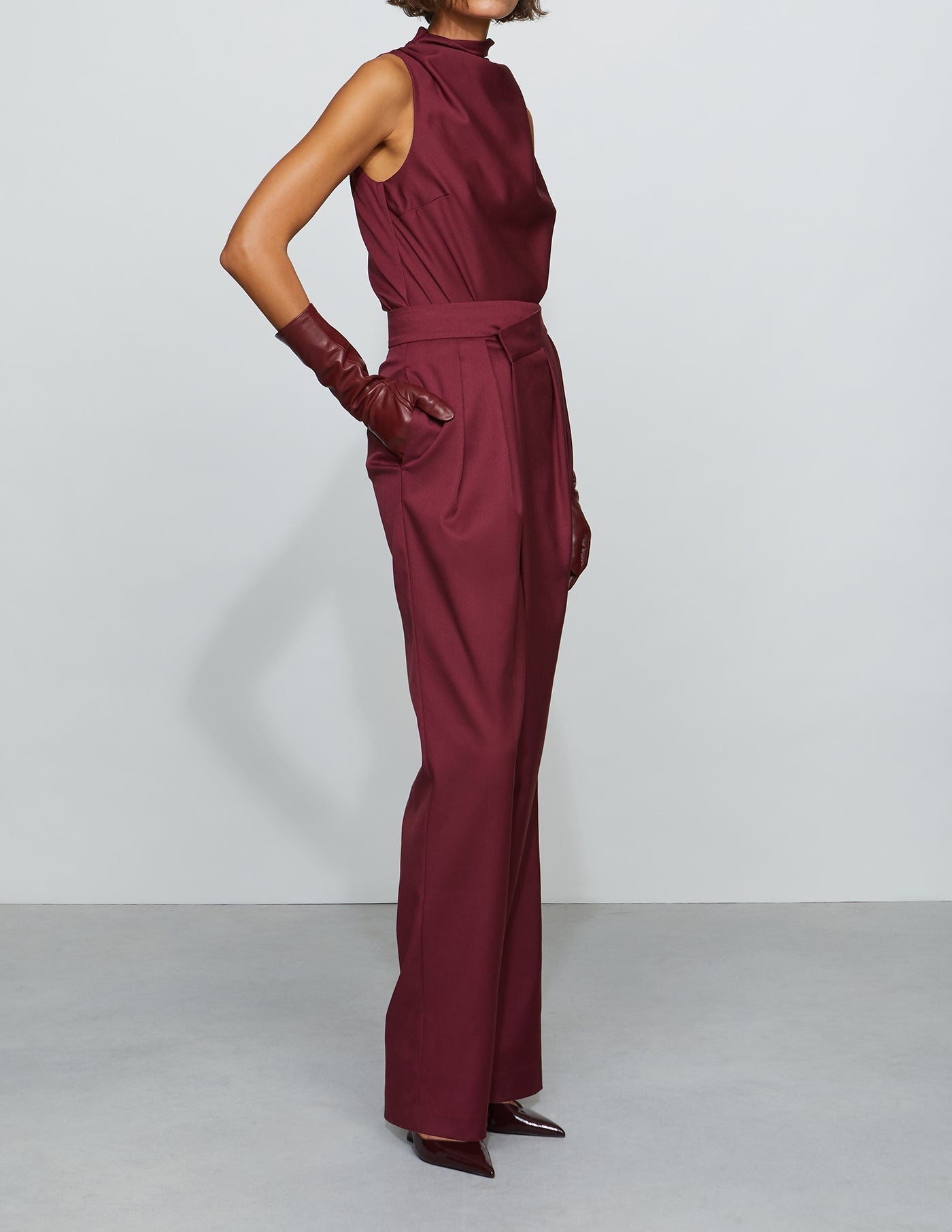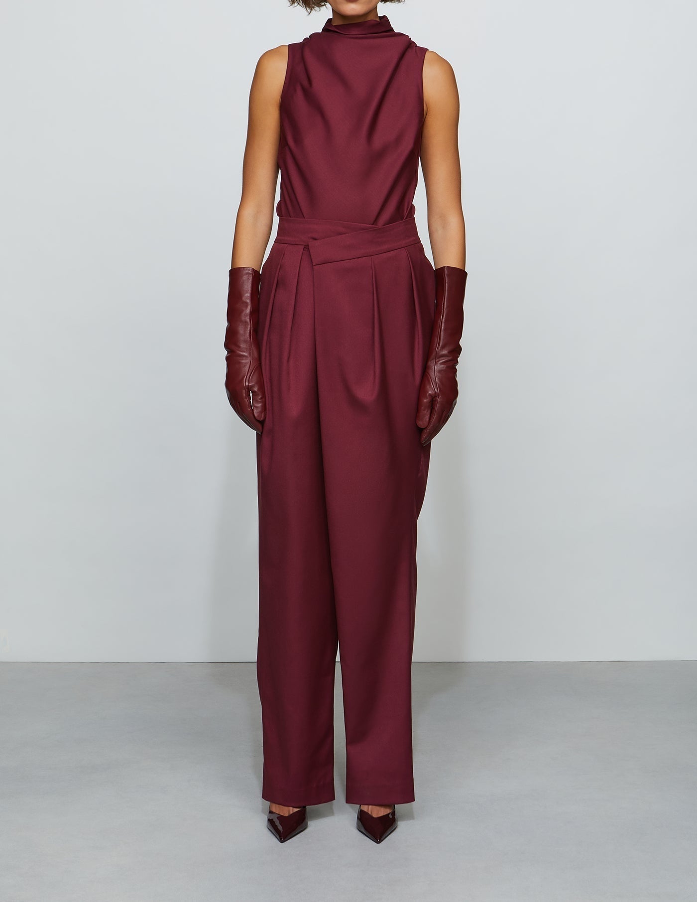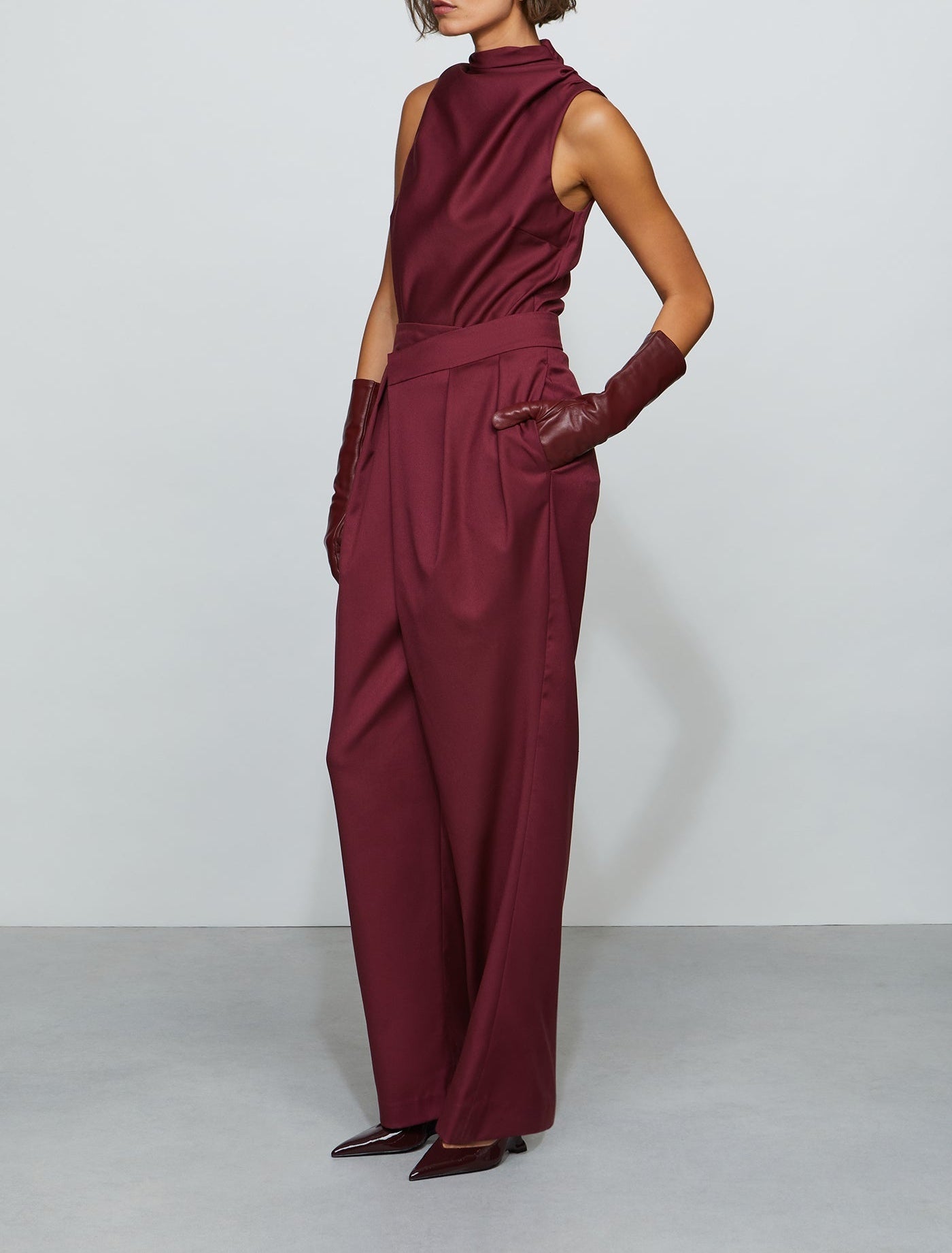 Overlap wide-leg pant in structured suiting with an asymmetric front panel and sharp pleats. Designed to sit at the true waist with side pockets for function. Pair it with the matching bodysuit—or mix in your own twist.