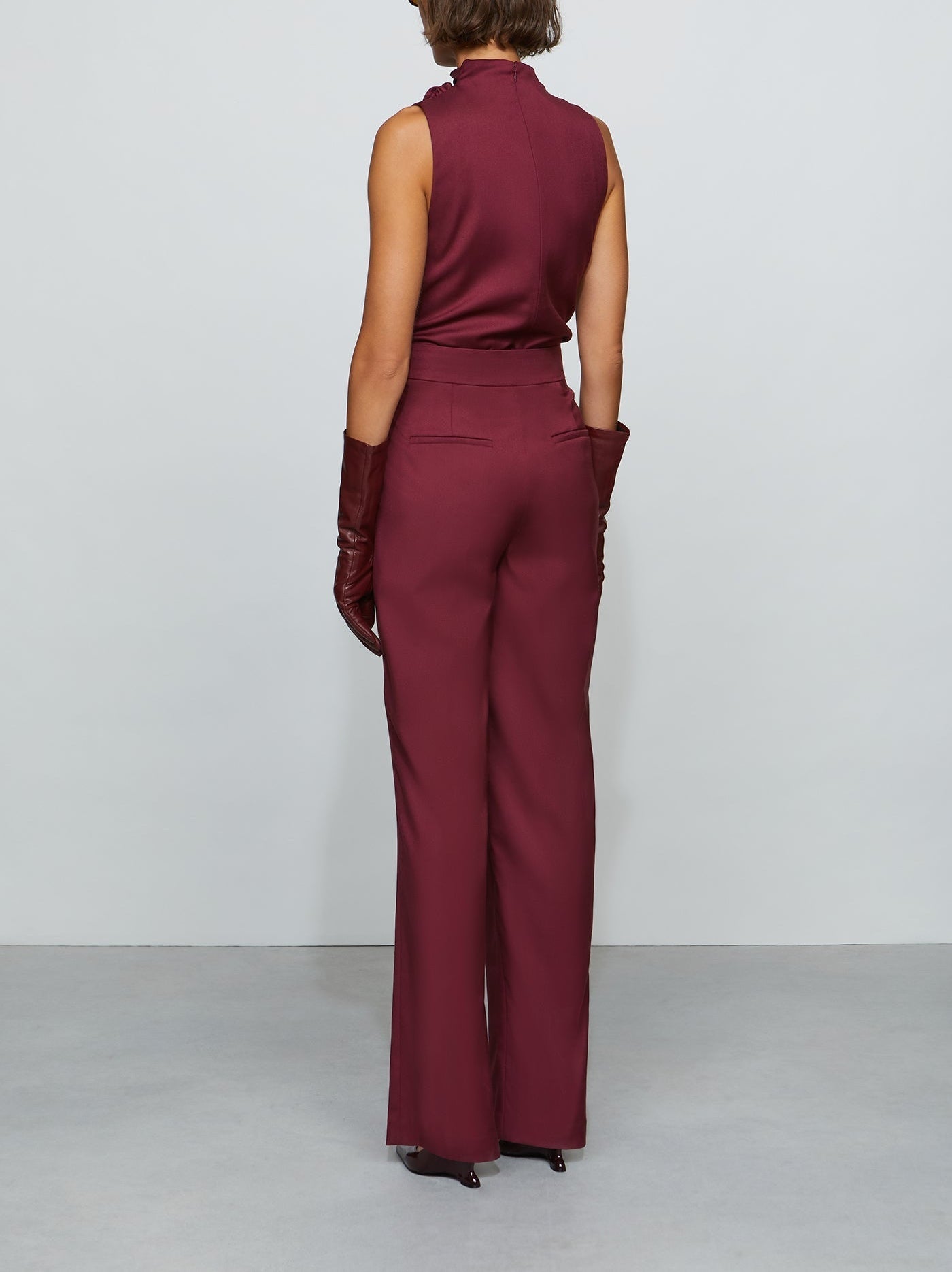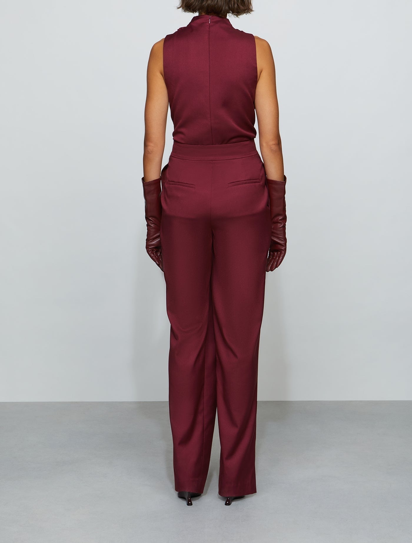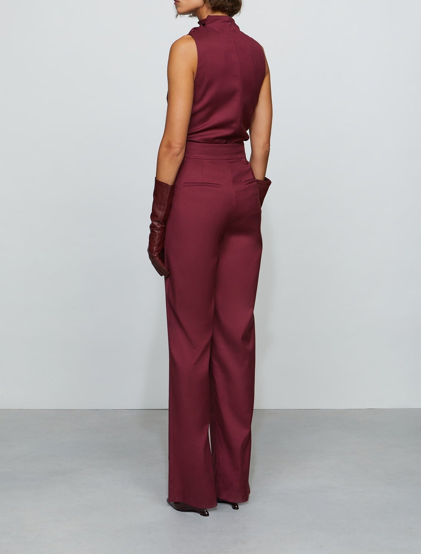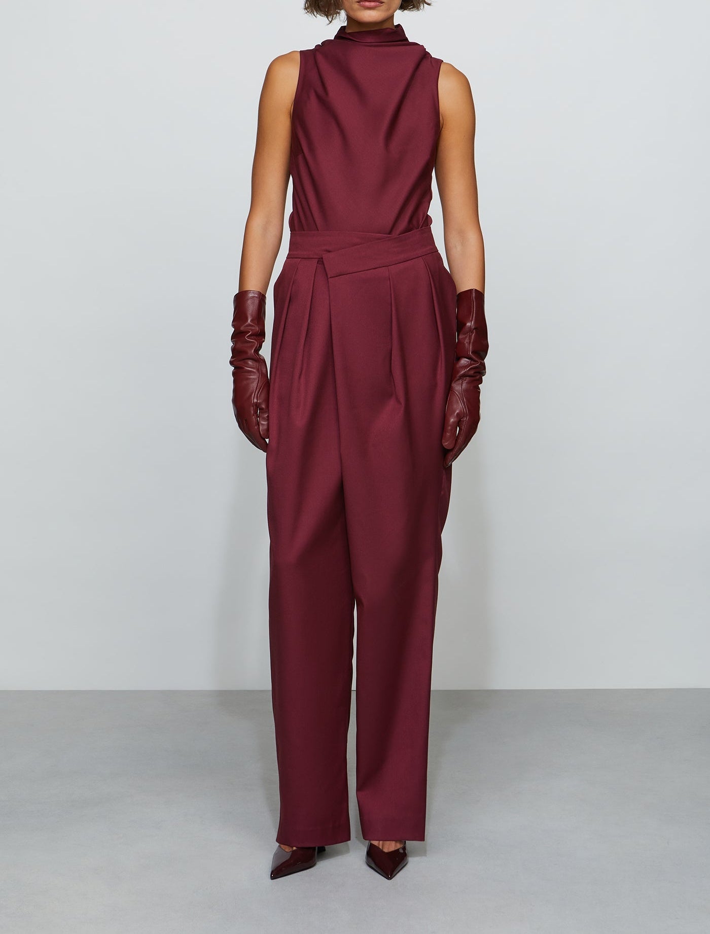 Overlap wide-leg pant in structured suiting with an asymmetric front panel and sharp pleats. Designed to sit at the true waist with side pockets for function. Pair it with the matching bodysuit—or mix in your own twist.