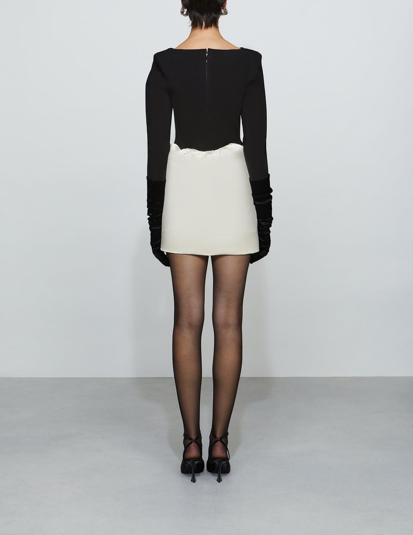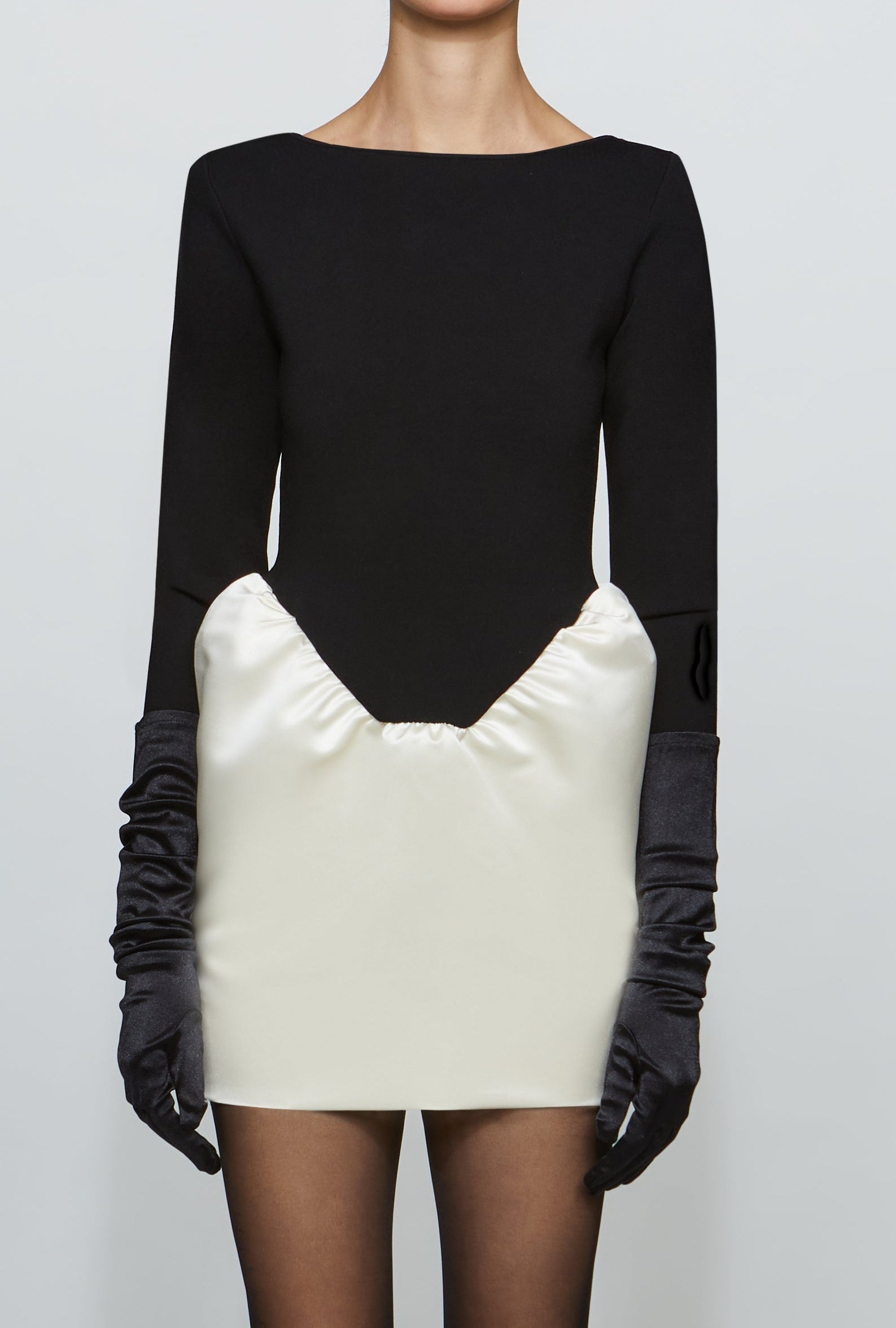 Compact knit meets duchess satin in this sharp two-tone mini. Sculpted at the hip with horsehair at the hem for a crisp pouf. Holiday plans? Handled.