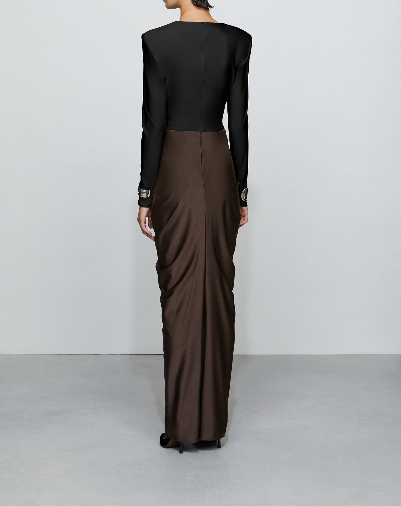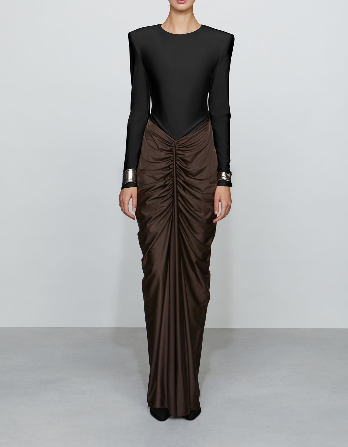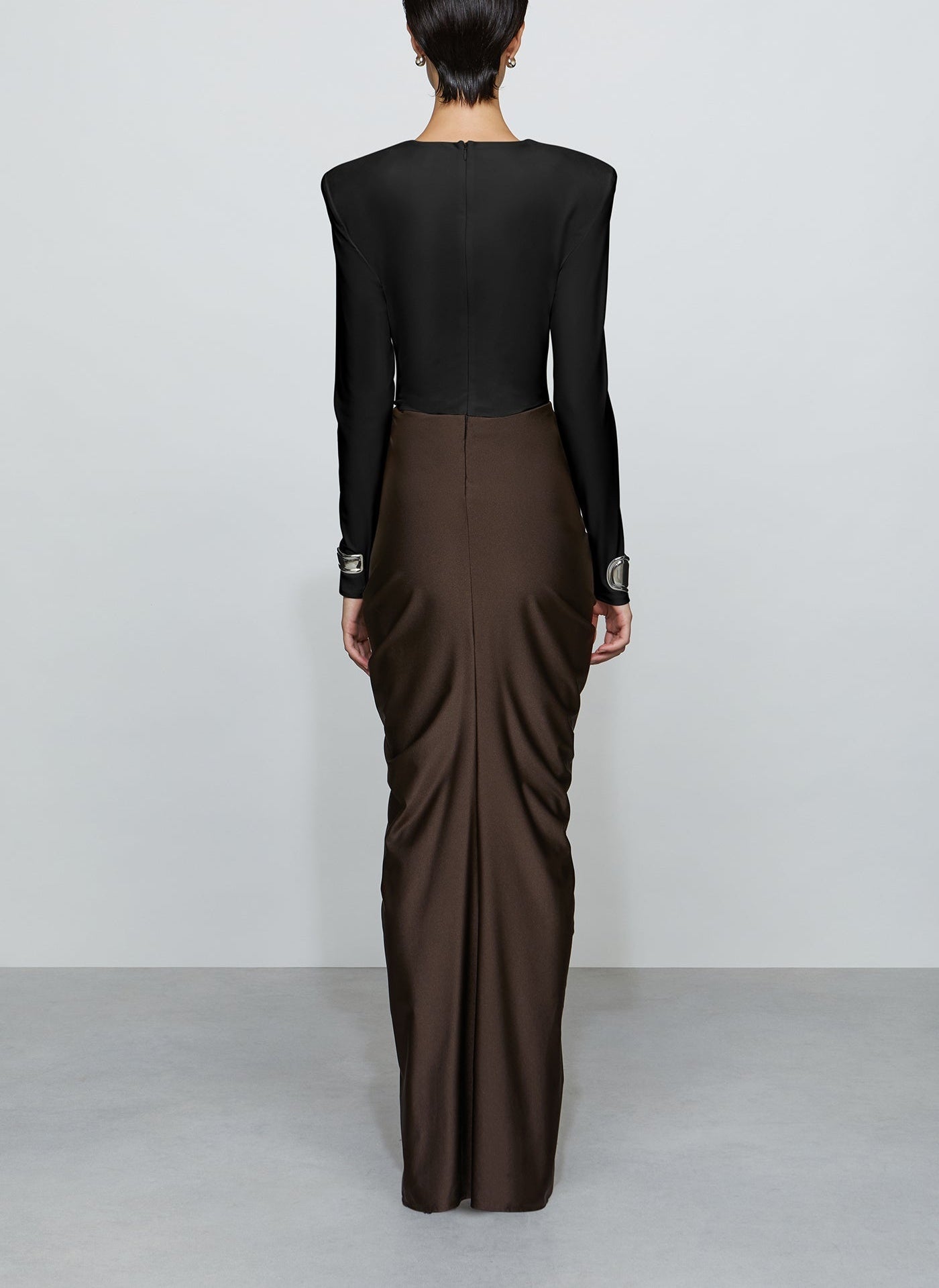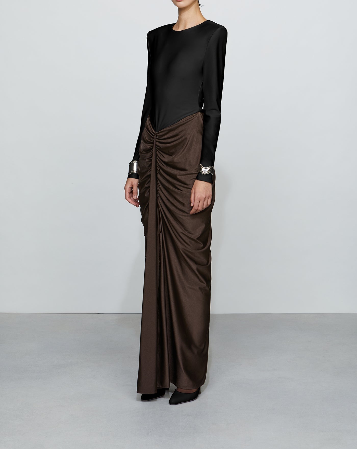Colorblock gown in new liquid jersey with sharp shoulders and a ruched column skirt. The fit is sculpted, the lines are clean—built for galas, weddings, or wherever the drama belongs.
