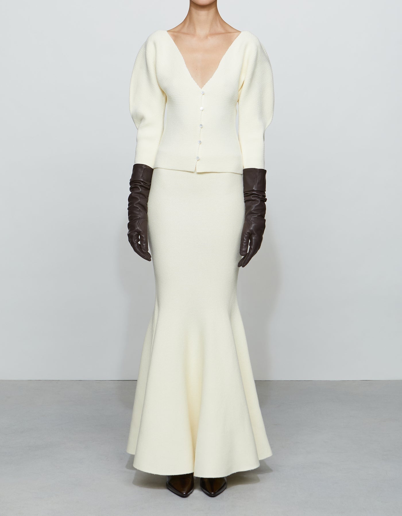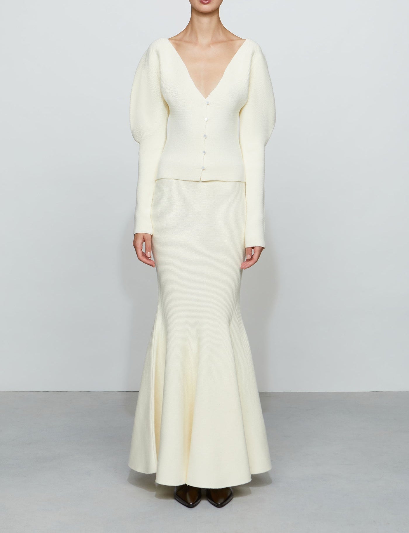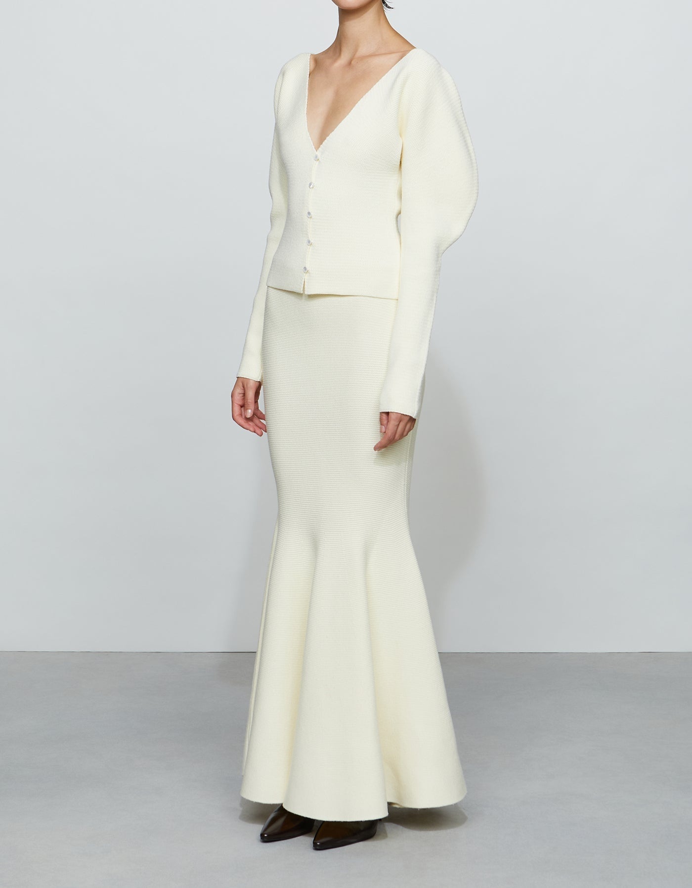 Fit-and-flare midi skirt in sculpted knit with an easy pull-on waist and soft structure. Moves like a dream—whether paired with its matching cardigan or not.