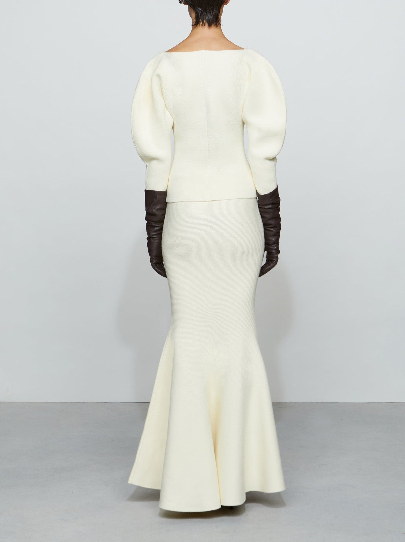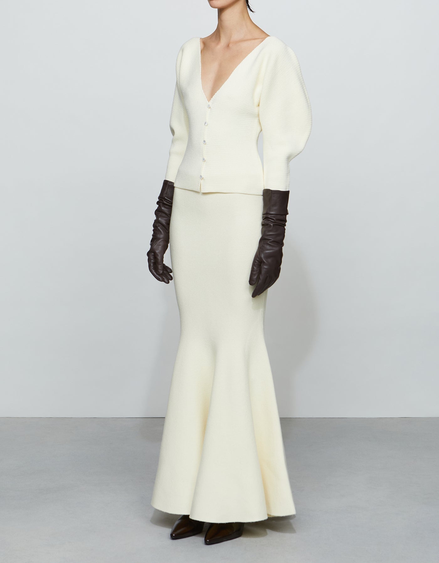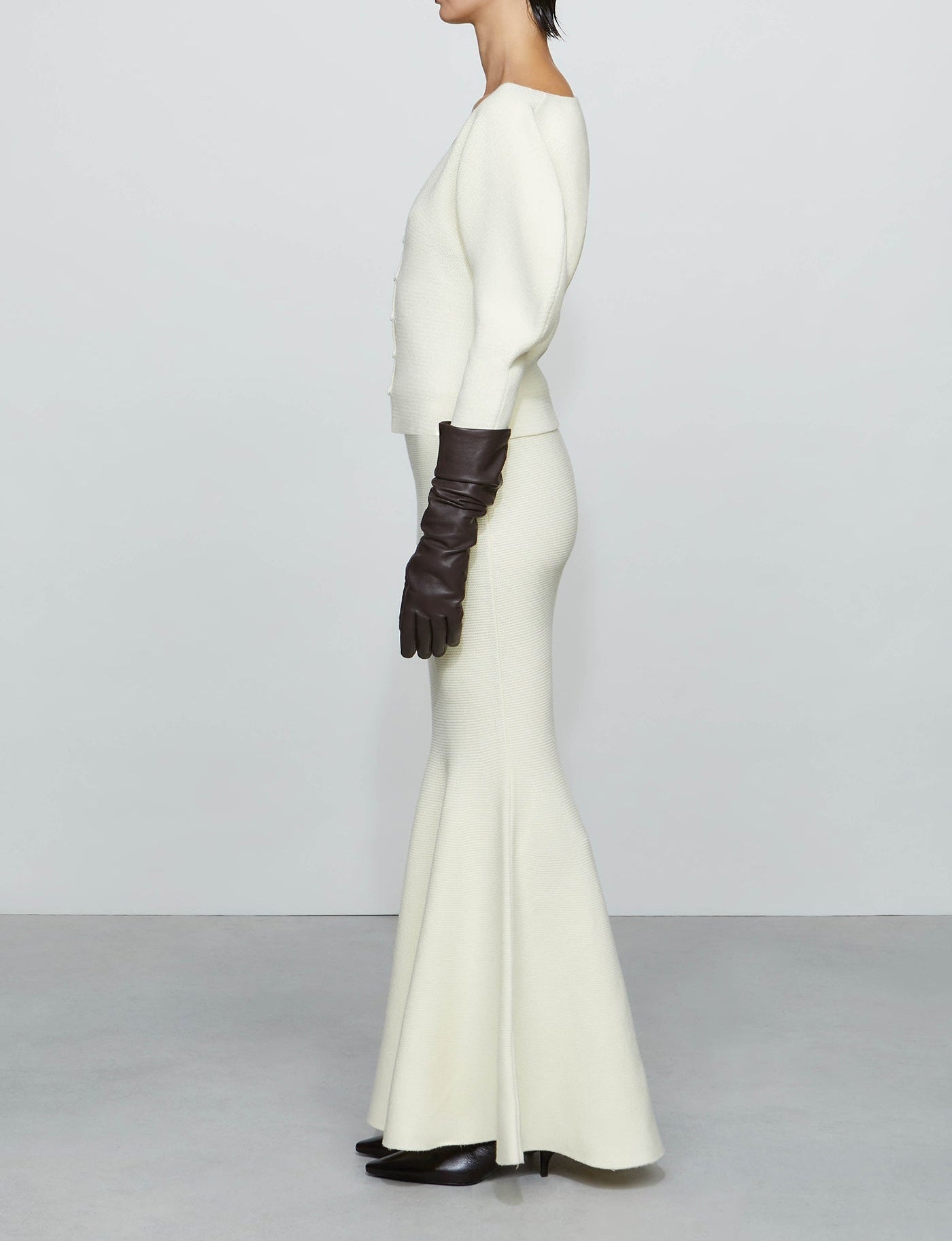 Fit-and-flare midi skirt in sculpted knit with an easy pull-on waist and soft structure. Moves like a dream—whether paired with its matching cardigan or not.