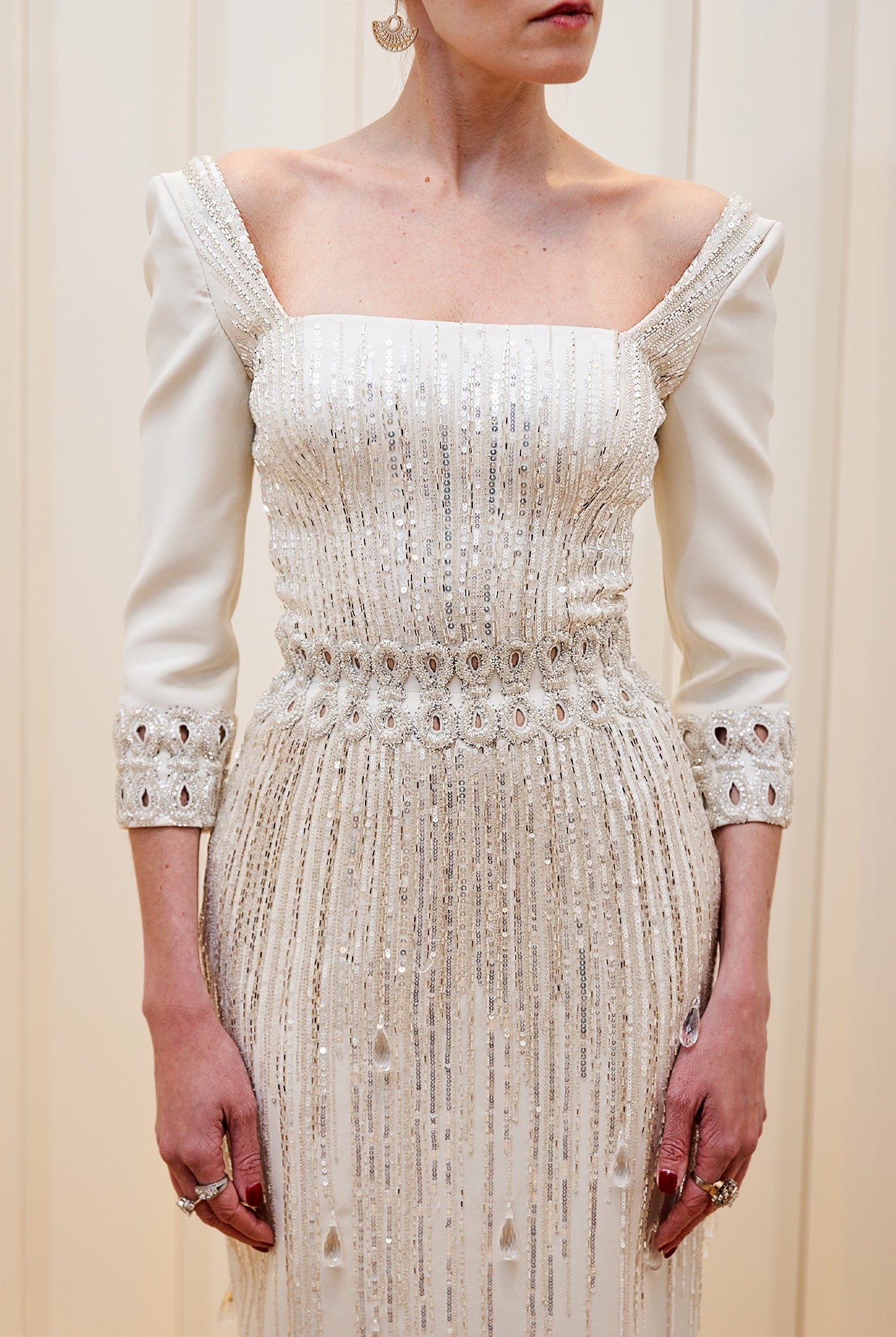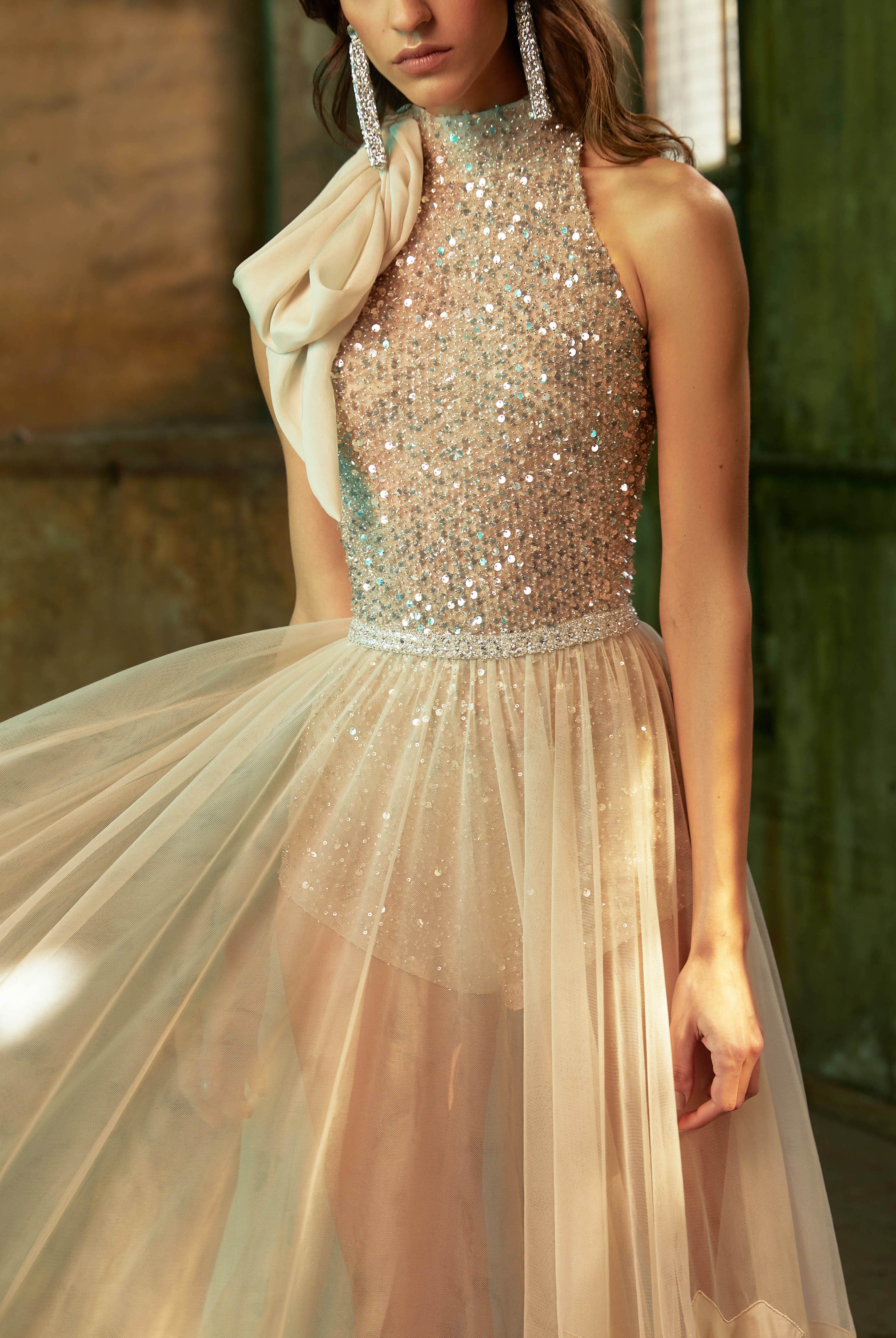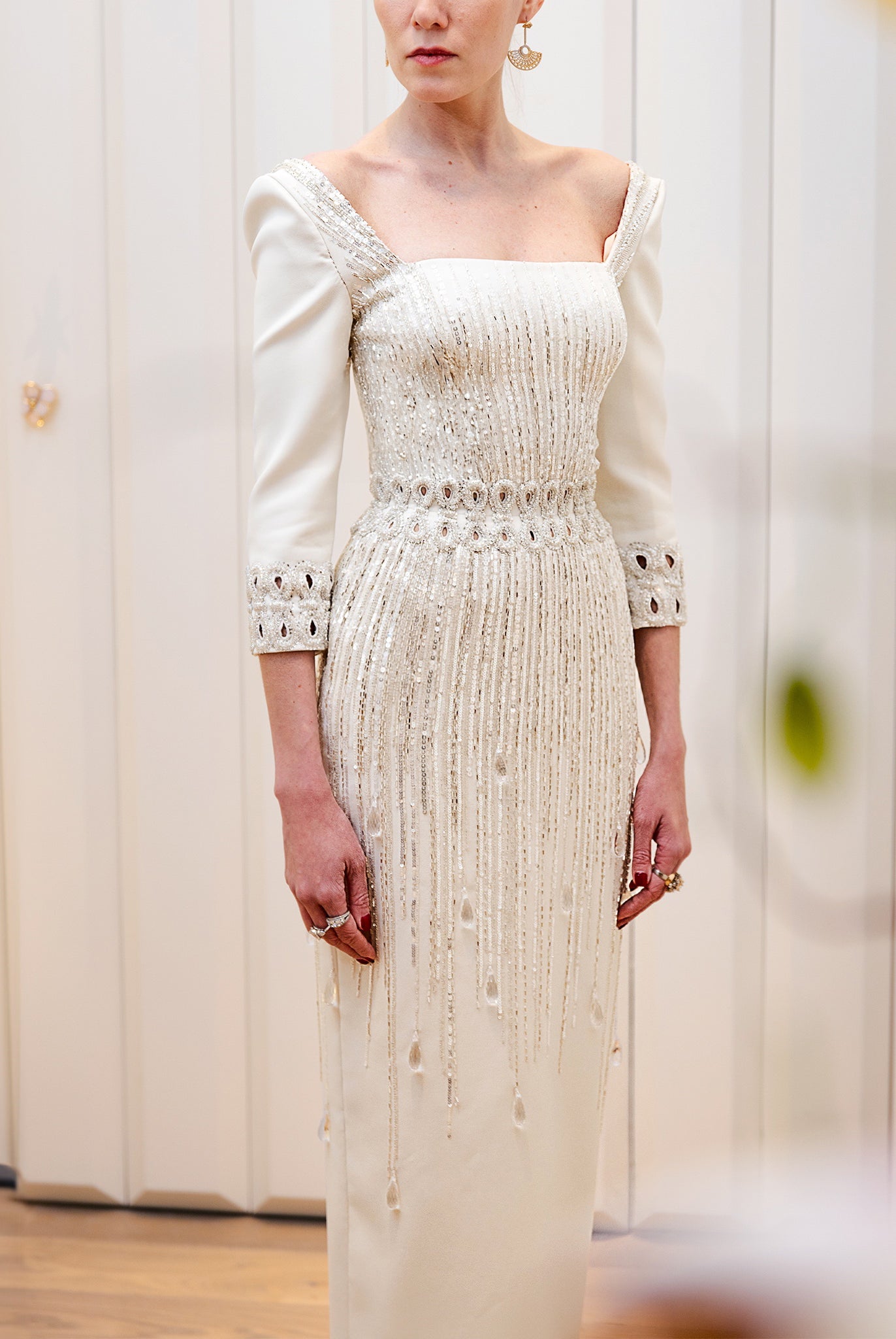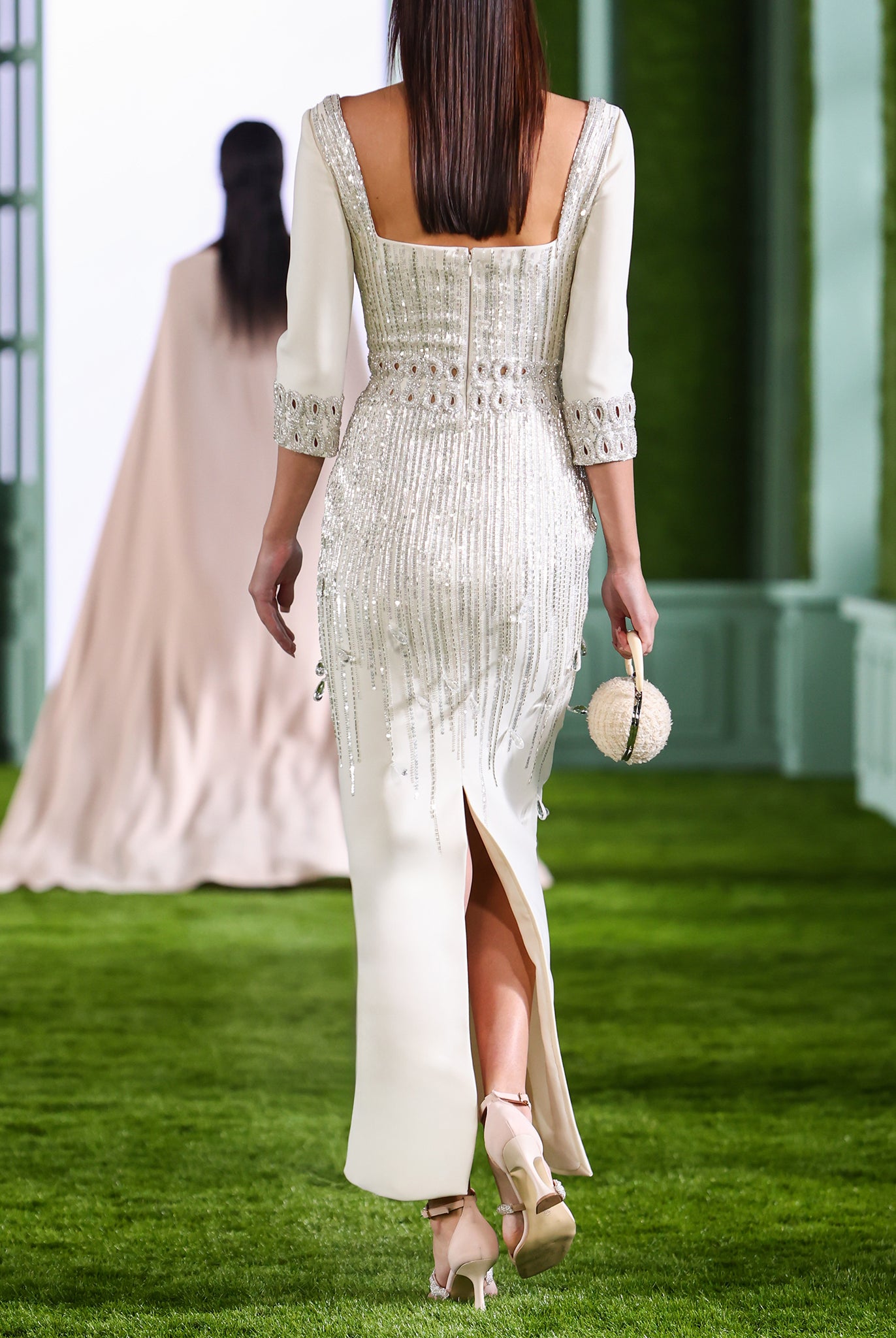 Whether you're looking for a cocktail dress or an evening gown, Elilhaam has got you covered. Their party dresses are made with the finest materials and feature intricate details, such as floral beaded sleeves embellishment and pointed collars, that are sure to make you stand out from the crowd. Shop their latest collection of party dresses today and steal the show at your next event!