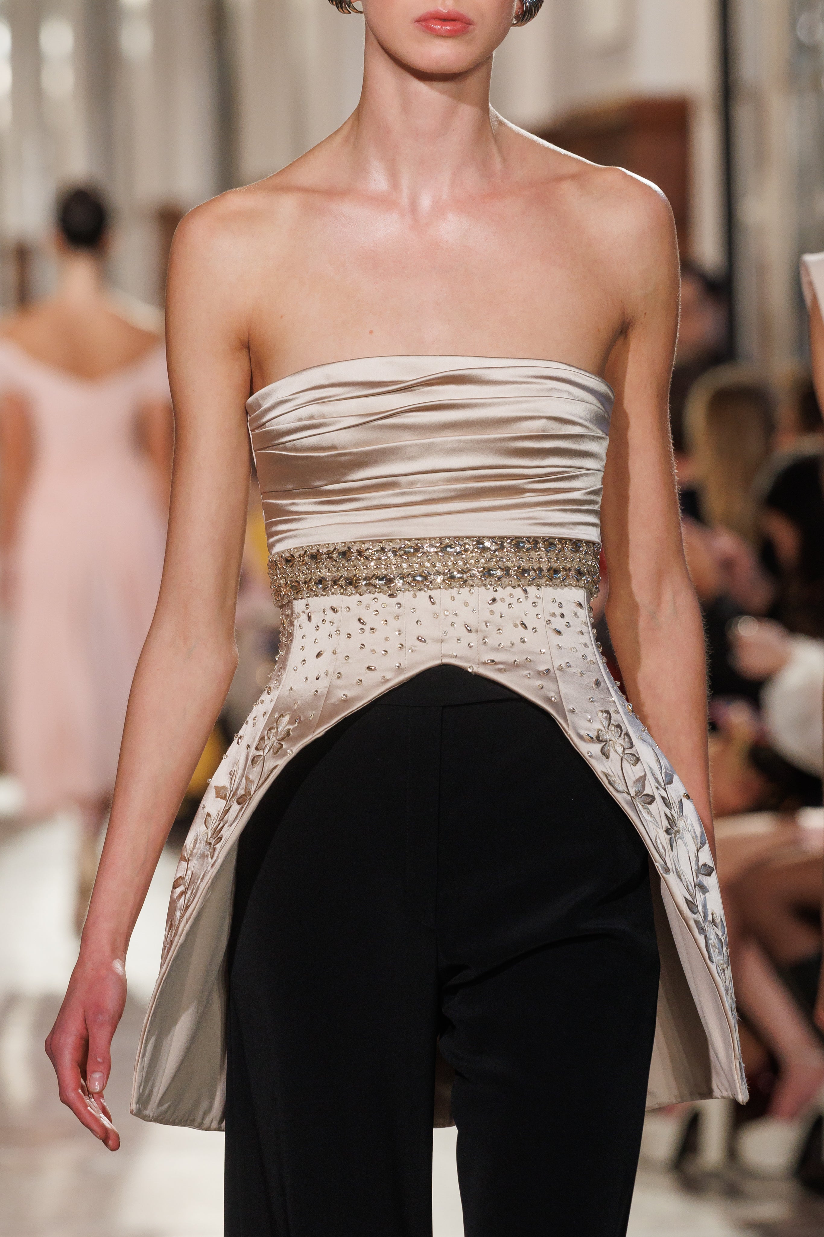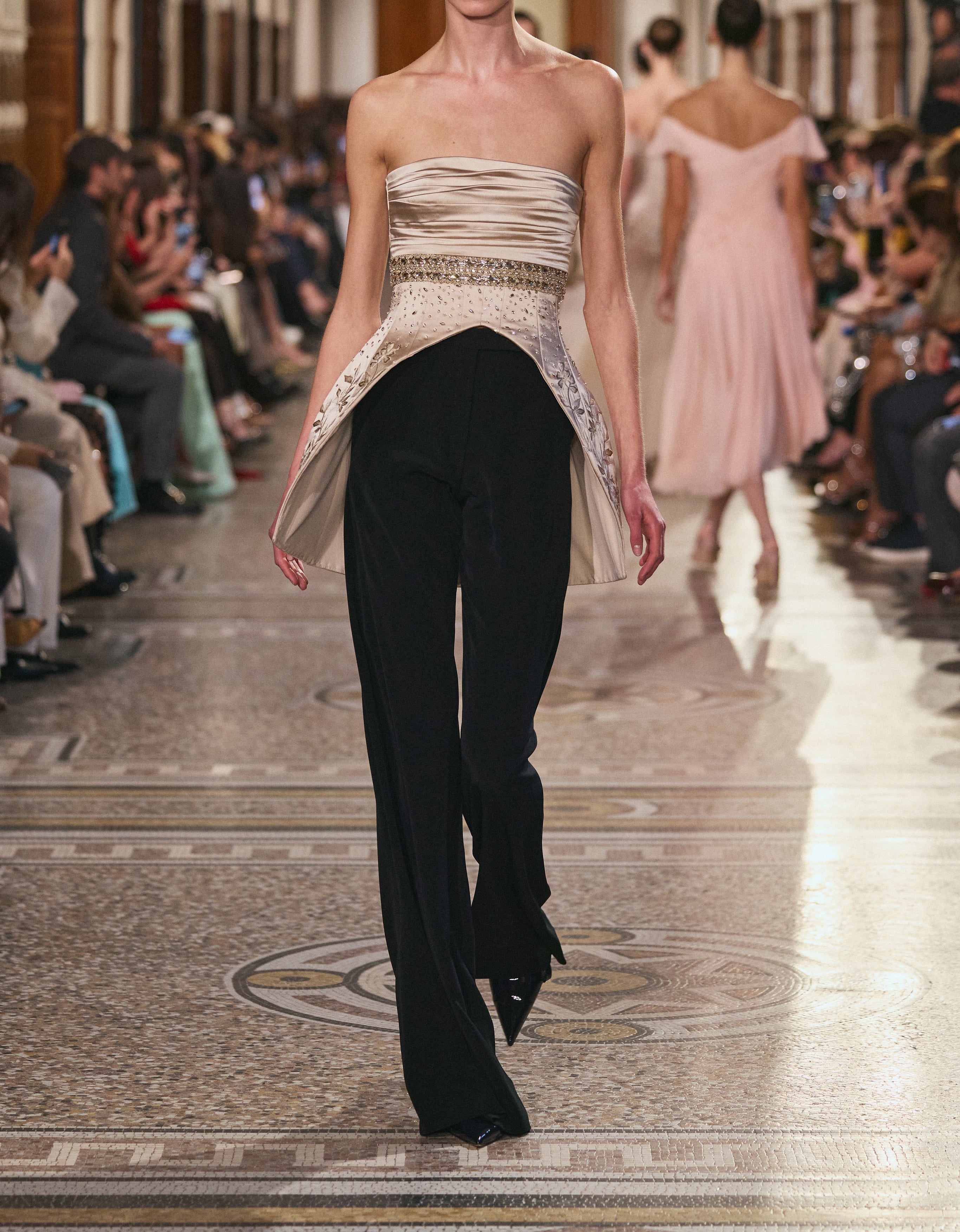 Strapless satin duchesse corset featuring an appealing central slit with a delicately draped bust and enhanced by crystallized stones and detailed thread-embroidered roses, accented with a diverse array of leaf motifs