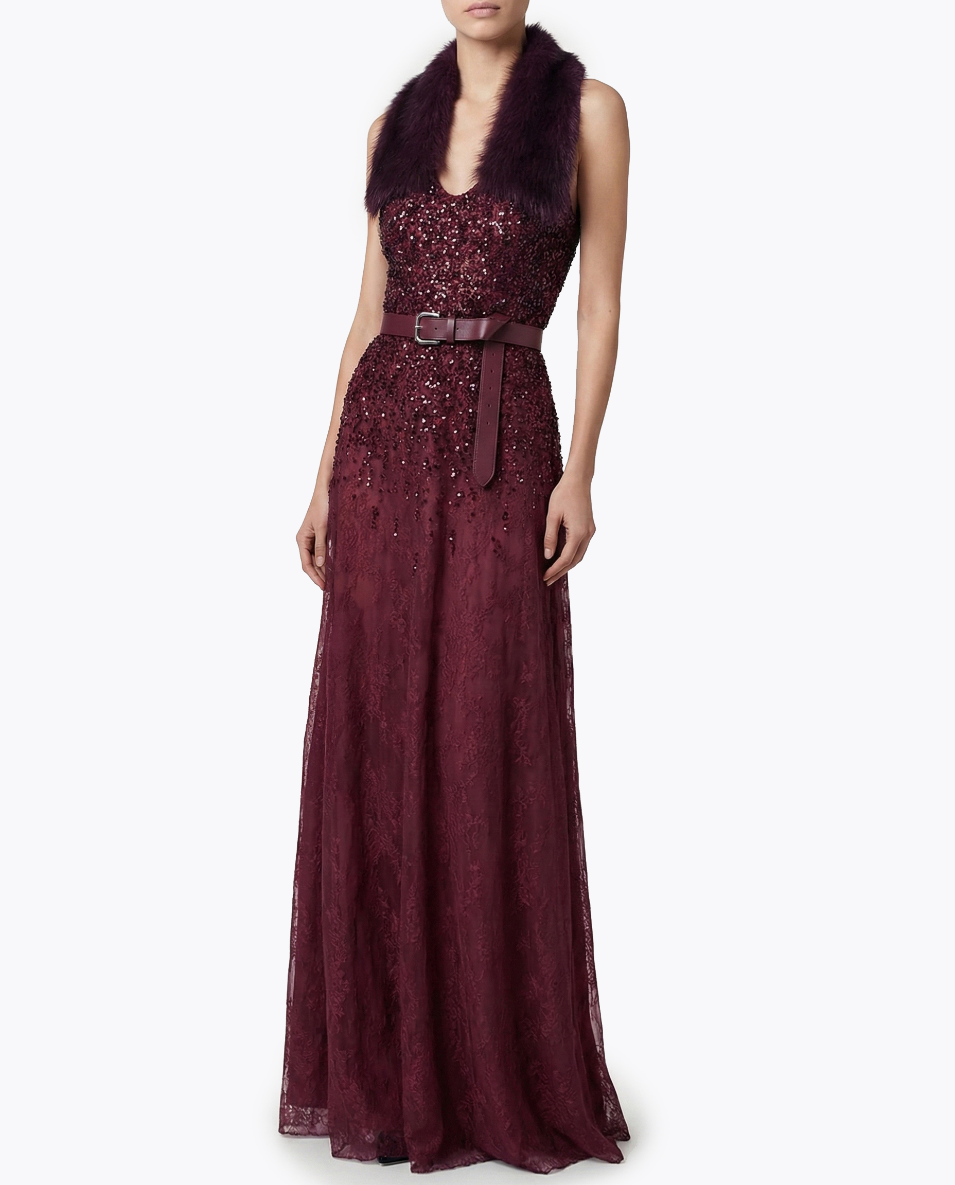 Flowy lace dress embellished with crystals and beads, complete with a soft-haired faux fur collar.