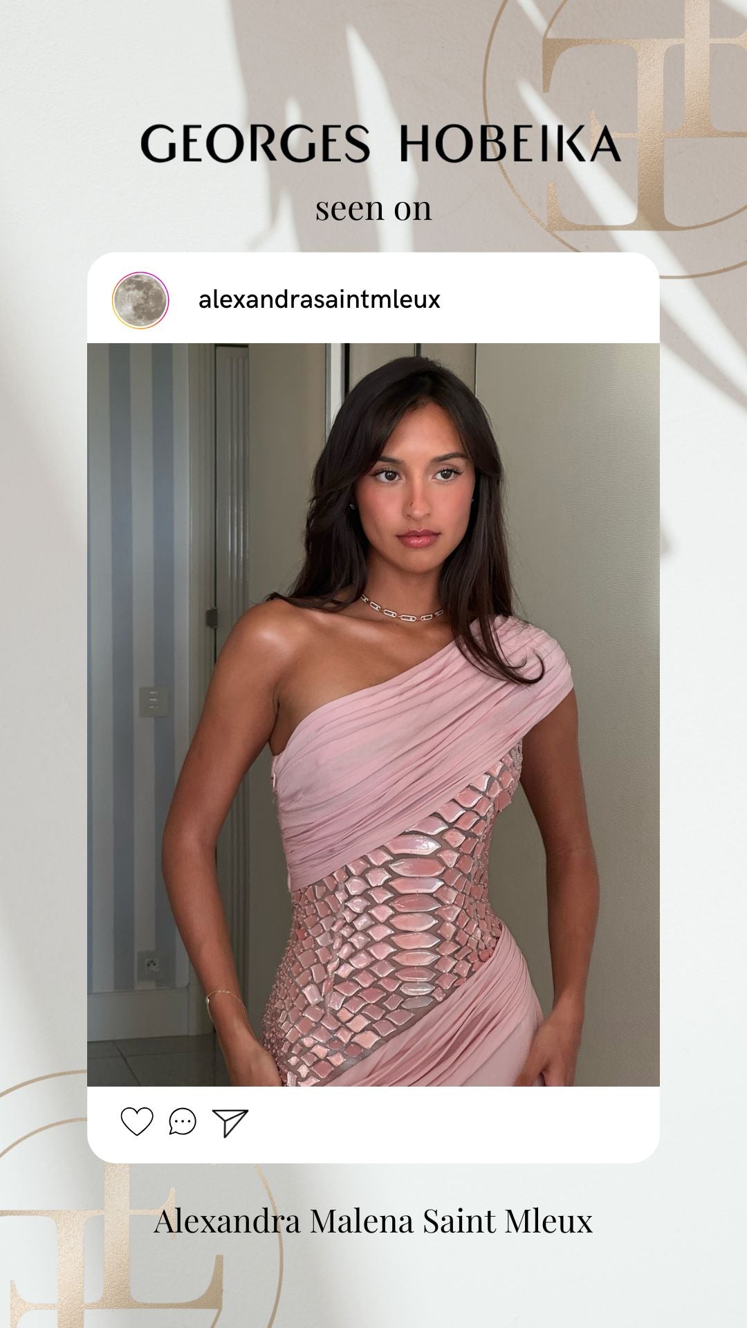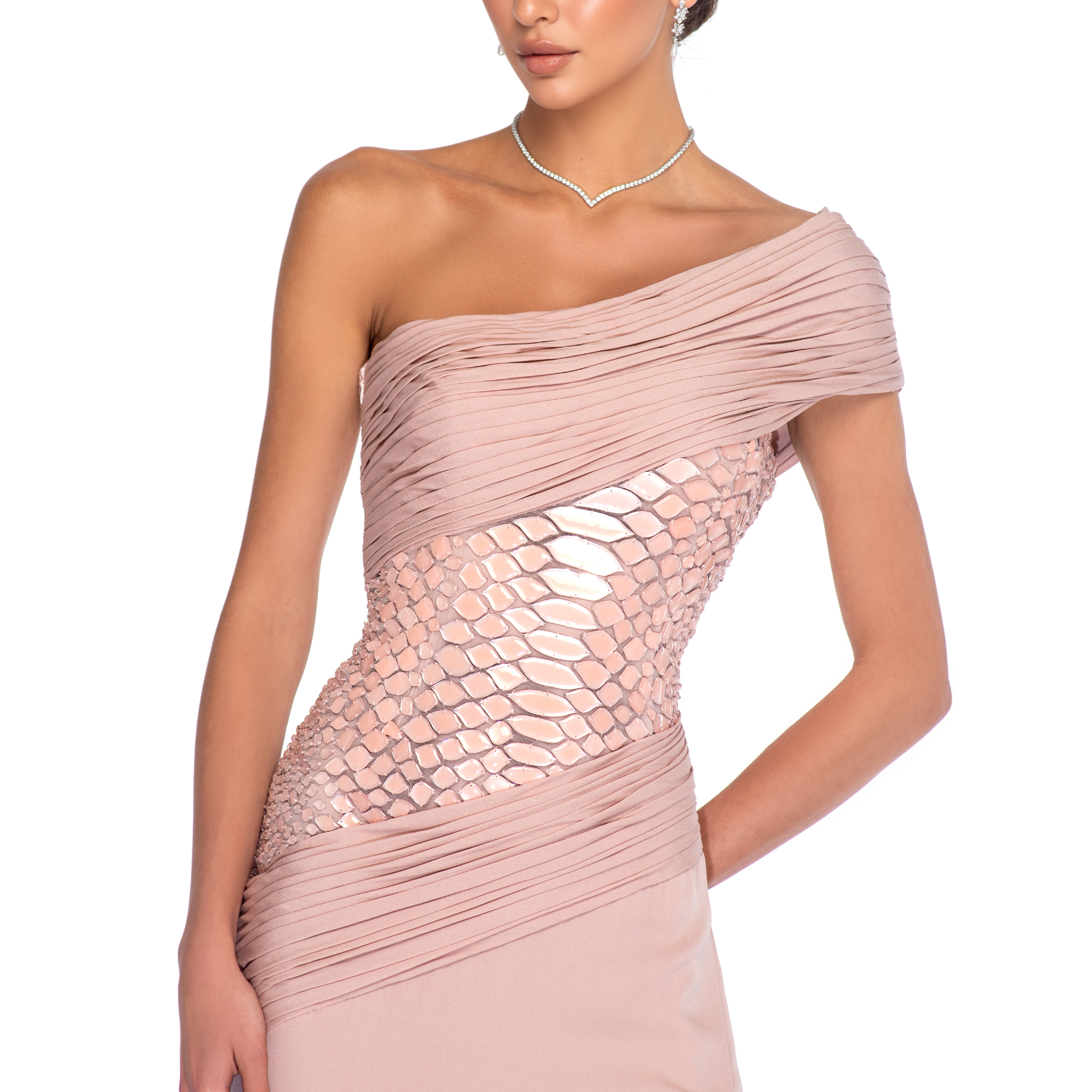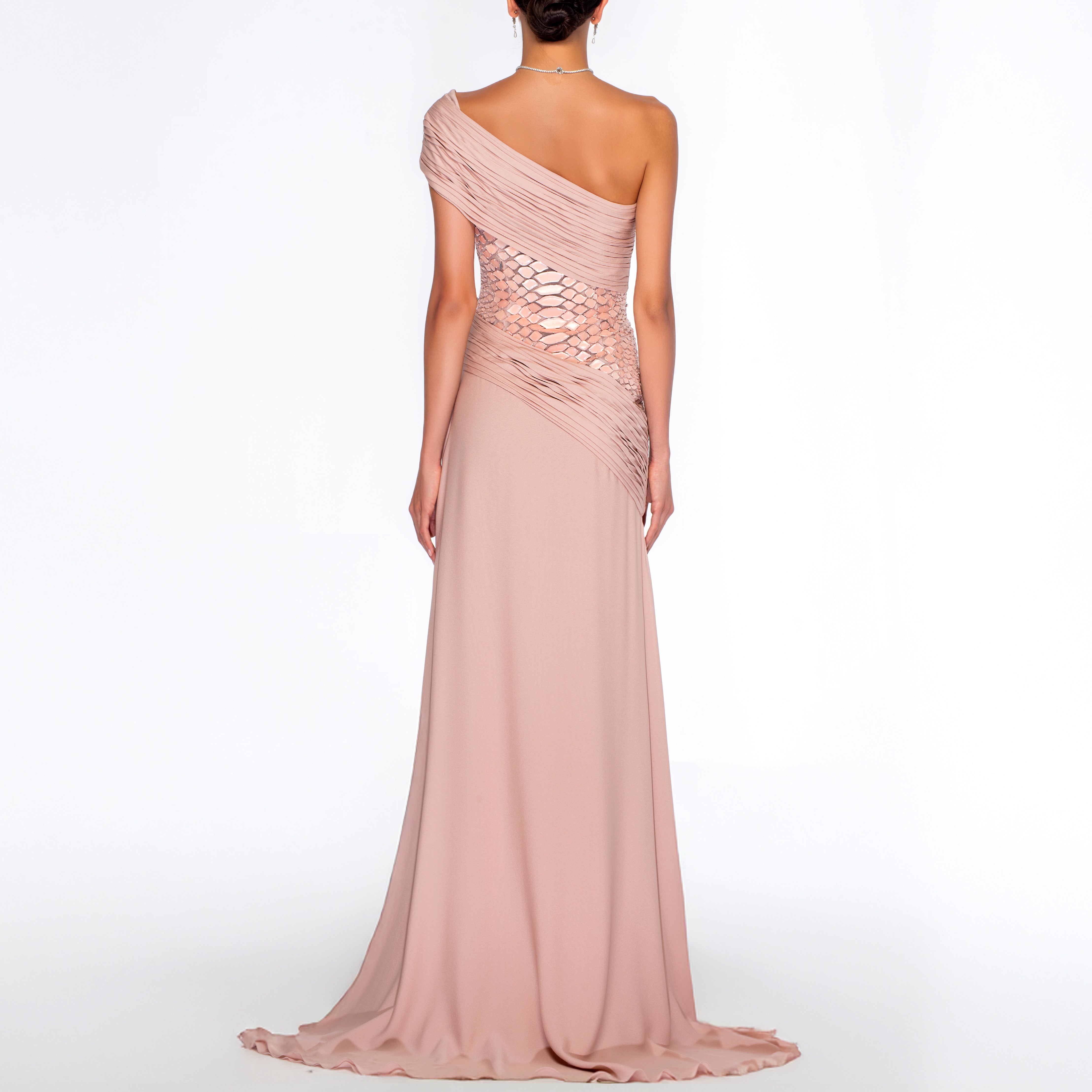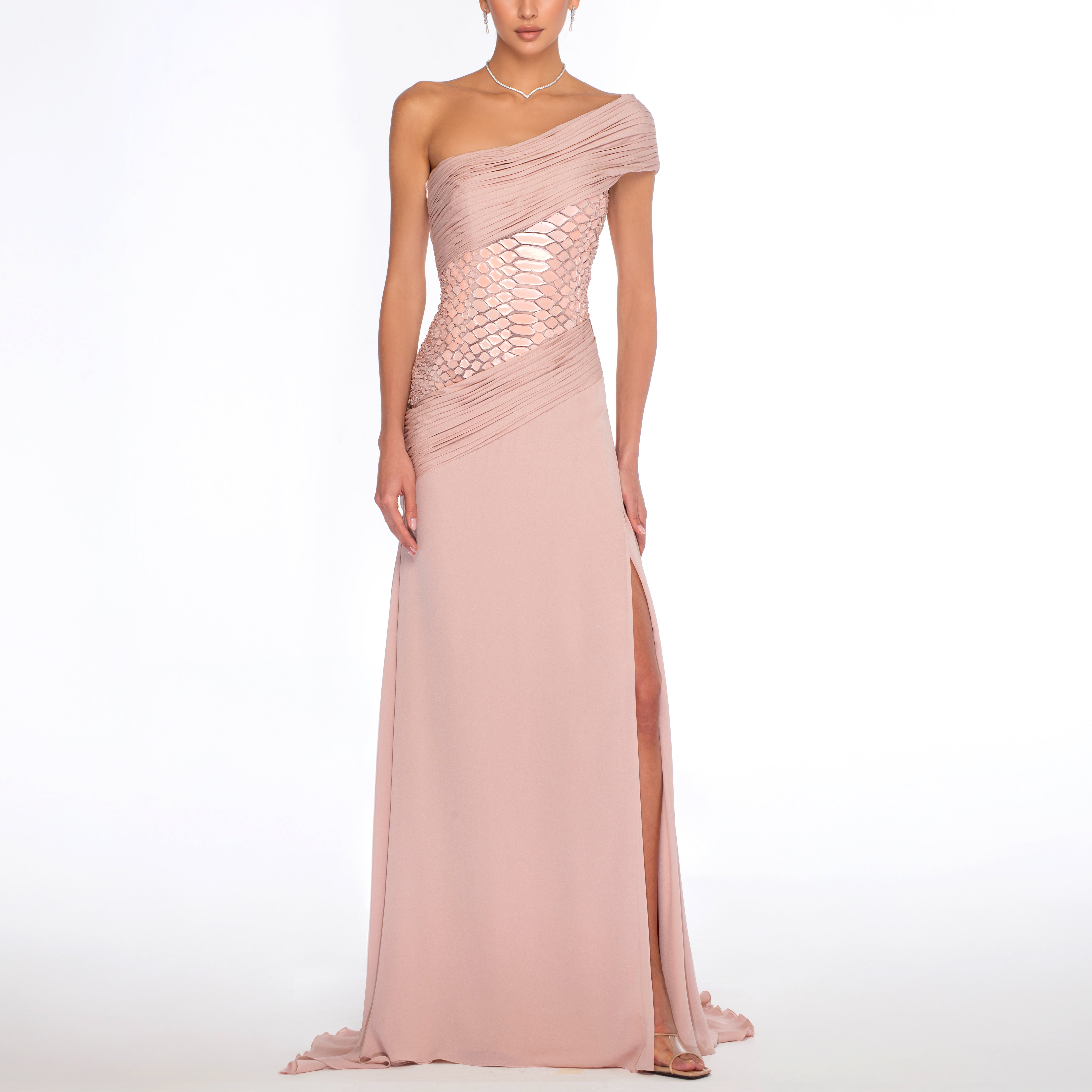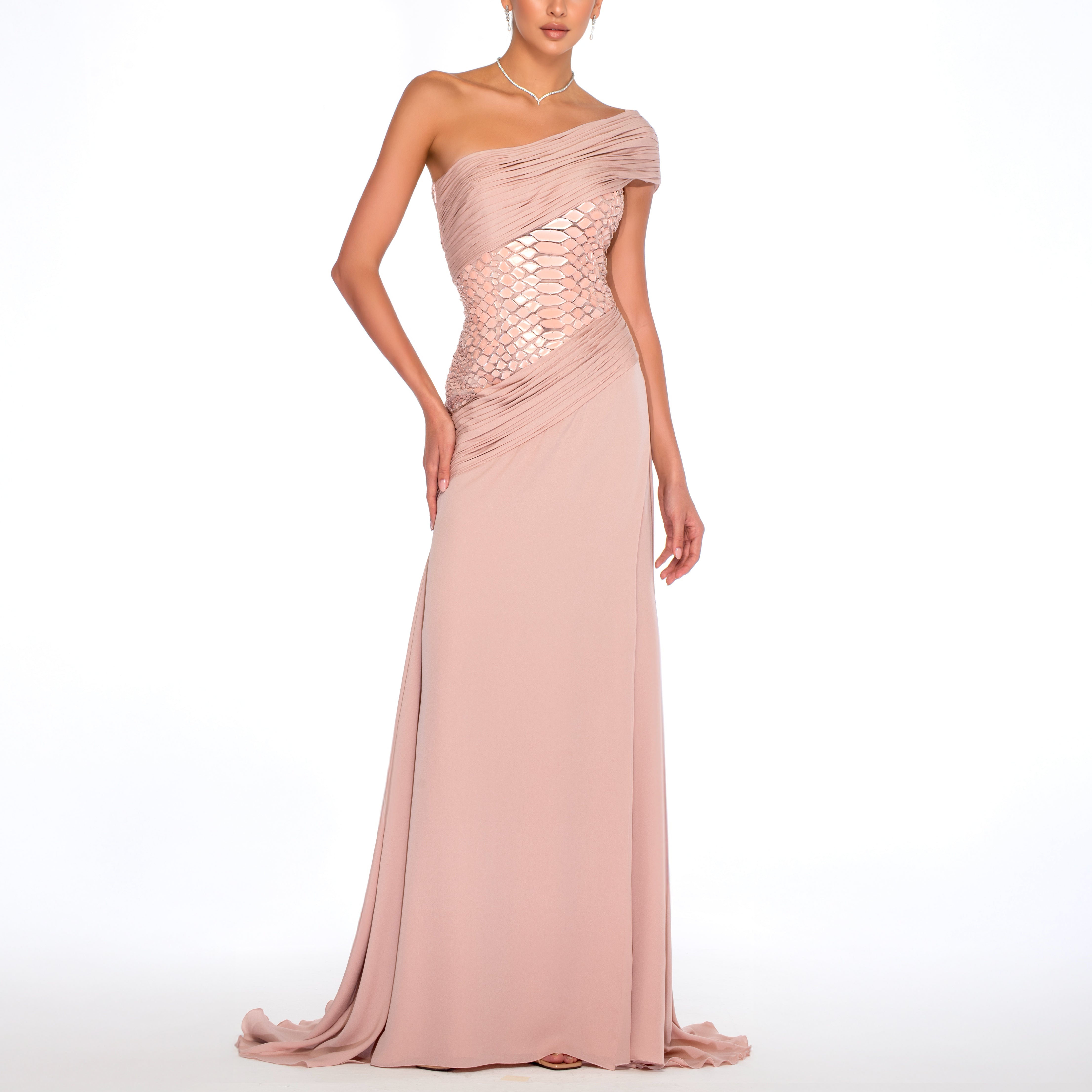 Designed with a dramatic one-shoulder neckline and a flawlessly draped fit, this dress features a form-fitting bodice that flows effortlessly into a graceful skirt. Crafted from luxurious georgette and tulle, the piece is adorned with intricate resin acrylic embellishments that add a touch of modern elegance.