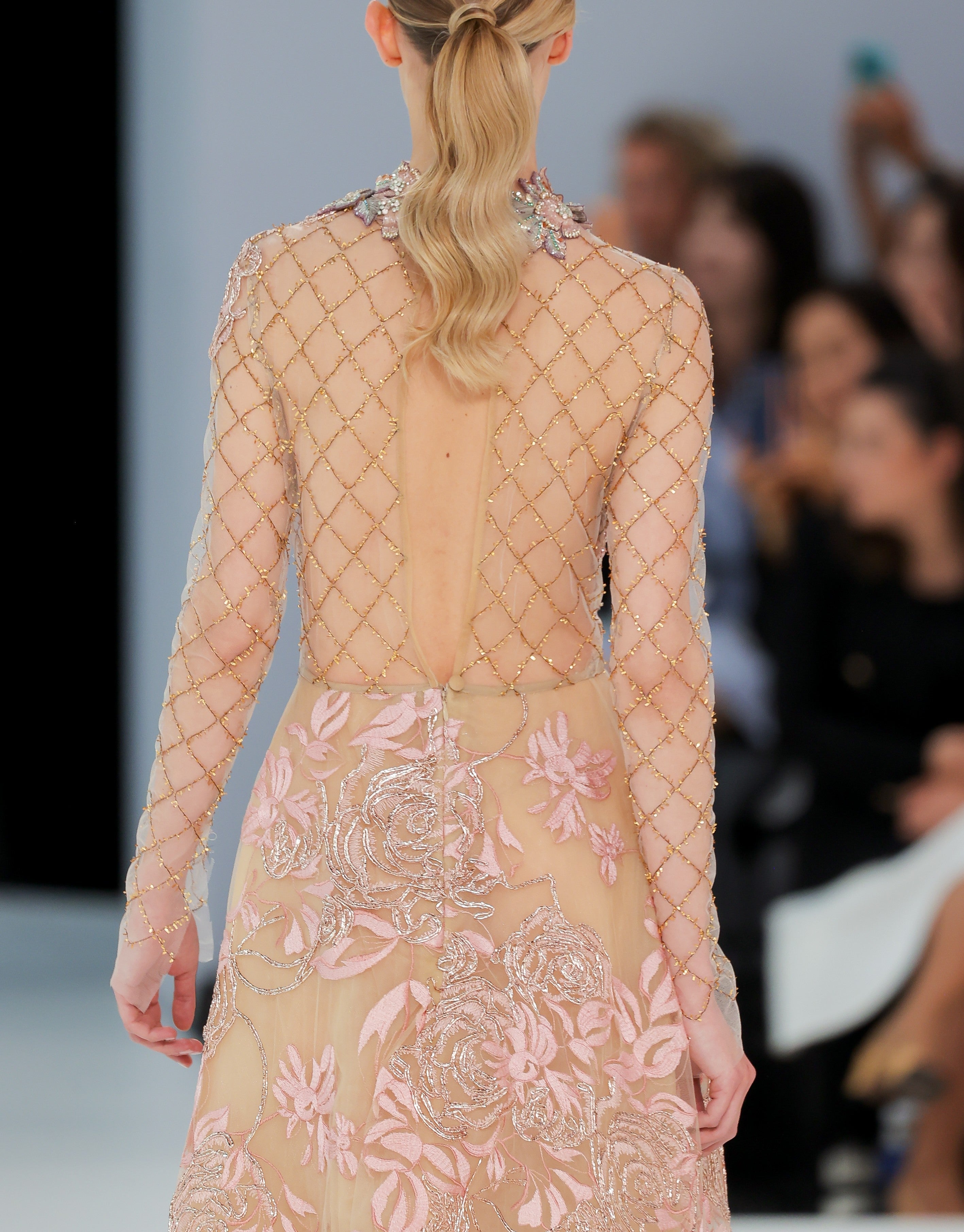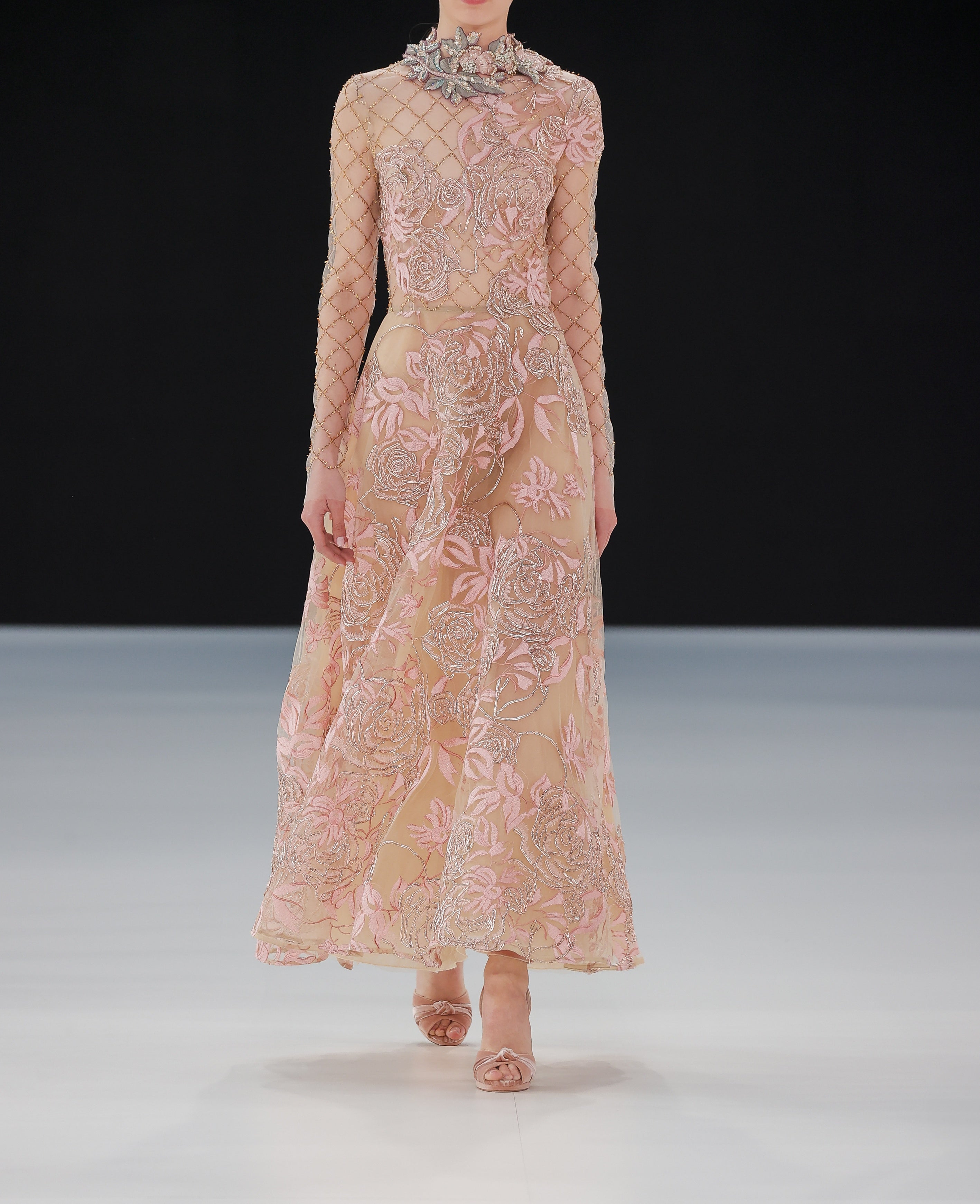 A long-sleeved, floor-length gown with intricate pink rose embroidery and a jeweled high neckline. The dress features a nude underlay with a sheer overlay adorned with a delicate lattice pattern of gold beads.