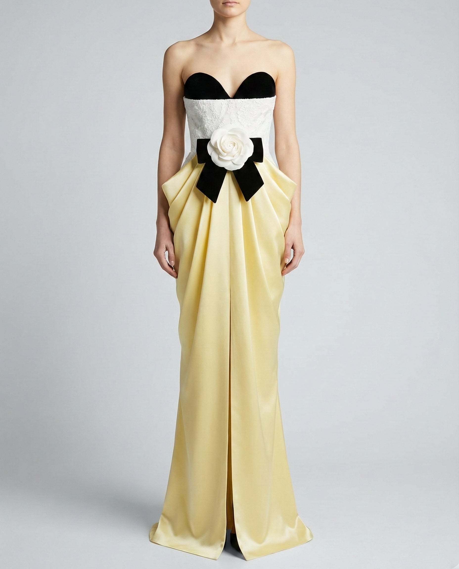 Elegant strapless gown featuring a sweetheart neckline, lace bodice, an oversized rose detail, and a draped yellow skirt with a center slit.