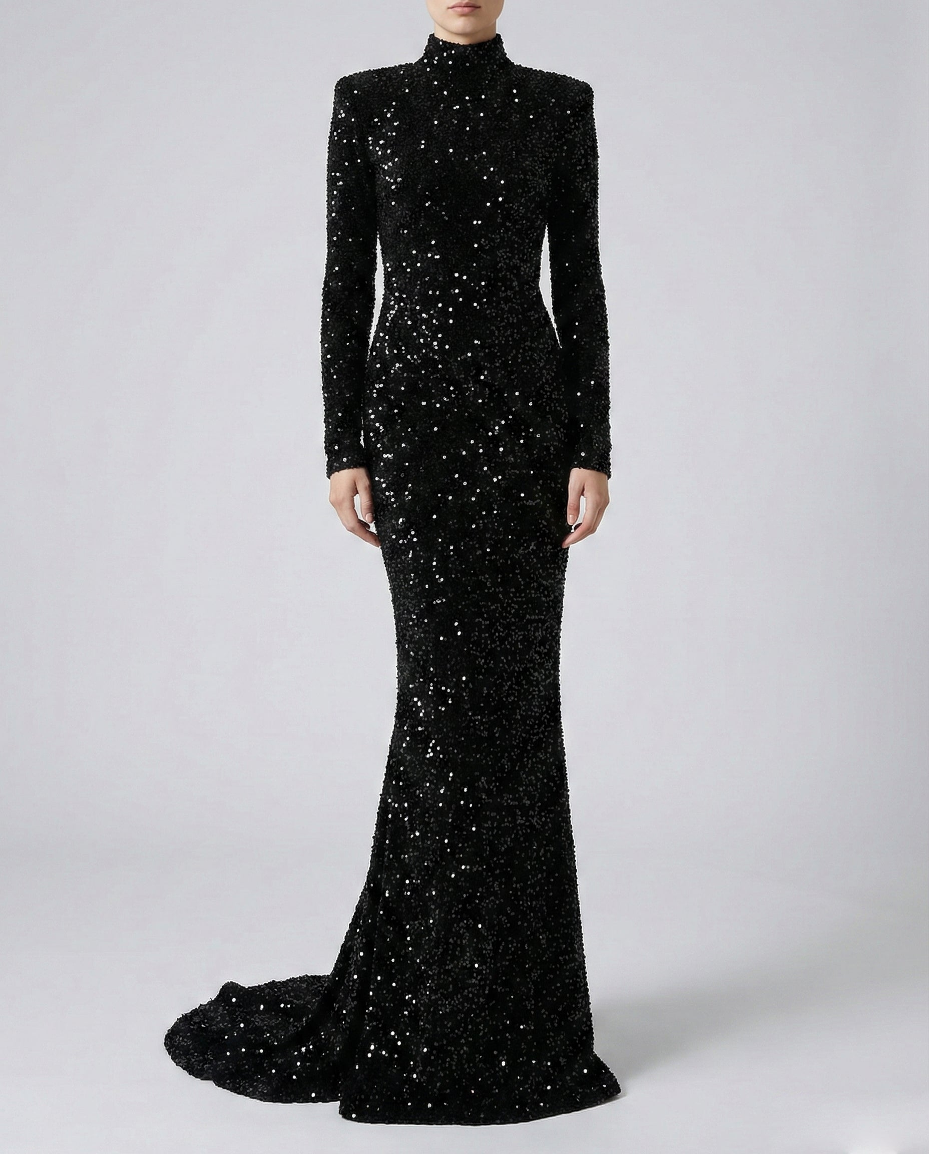 - Long-sleeved sequin gown with a fitted silhouette and a dramatic train.